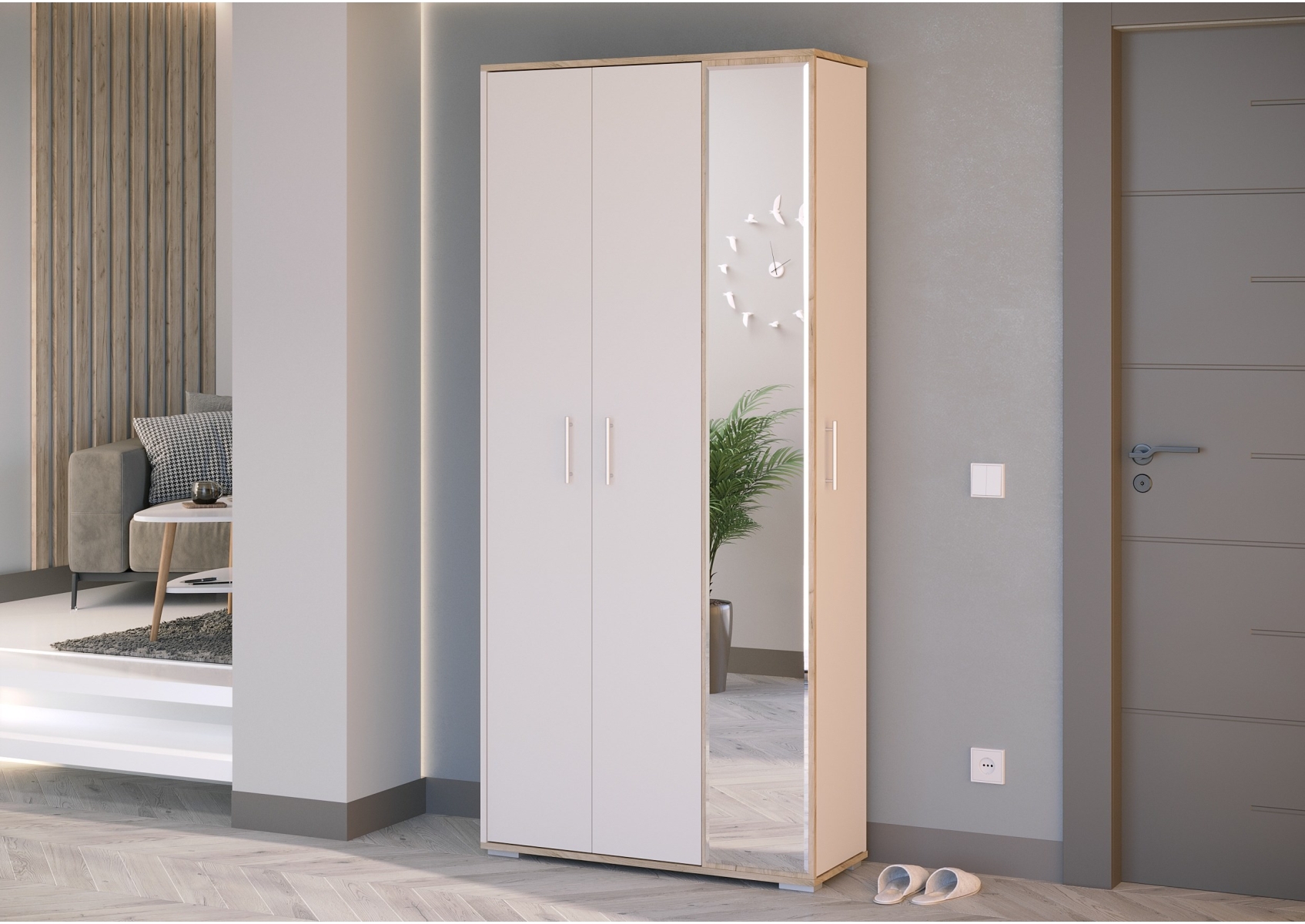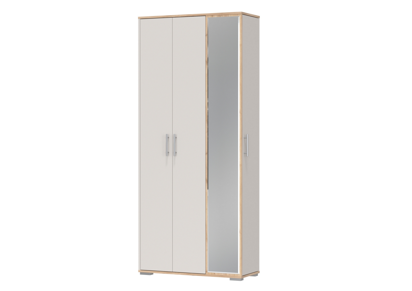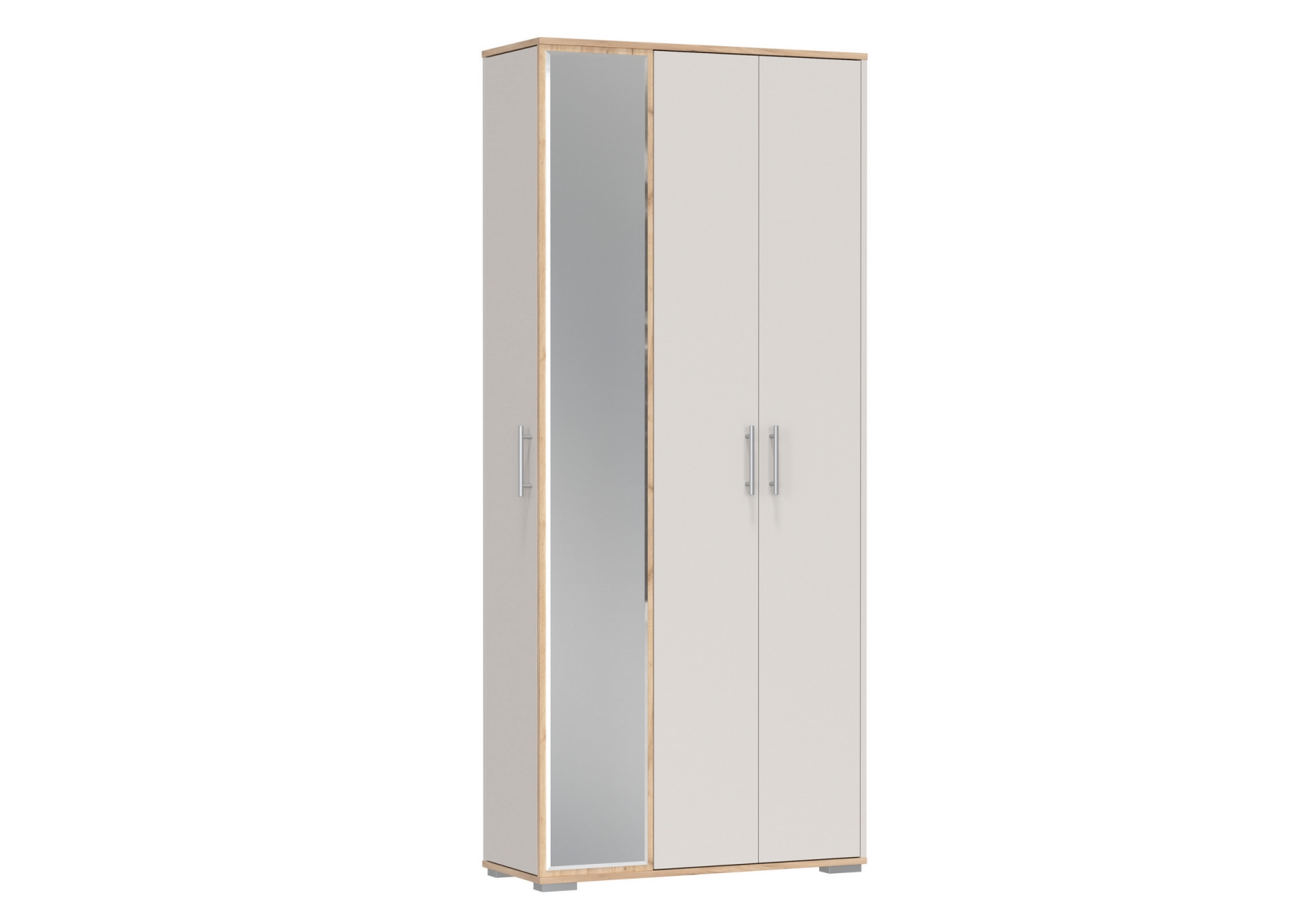 Прихожая Домино-мини 2-3421. Цвет - дуб крафт золотой/кашемир серый. Габариты (ШхГхВ) 88х36х202 см. Компактная и вместительная прихожая состоит из шкафа для одежды, шкафа с полками и большого зеркала, украшающего фасад. Шкаф для одежды оборудован НЕ выдвижной штангой для вешалок, антресольной полкой и нижней полкой. Торцевой шкаф с 7 полками.