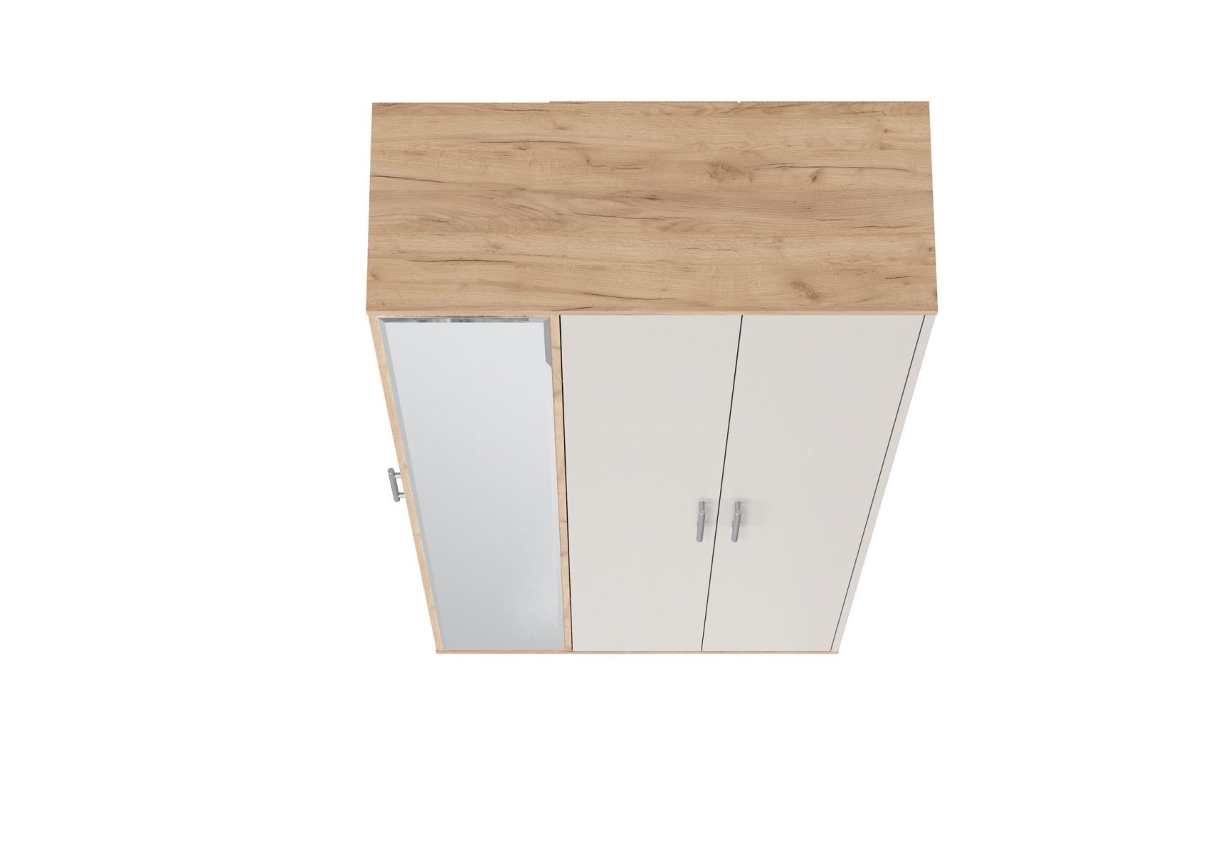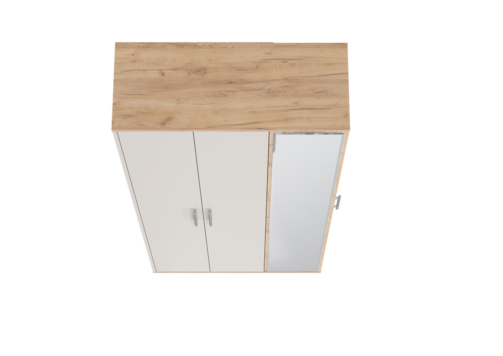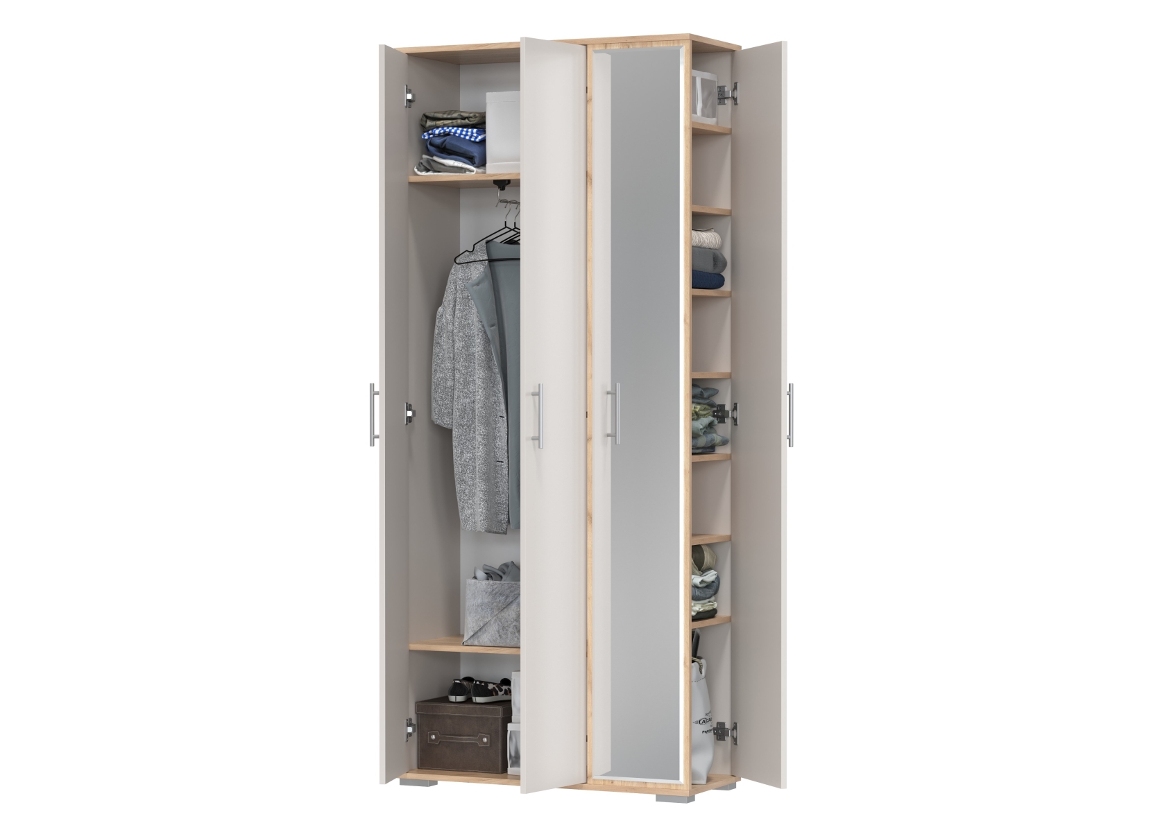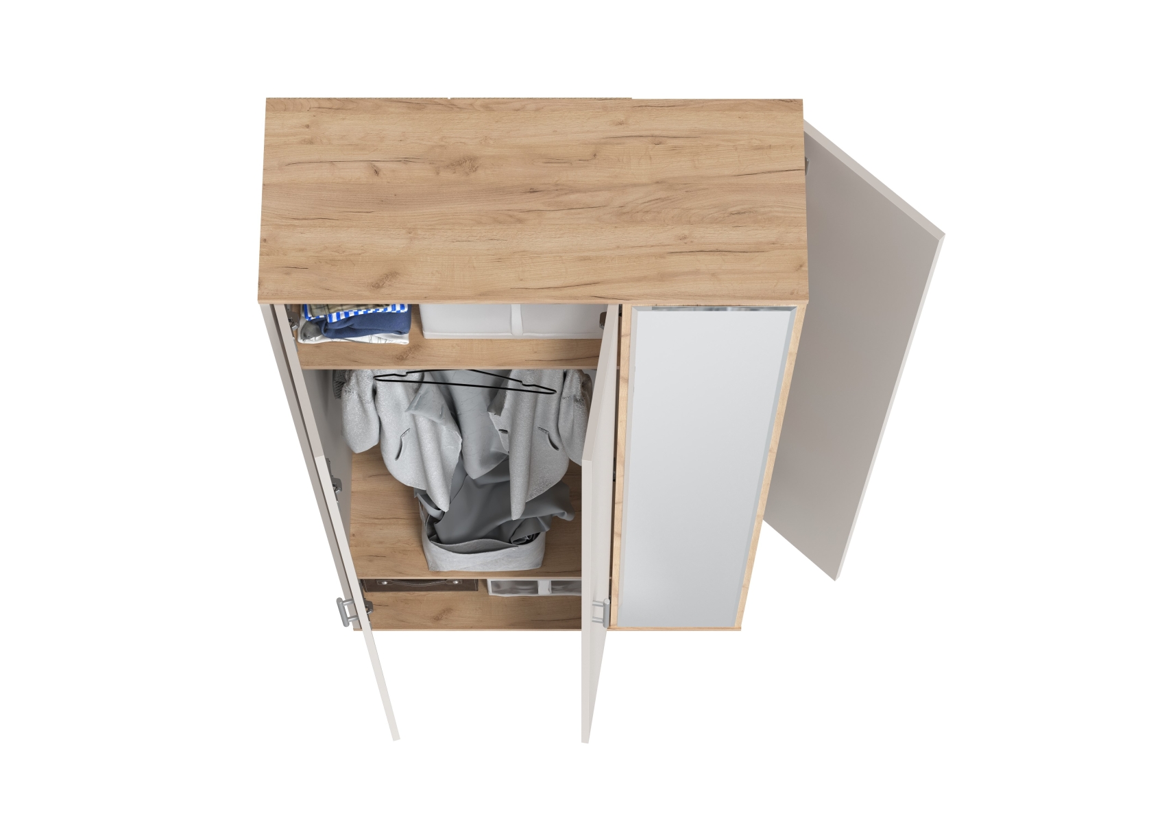Прихожая Домино-мини 2-3421. Цвет - дуб крафт золотой/кашемир серый. Габариты (ШхГхВ) 88х36х202 см. Компактная и вместительная прихожая состоит из шкафа для одежды, шкафа с полками и большого зеркала, украшающего фасад. Шкаф для одежды оборудован НЕ выдвижной штангой для вешалок, антресольной полкой и нижней полкой. Торцевой шкаф с 7 полками.