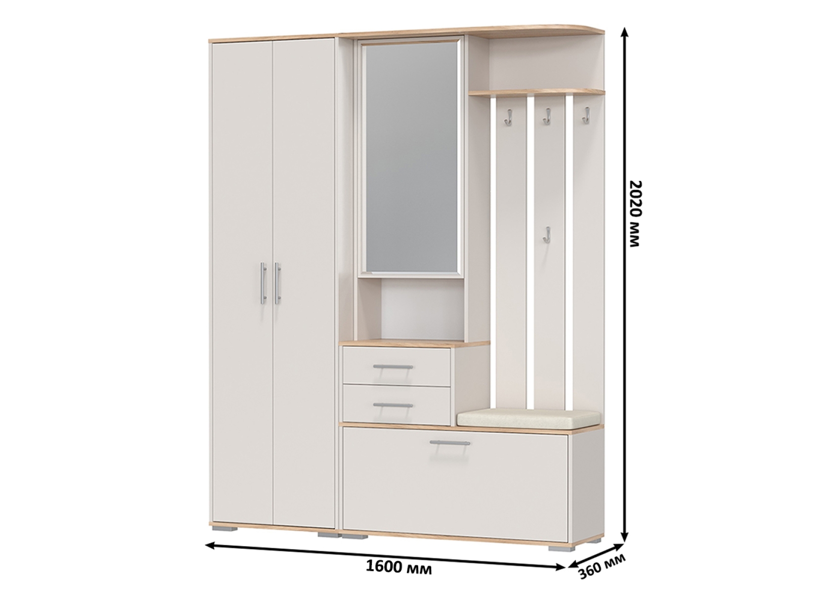 Комплект для прихожей Домино 2-3430+2-3431. Цвет - дуб крафт золотой/кашемир серый. Габариты (ШхГхВ) 160х36х202 см. Данная модель гармонично сочетает в себе распашной шкаф, открытую вешалку, шкаф с зеркальной дверкой, тумбу для обуви и банкетку. Такой тандем украсит Вашу прихожую, поможет с комфортом разместить обувь, одежду, прихорошиться перед выходом из дома и удобно переобуться.