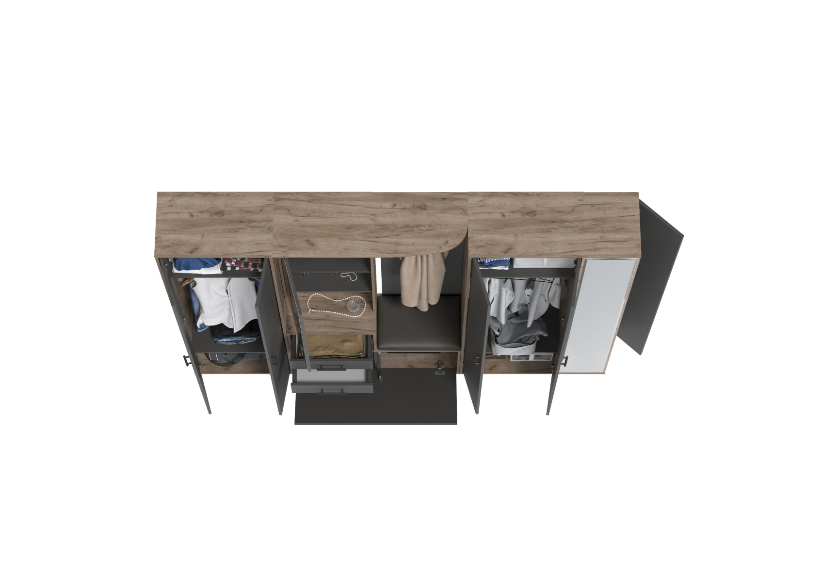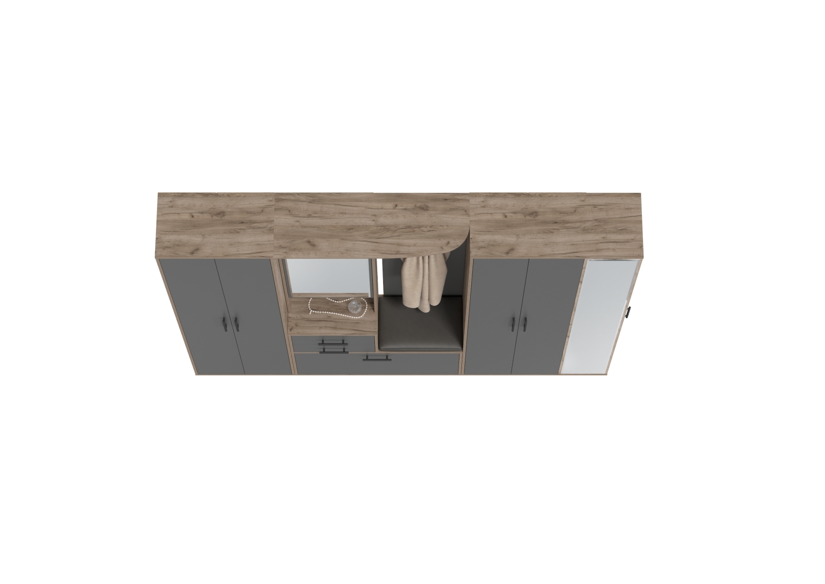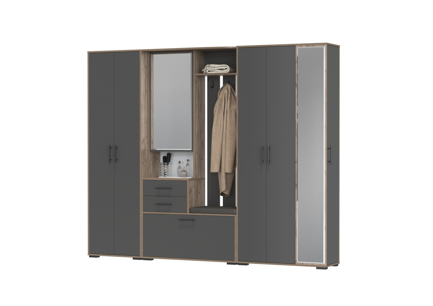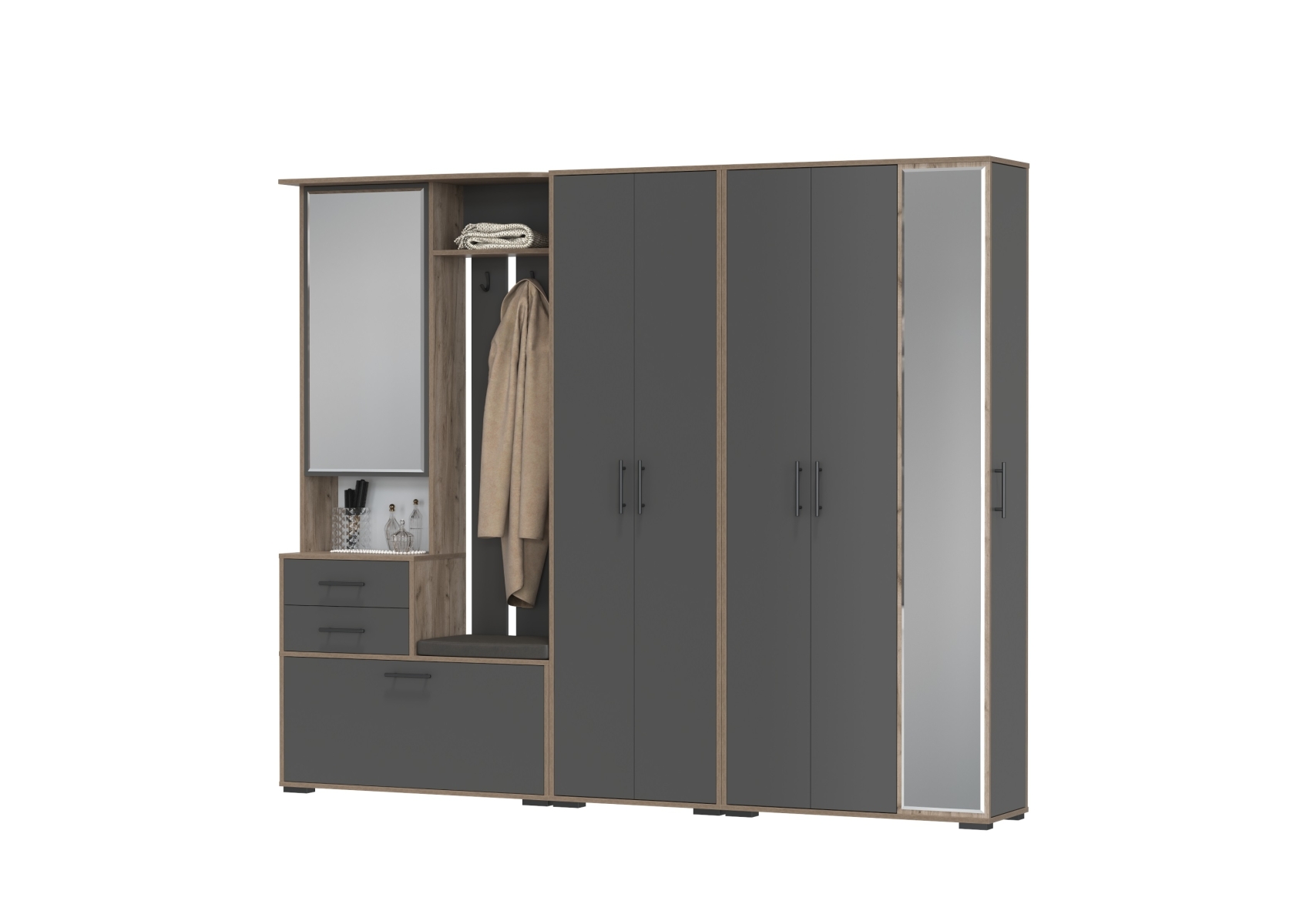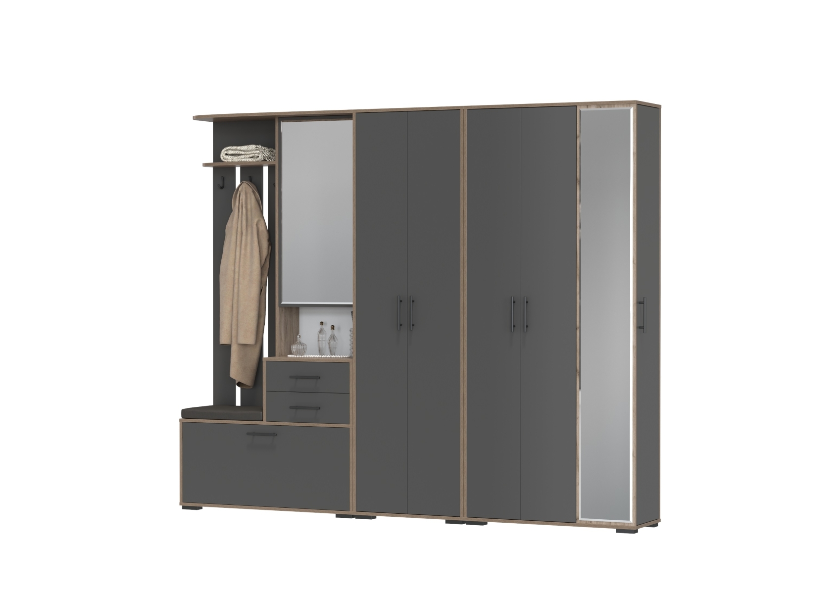 Прихожая с мягким сиденьем со шкафом для одежды и мини-прихожая Домино. Цвет - дуб крафт табачный/графит. Габариты (ШхГхВ) 248х36х202 см. Комплектация состоит из двухсторчатого шкафа, шкафа с зеркалом в полный рост и комбинированного блока. Универсальное решение, которое сочетает функциональность и элегантный дизайн.