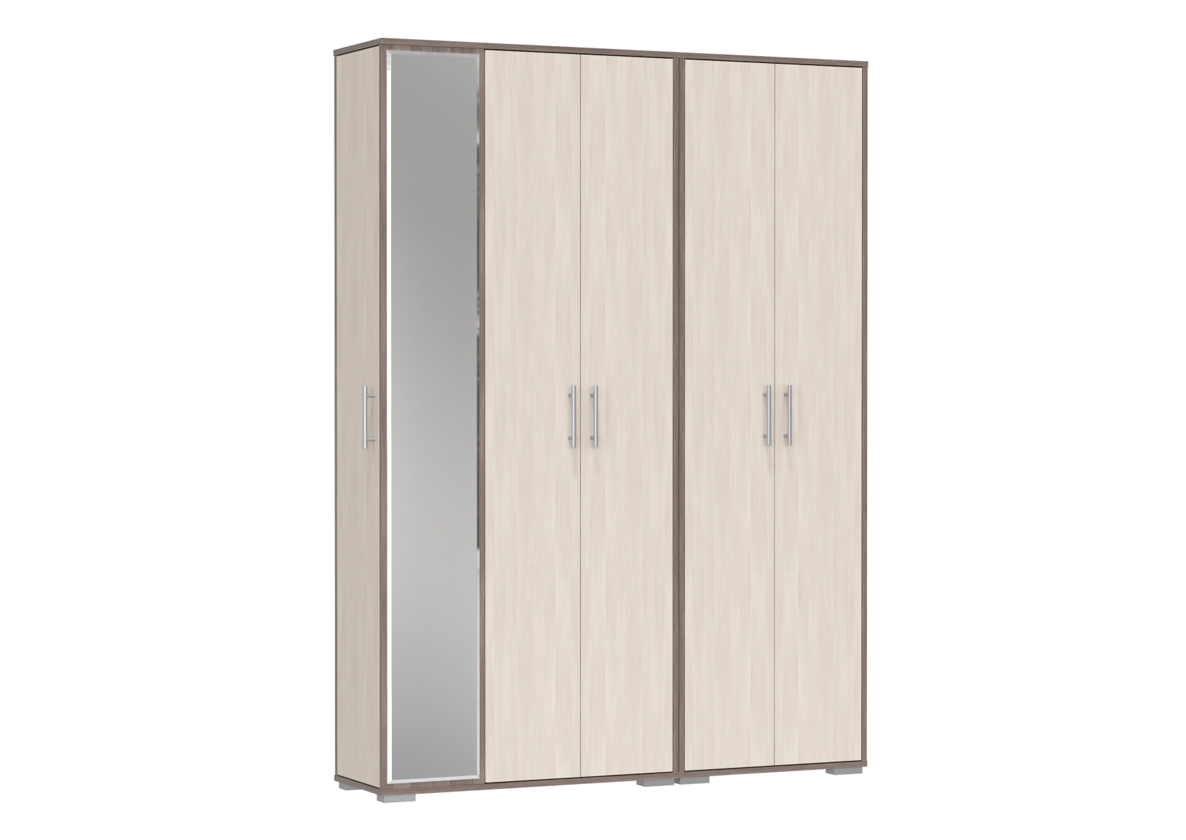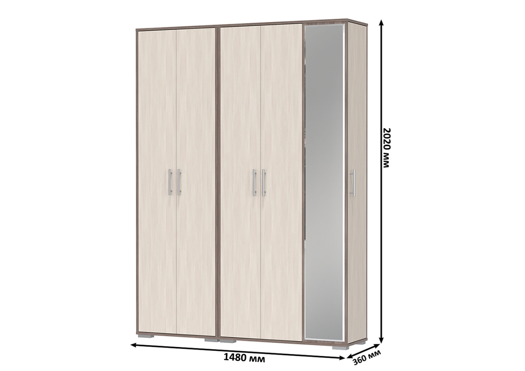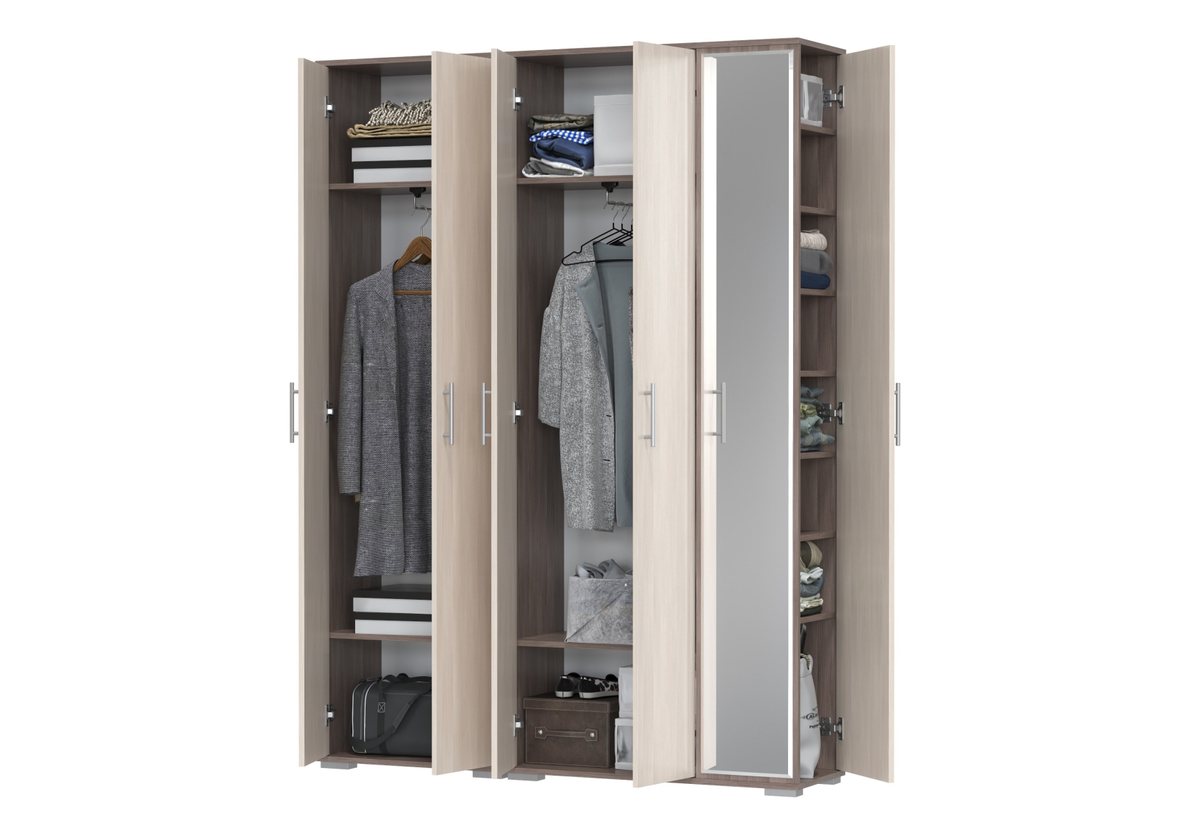Модульная прихожая Домино-мини и шкаф для одежды Домино. Цвет - бодега тёмный/бодега светлый. Габариты (ШхГхВ) 148х36х202 см. Шкаф оборудован штангой для вешалок, антресольной полкой для головных уборов и нижней полкой, выделяющей нишу для обуви. Шкаф с зеркалом в полный рост состоит из отделения для одежды, отделения с полками и большого зеркала, украшающего фасад.