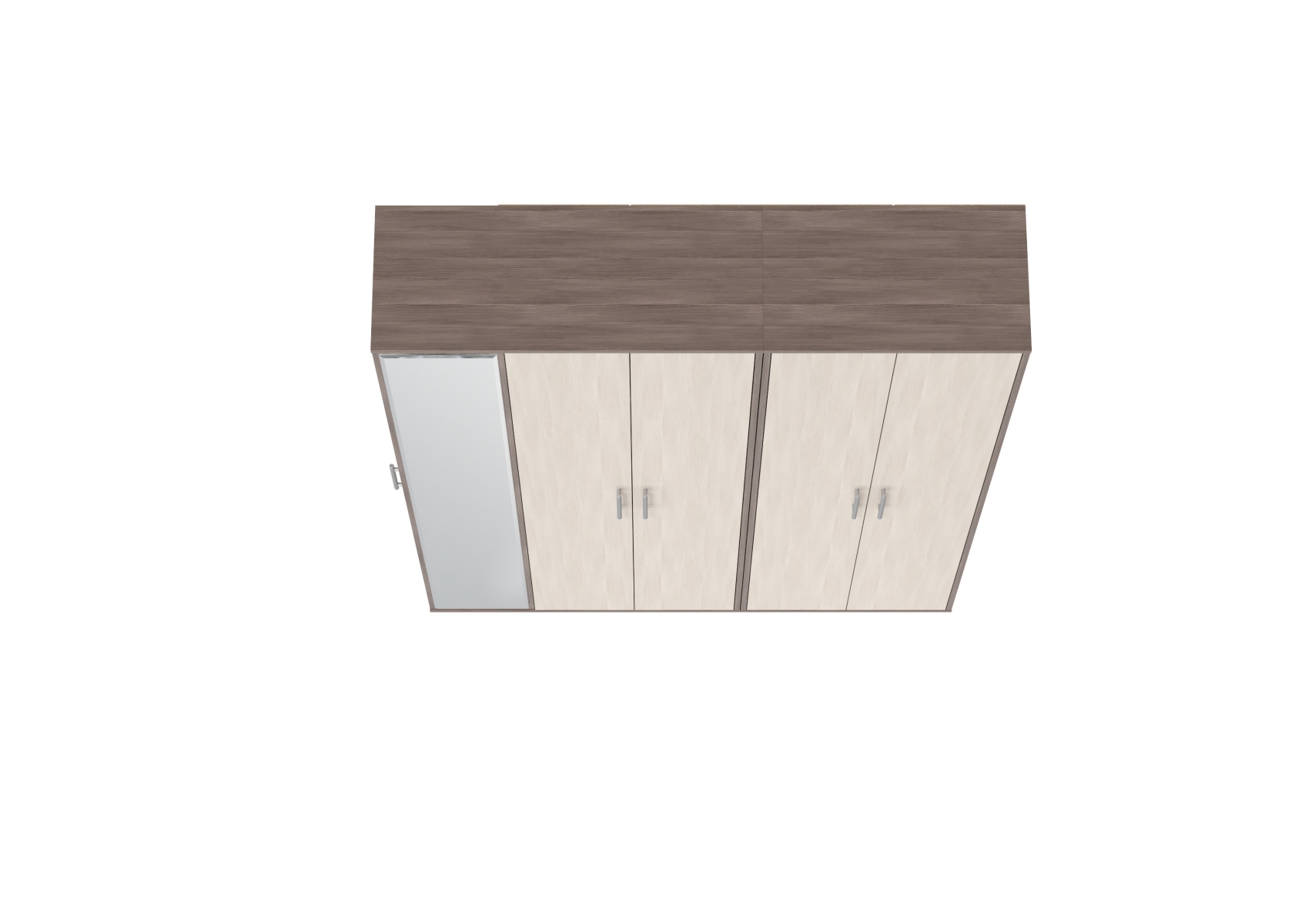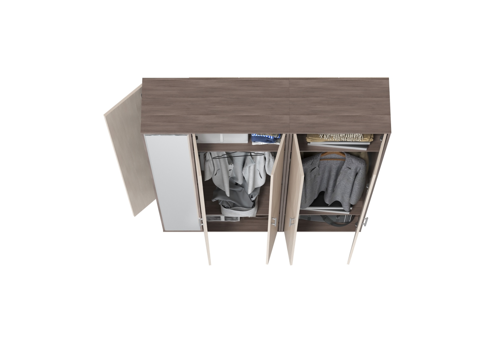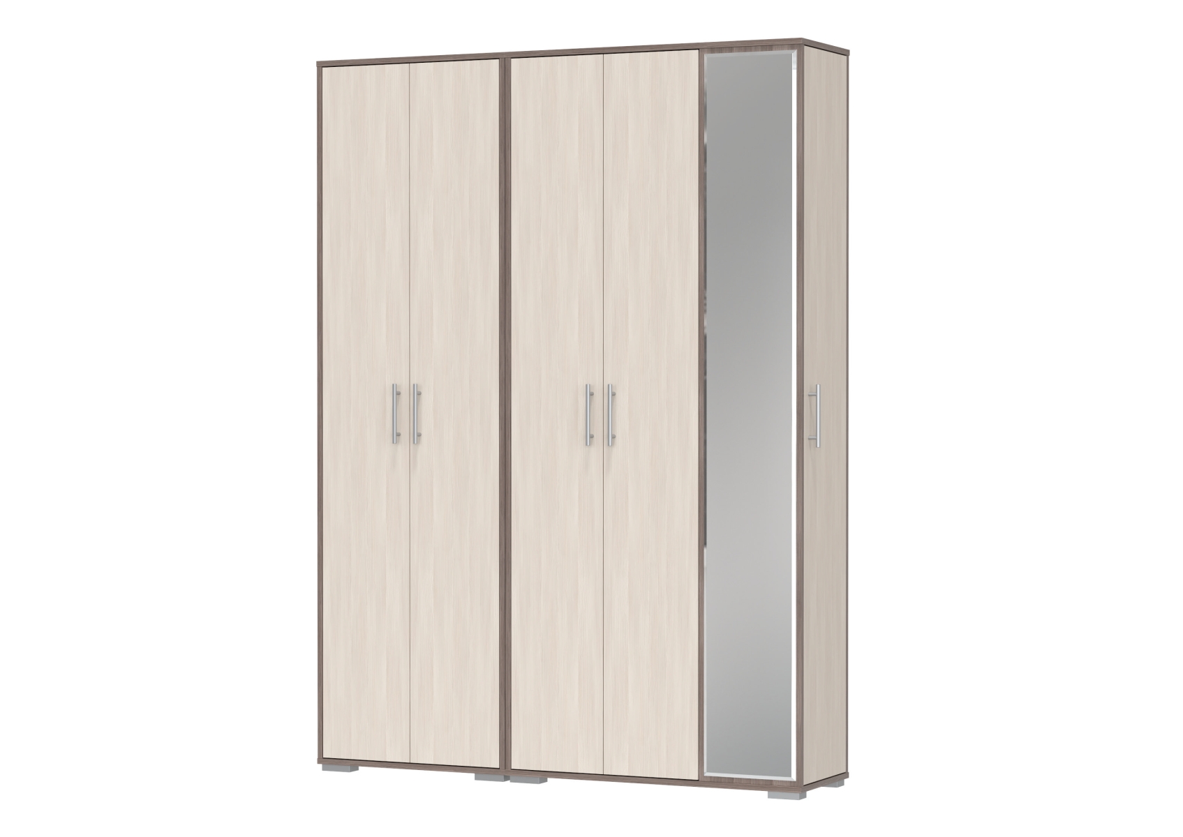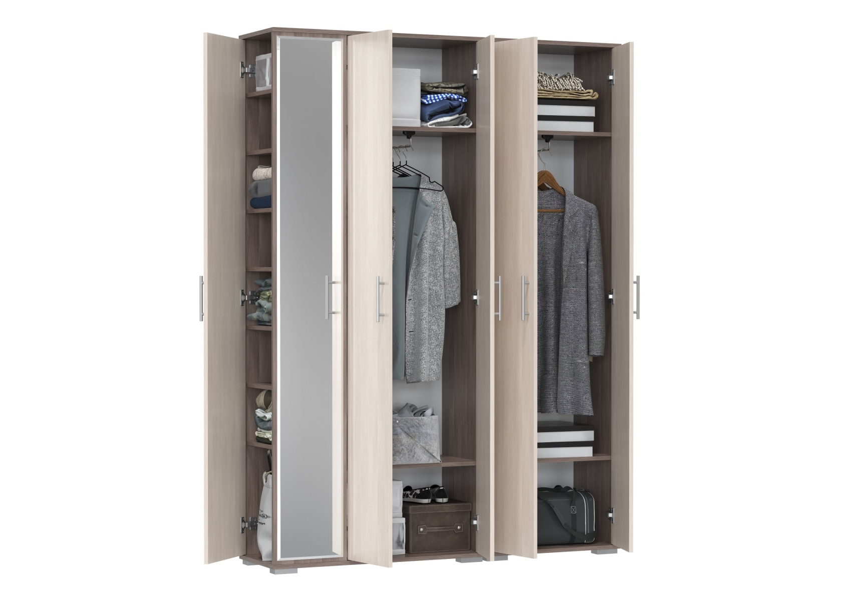 Модульная прихожая Домино-мини и шкаф для одежды Домино. Цвет - бодега тёмный/бодега светлый. Габариты (ШхГхВ) 148х36х202 см. Шкаф оборудован штангой для вешалок, антресольной полкой для головных уборов и нижней полкой, выделяющей нишу для обуви. Шкаф с зеркалом в полный рост состоит из отделения для одежды, отделения с полками и большого зеркала, украшающего фасад.
