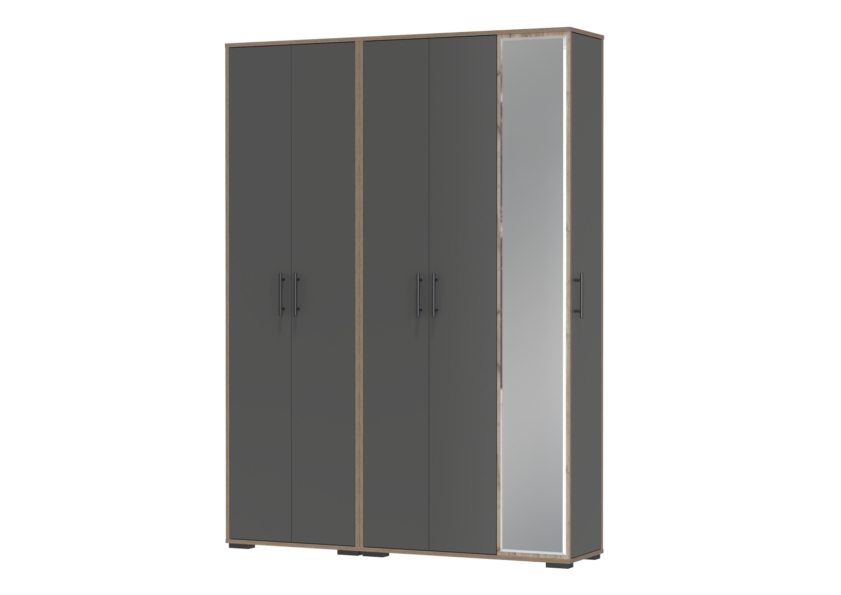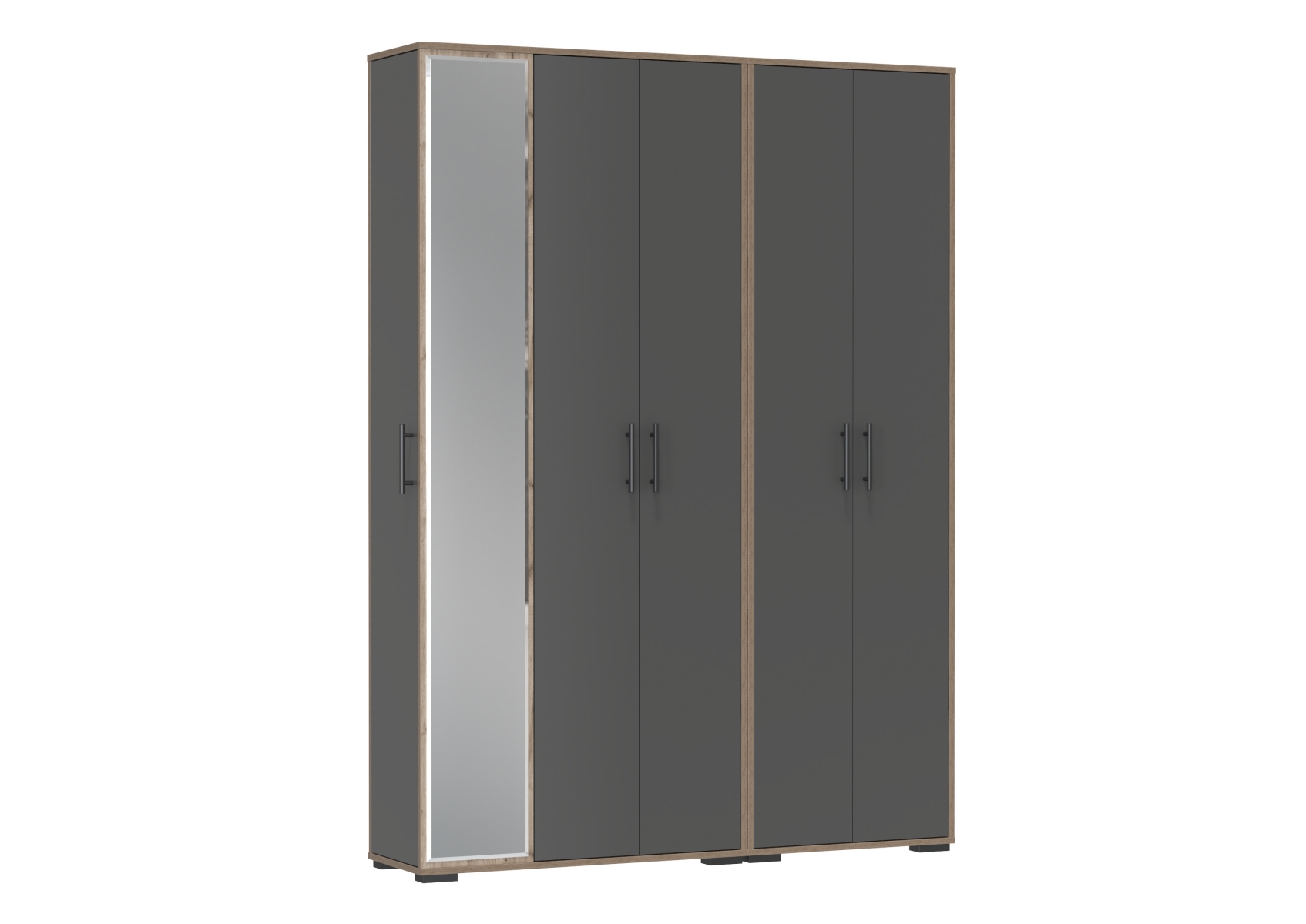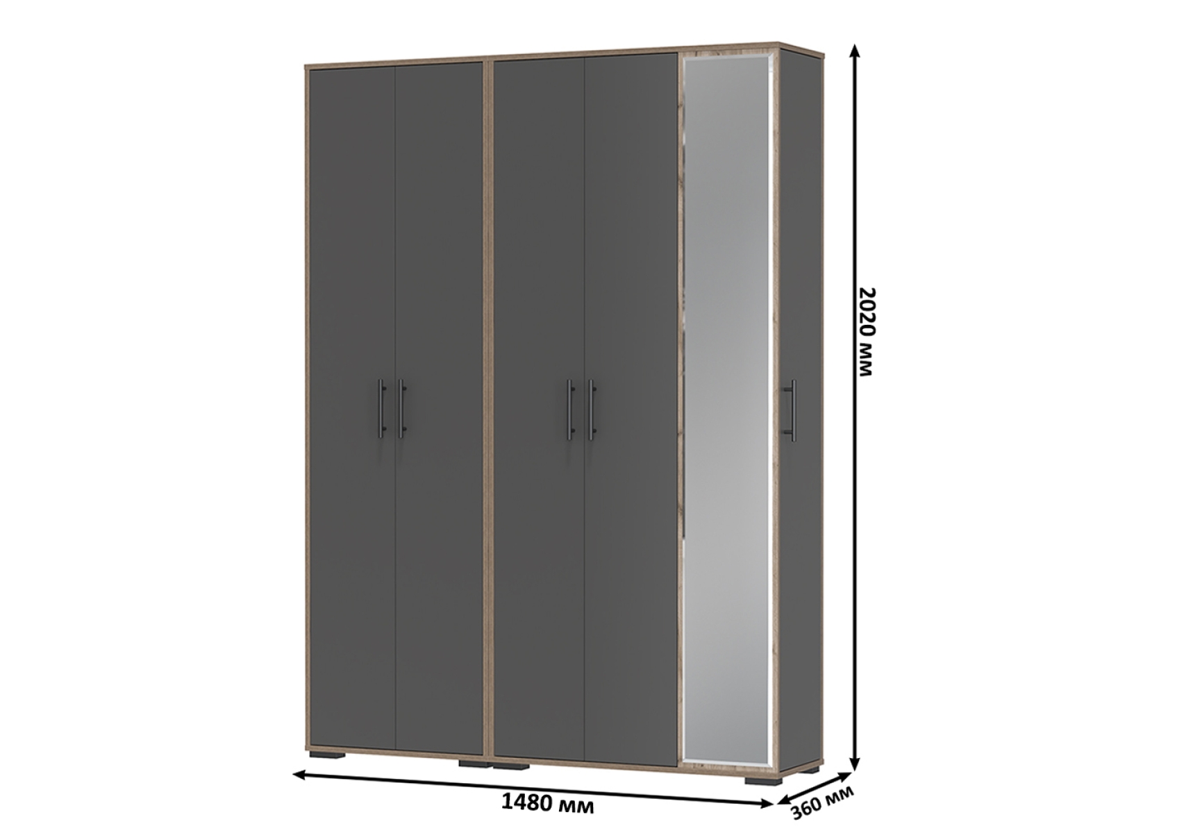 Прихожая Домино-мини + Шкаф для одежды Домино. Цвет - дуб крафт табачный/графит. Габариты (ШхГхВ) 148х36х202 см. Шкаф оборудован штангой для вешалок, антресольной полкой для головных уборов и нижней полкой, выделяющей нишу для обуви. Шкаф с зеркалом в полный рост состоит из отделения для одежды, отделения с полками и большого зеркала, украшающего фасад.