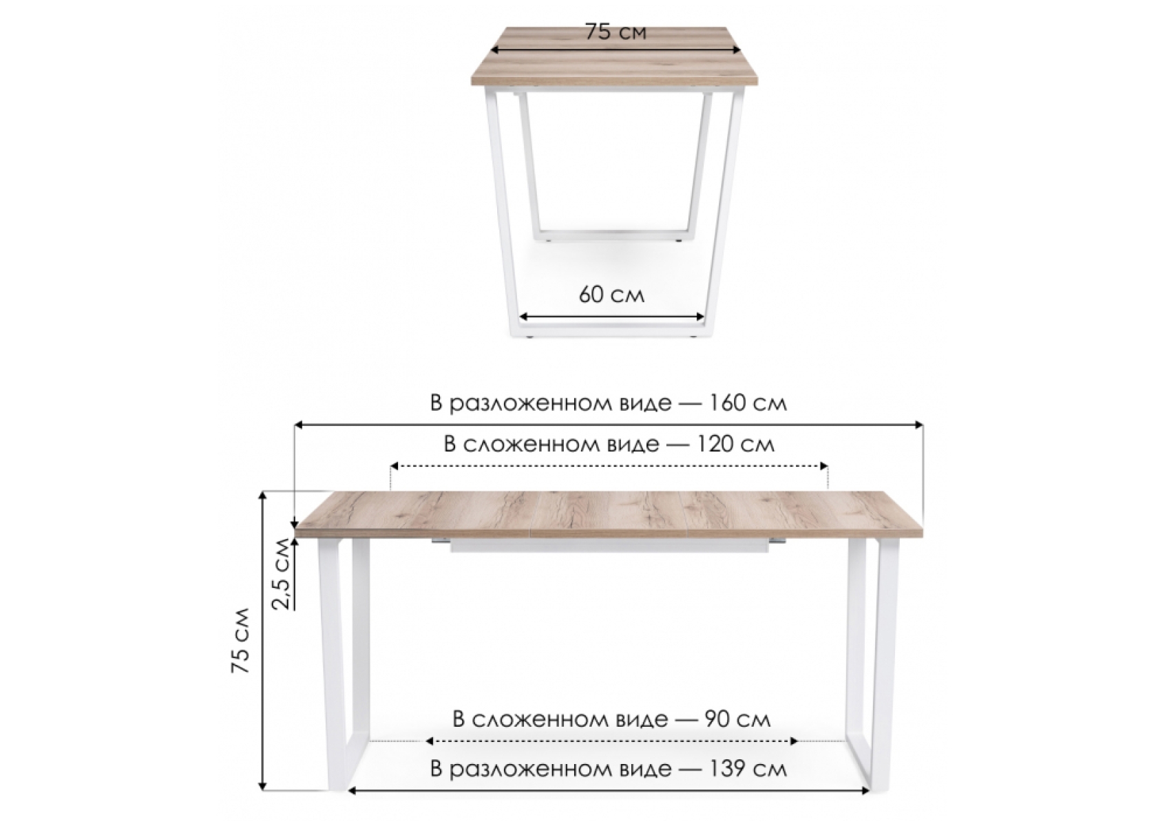 Стол раскладной Лота Лофт 120(160)х75х75 25 мм дуб делано светлый / матовый белый