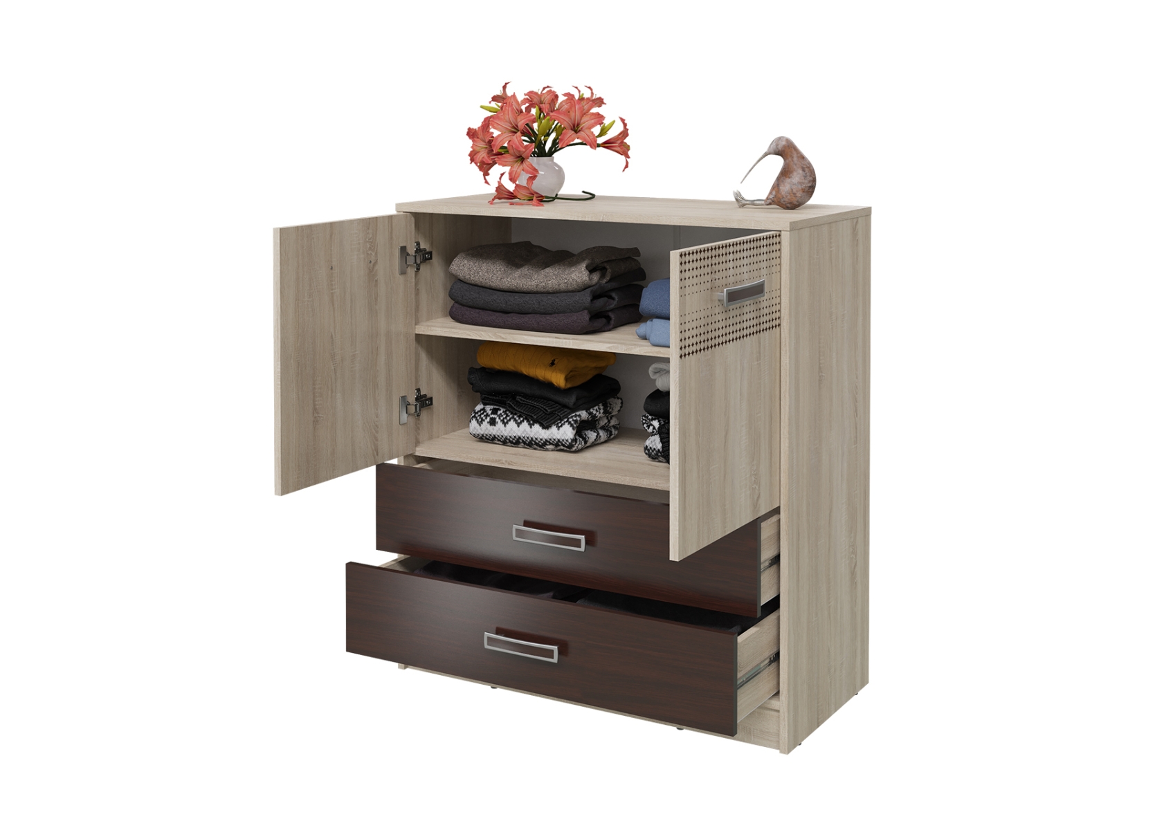 Комод с дверками и ящиками. Модель комода - Румба 4-0924. Цвет - дуб сонома/венге. Размер (ШхГхВ) 90х43х100 см. Стильный комод с двумя широкими выдвижными ящиками и отделением с полочкой за распашными дверками - удобная комбинированная модель для хранения вещей и одежды.