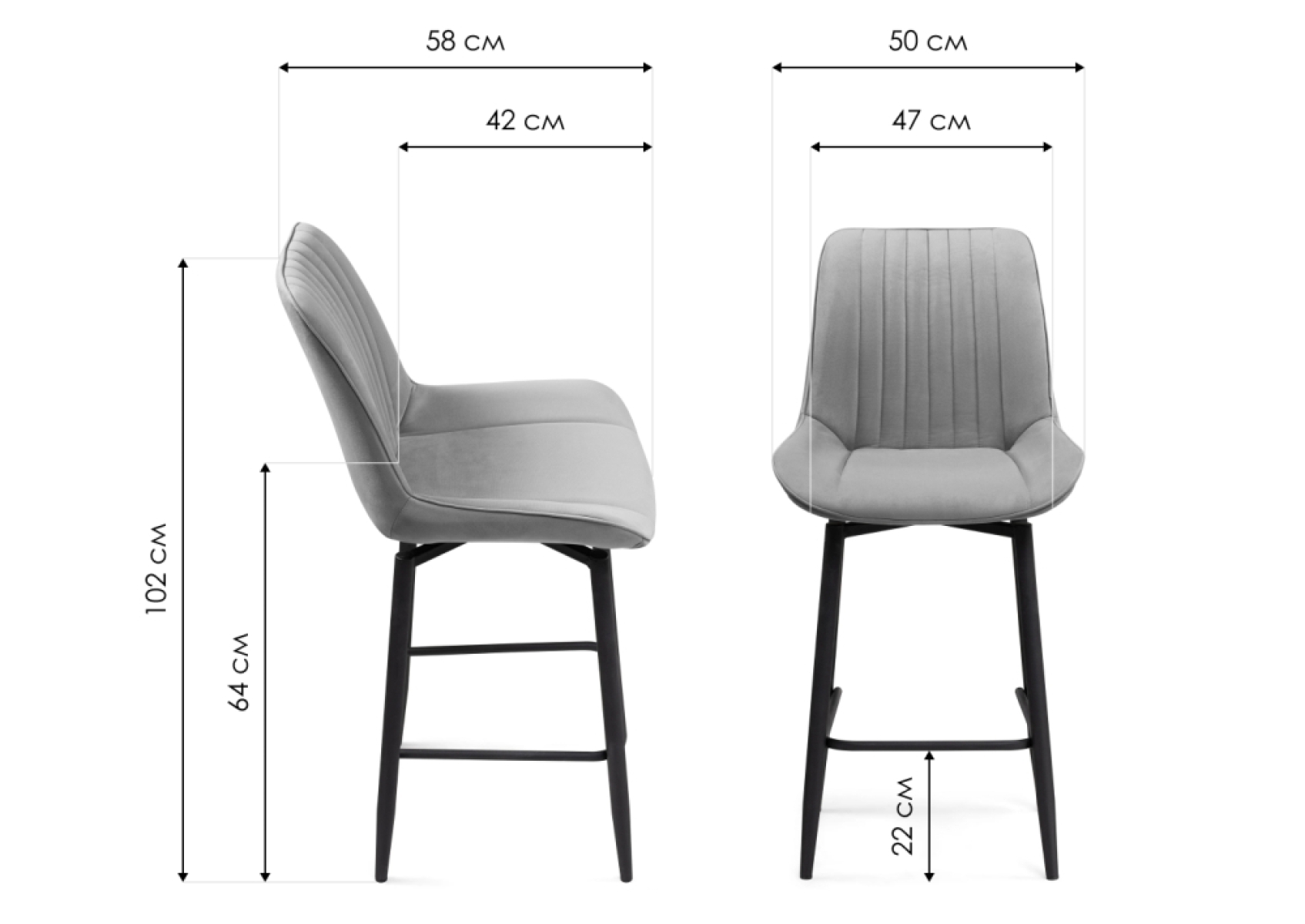 Полубарный стул Седа - идеальное решение для создания стильного и функционального интерьера в вашем доме или офисе! Каркас стула выполнен из прочного металла, покрытого порошковой краской, что делает его устойчивым к воздействию внешних факторов и обеспечивает долговечность использования. Обивка сиденья и спинки выполнена из износостойкого велюра, который выглядит роскошно и приятен на ощупь. Высота стула составляет 102 см, что делает его идеальным выбором для использования за барной стойкой или высоким столом. Удобная подножка для ног добавляет комфорта и помогает снизить усталость ног. Не упустите шанс приобрести наш полубарный стул Седа" и сделать ваш интерьер более стильным и удобным!"