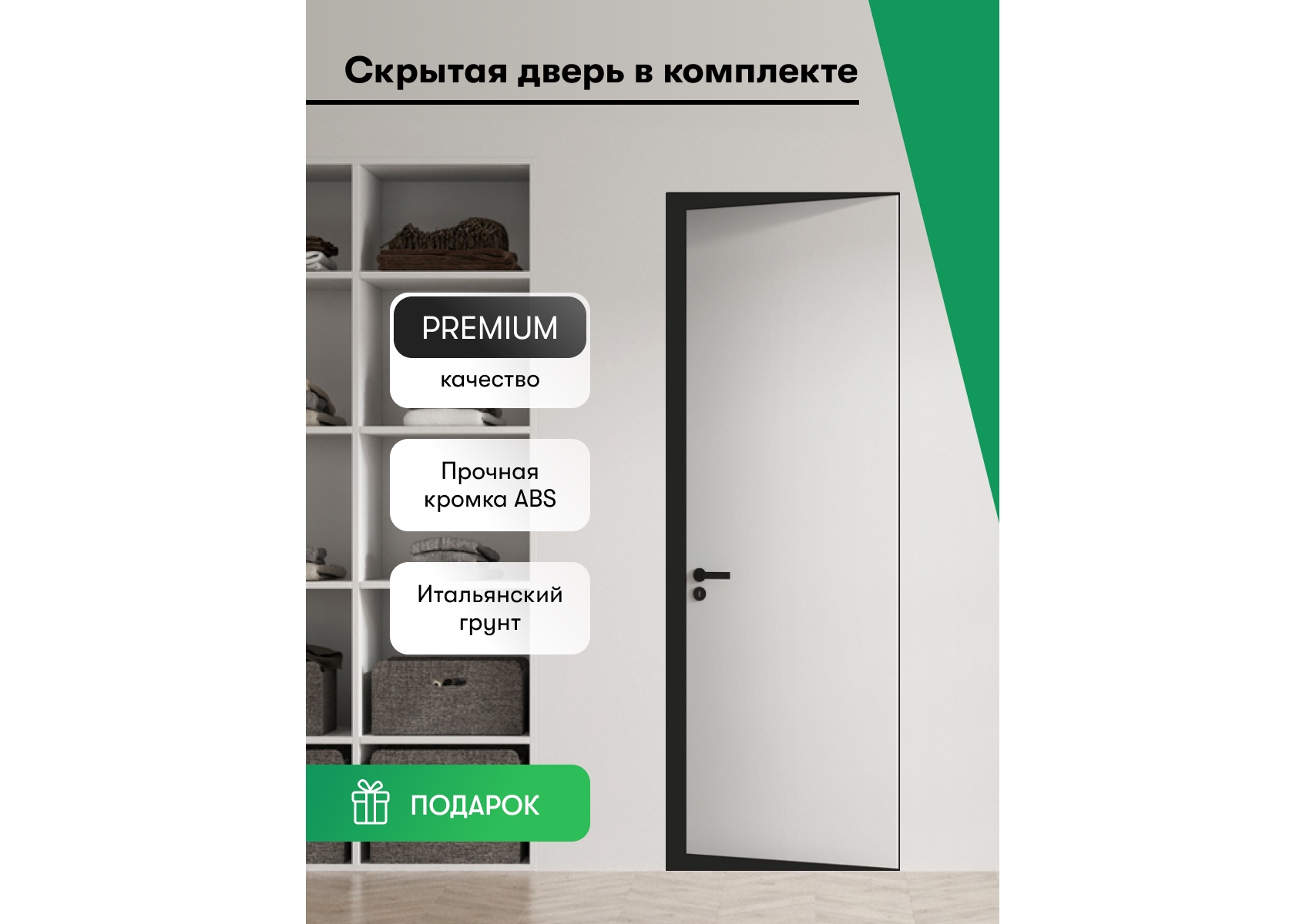 В каждом доме нужно что-то особенное, что будет отличать его от других. Как ключевой элемент интерьера можно использовать креативные двери Invisible Reversкромка ABS. Потайная скрытая конструкция дает возможность воплотить в жизнь самые смелые идеи дизайна. Изысканная композиция, наполненная минимализмом и лофтом, делает данный комплект неповторимым акцентом в вашем интерьере. Отличительной чертой этой системы является скрытая коробка без наличников, создающая эффект невидимой двери. Уплотнитель обеспечивает плотное прилегание к проему, а скрытые петли добавляют шарма и стиля. Рама из немецкого МДФ и LVL бруса гарантирует общую надежность дверного полотна. Прочная кромка из ПВХ пластика предотвращает износ материала, сохраняя первоначальный вид. Монтаж полотна вровень с плоскостью стены создает единую гармоничную поверхность. Одним из достоинств данного отделочного материала является возможность самостоятельного выбора отделки под покраску, так как полотно отделано прозрачным грунтом. Таким образом, цвет и фактура стены будут великолепно сочетаться с дверным полотном, придавая вашему интерьеру завершенный вид. Тщательно продуманный проект строительства требует использования только качественных материалов, поэтому, предлагаемый вам дверной комплект выполнен из деревянных элементов, которые обладают высокой износостойкостью и структурной прочностью. Алюминиевый короб надежно защищает конструкцию от различных внешних воздействий, увеличивая срок службы до более чем 20 лет. Эти уникальные межкомнатные решения объединяют в себе функциональность, надежность и эстетичный вид. Ваш индивидуальный выбор отделки поможет создать интерьер именно вашей мечты.