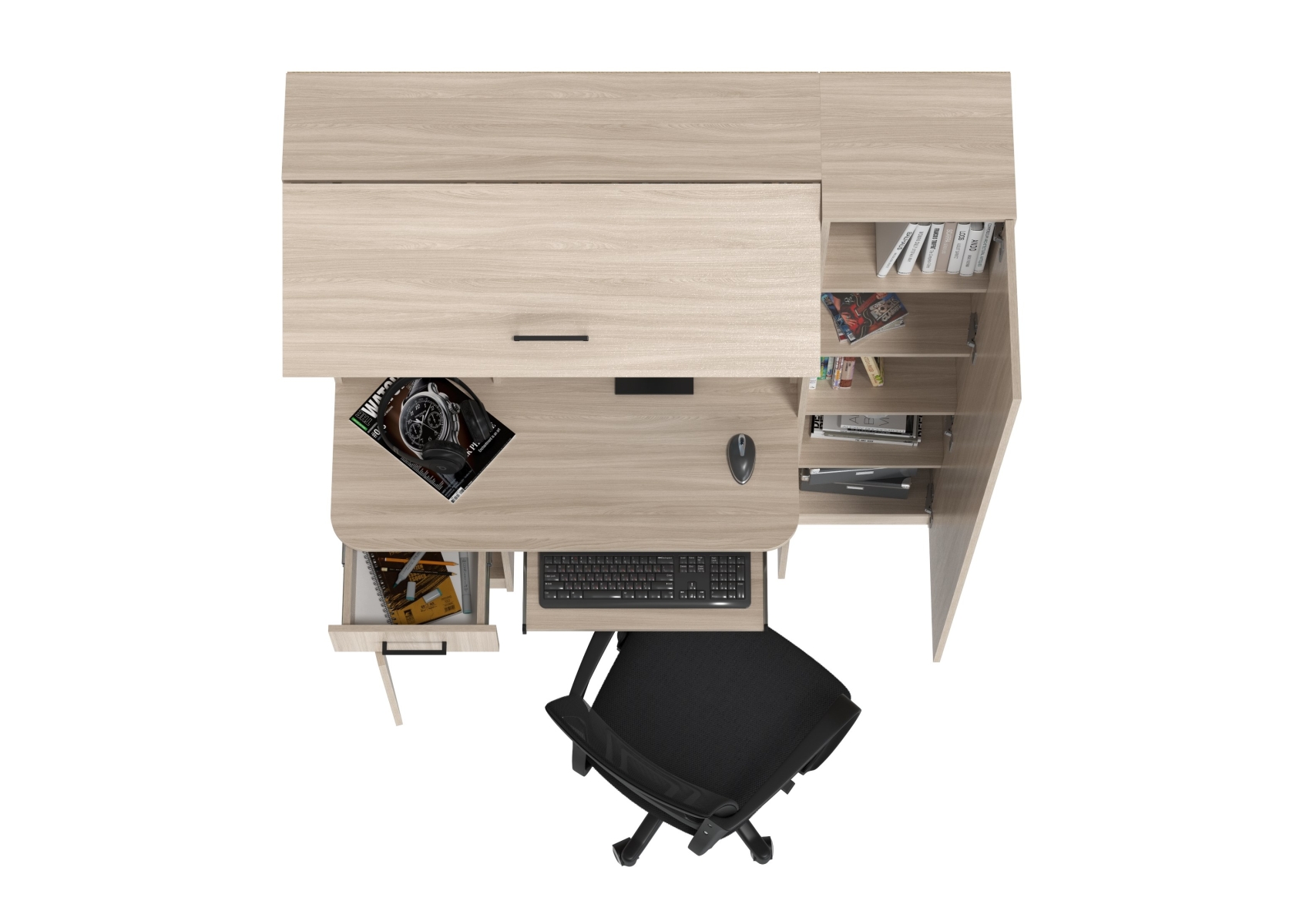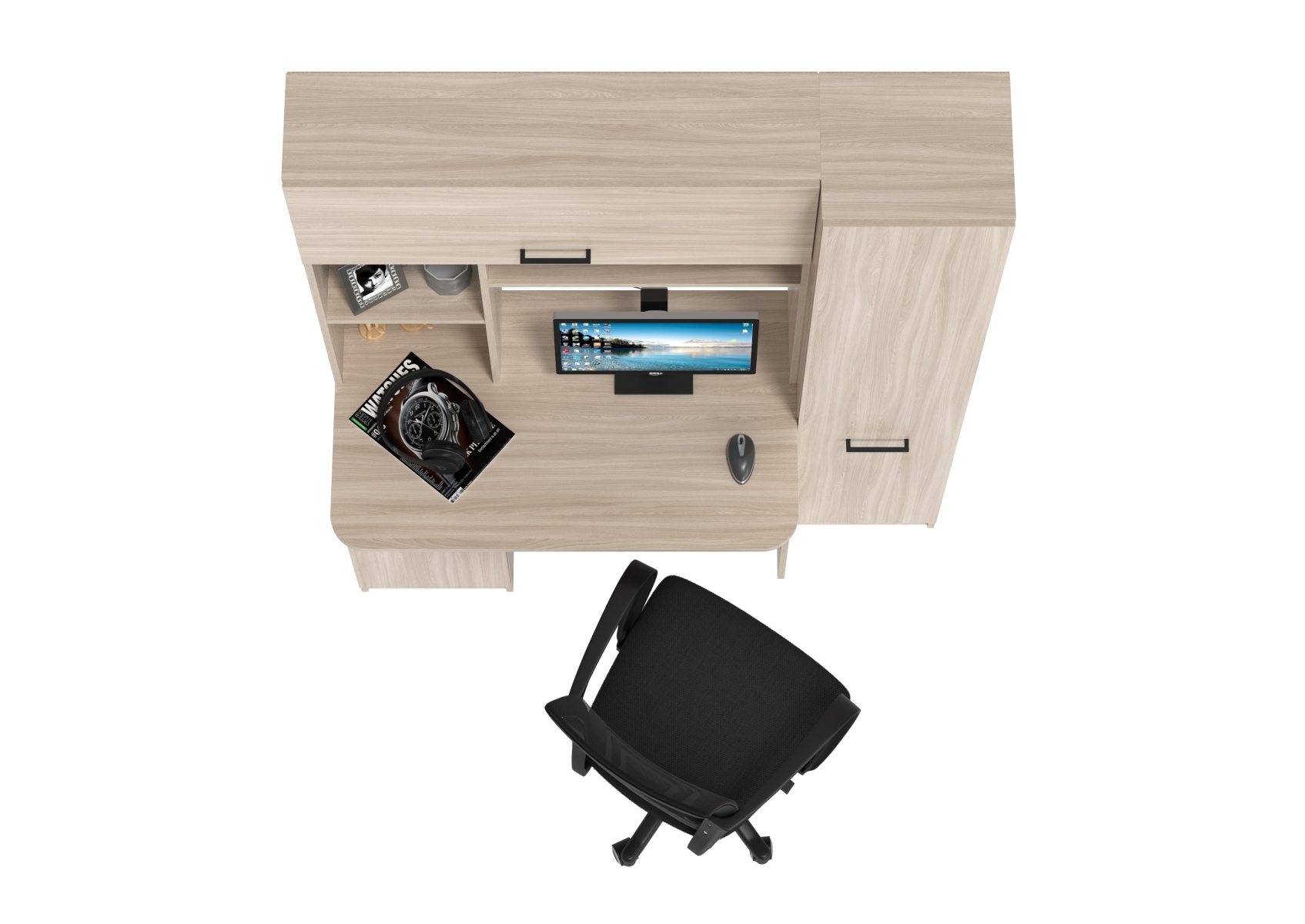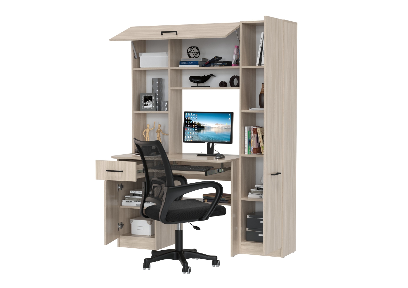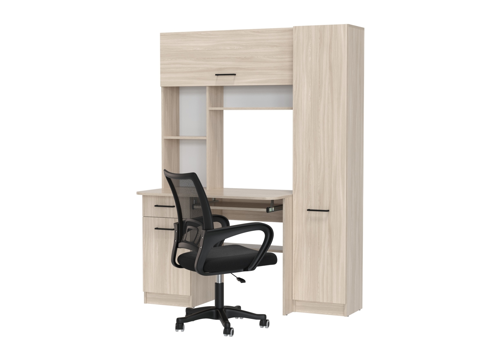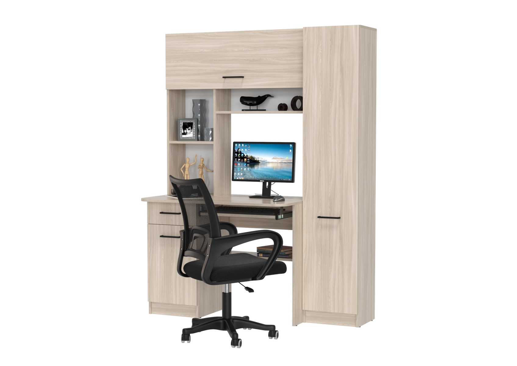 Комплект из компьютерного кресла и компьютерного стола Aльфа кресло чёрное. Цвет - ясень шимо светлый. Габариты - 137х61х181 см. Стол сочетает в себе однотумбовую конструкцию с вместительной надстройкой и пеналом. Кресло с обивкой из дышащей сетки и текстиля обладает мягким сиденьем.