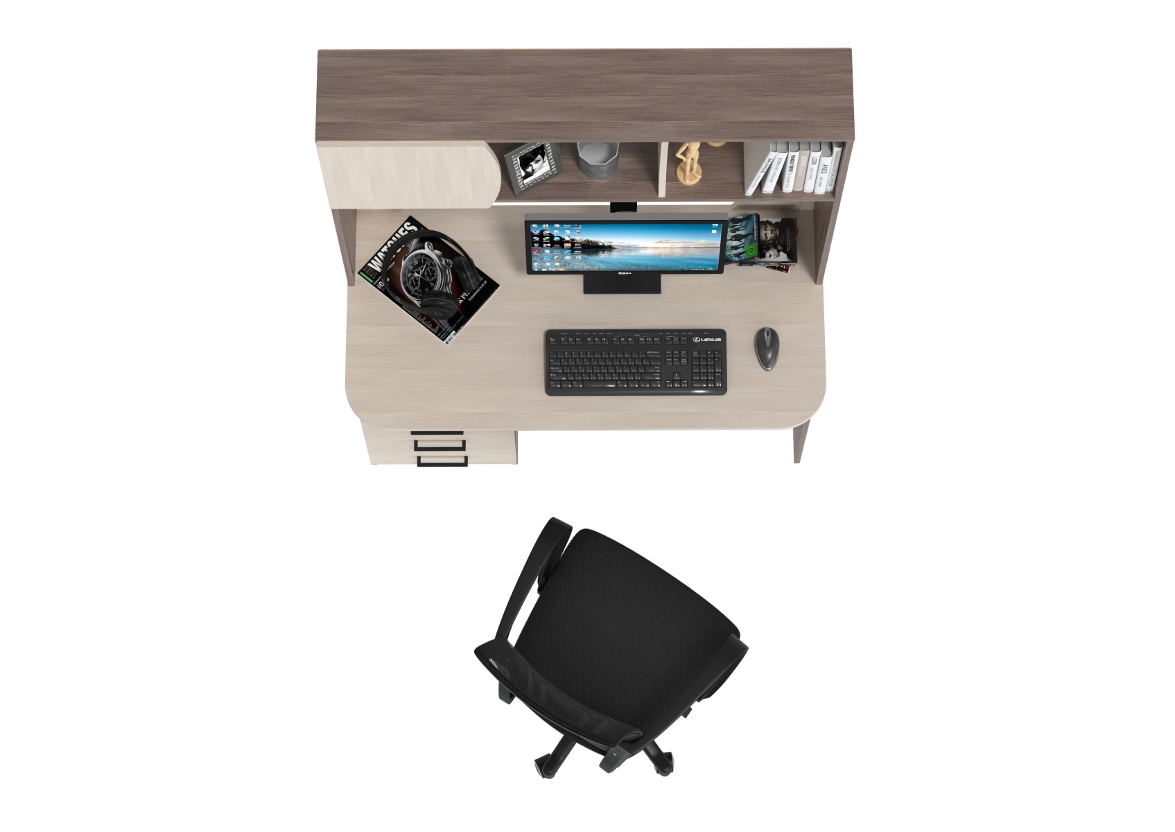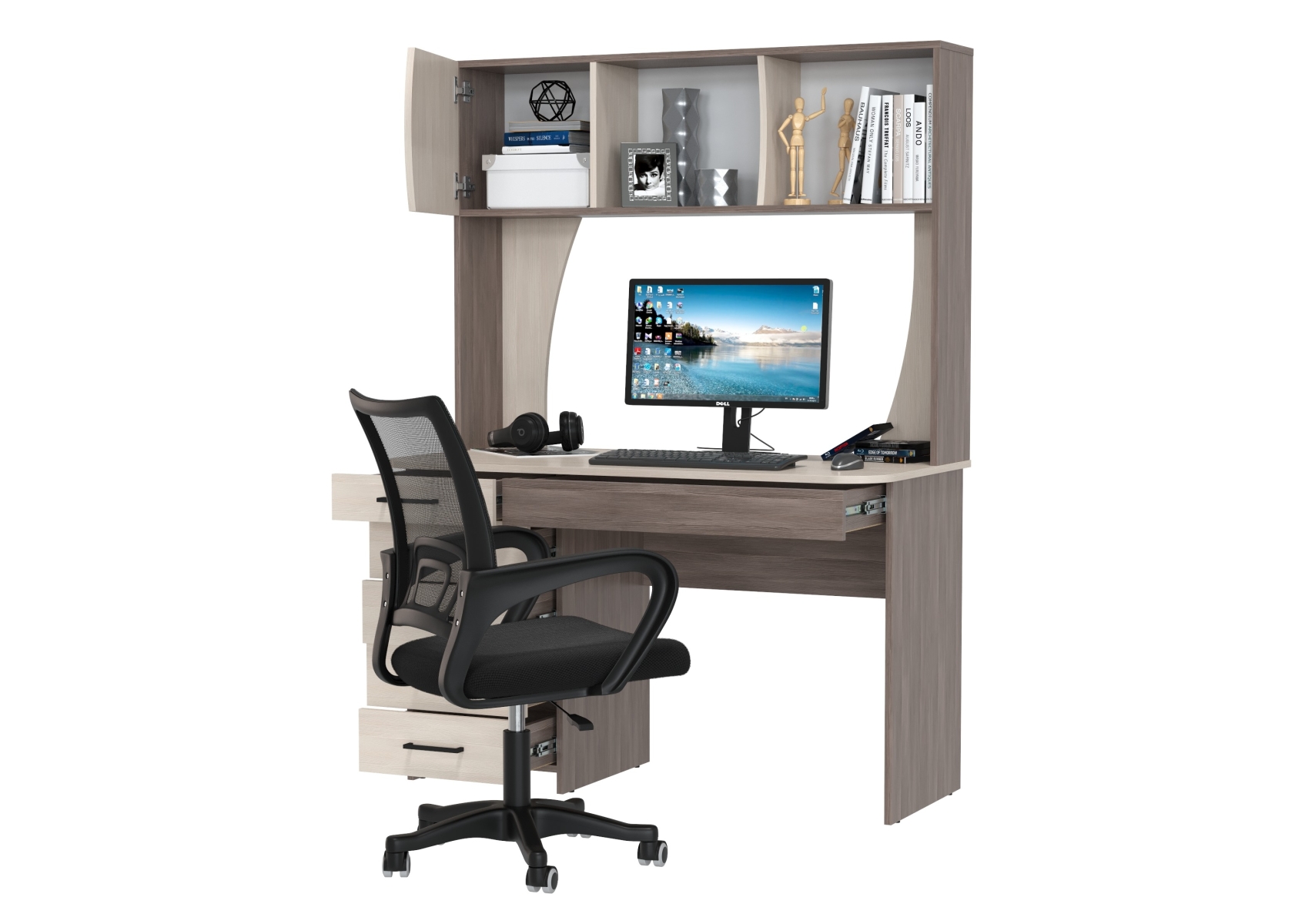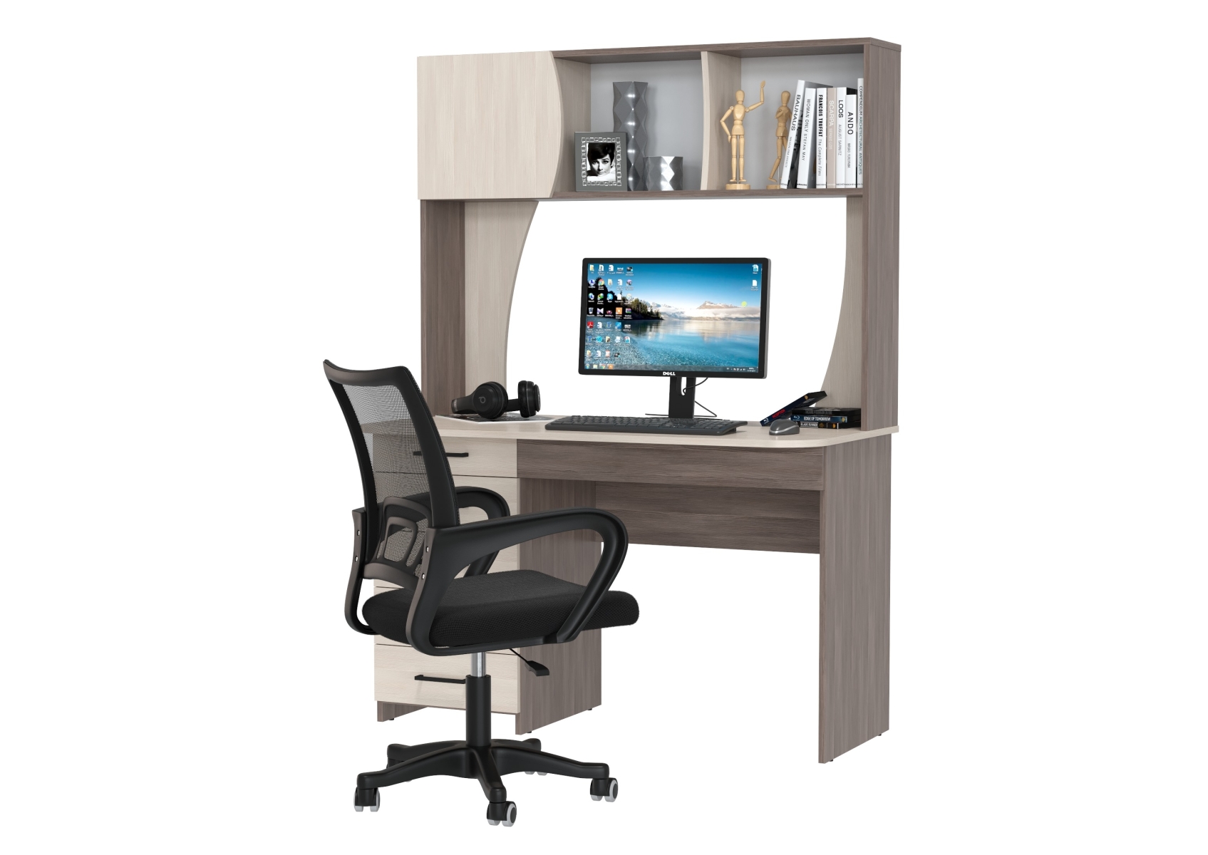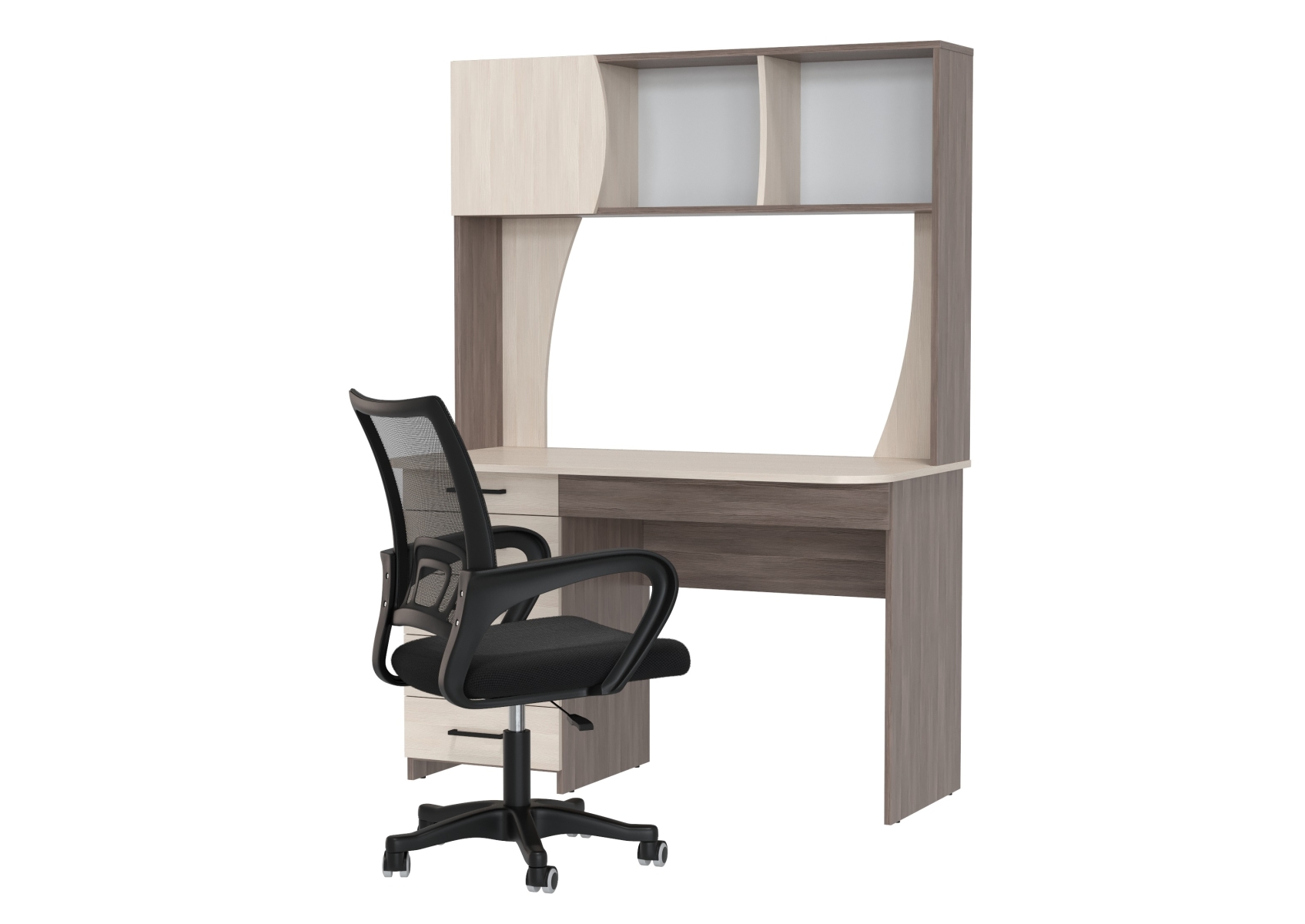 Стол компьютерный с надстройкой Сигма и компьютерное кресло чёрное. Цвет - бодега тёмный/бодега светлый. Габариты - 120,5х60,5х166 см. Удобный и функциональный компьютерный стол Сигма с надстройкой и эргономичное чёрное кресло с дышащей сеткой. Надстройка включает две открытые ниши и одну за распашной дверцей — удобно для книг, папок и мелкой техники.