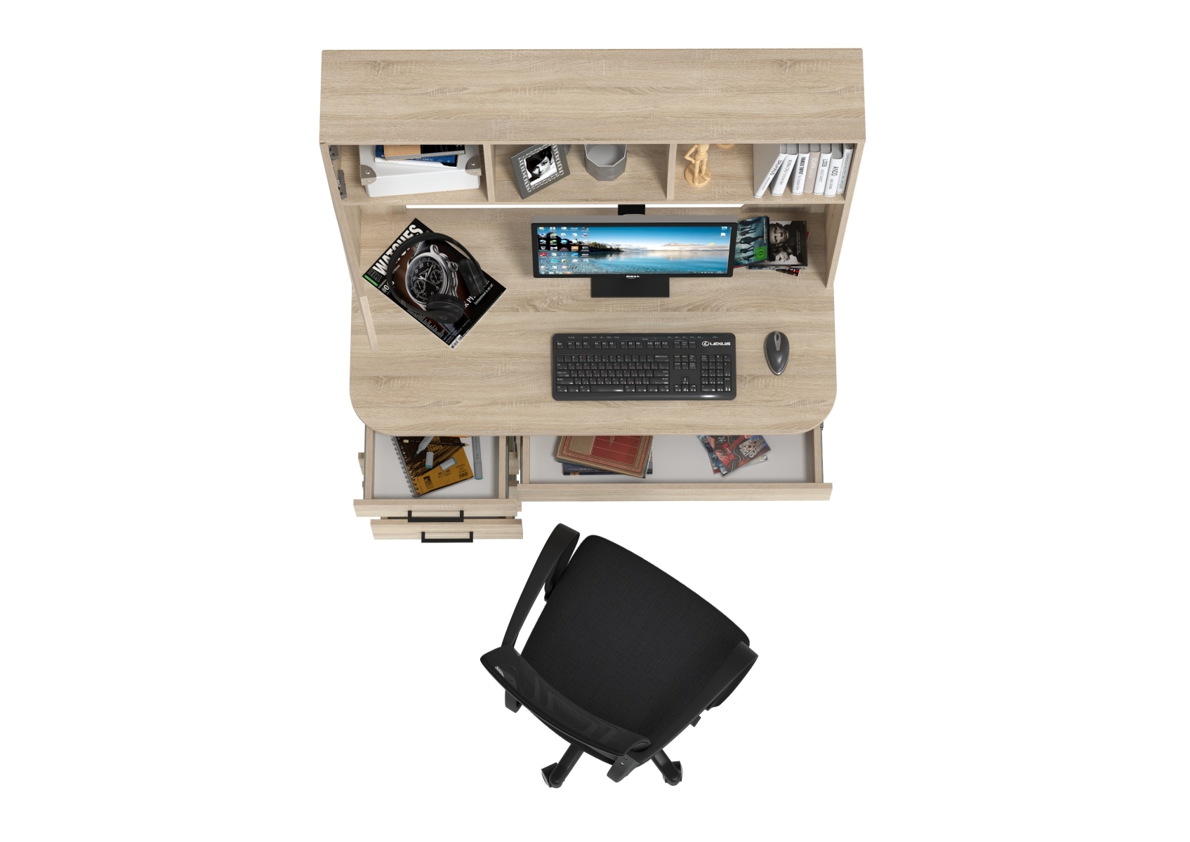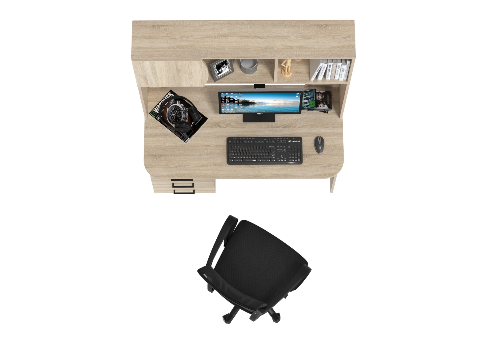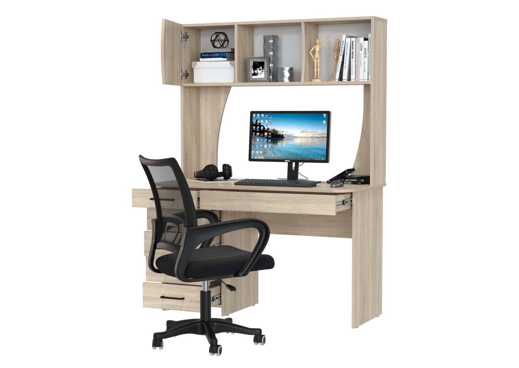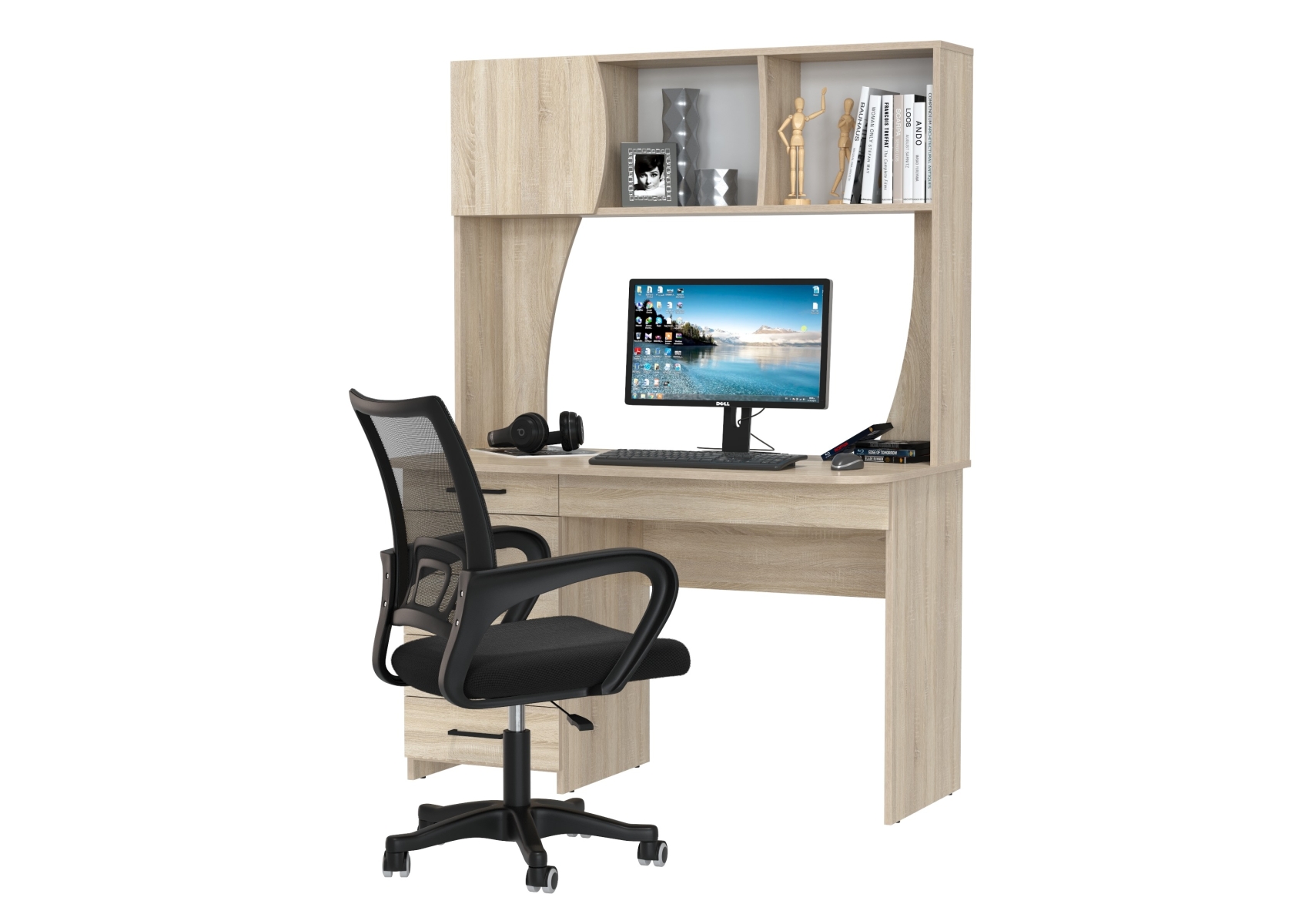 Стол компьютерный с надстройкой Сигма и компьютерное кресло чёрное. Цвет - дуб сонома. Габариты - 120,5х60,5х166 см. Удобный и функциональный компьютерный стол Сигма с надстройкой и эргономичное чёрное кресло с дышащей сеткой. Надстройка включает две открытые ниши и одну за распашной дверцей — удобно для книг, папок и мелкой техники.