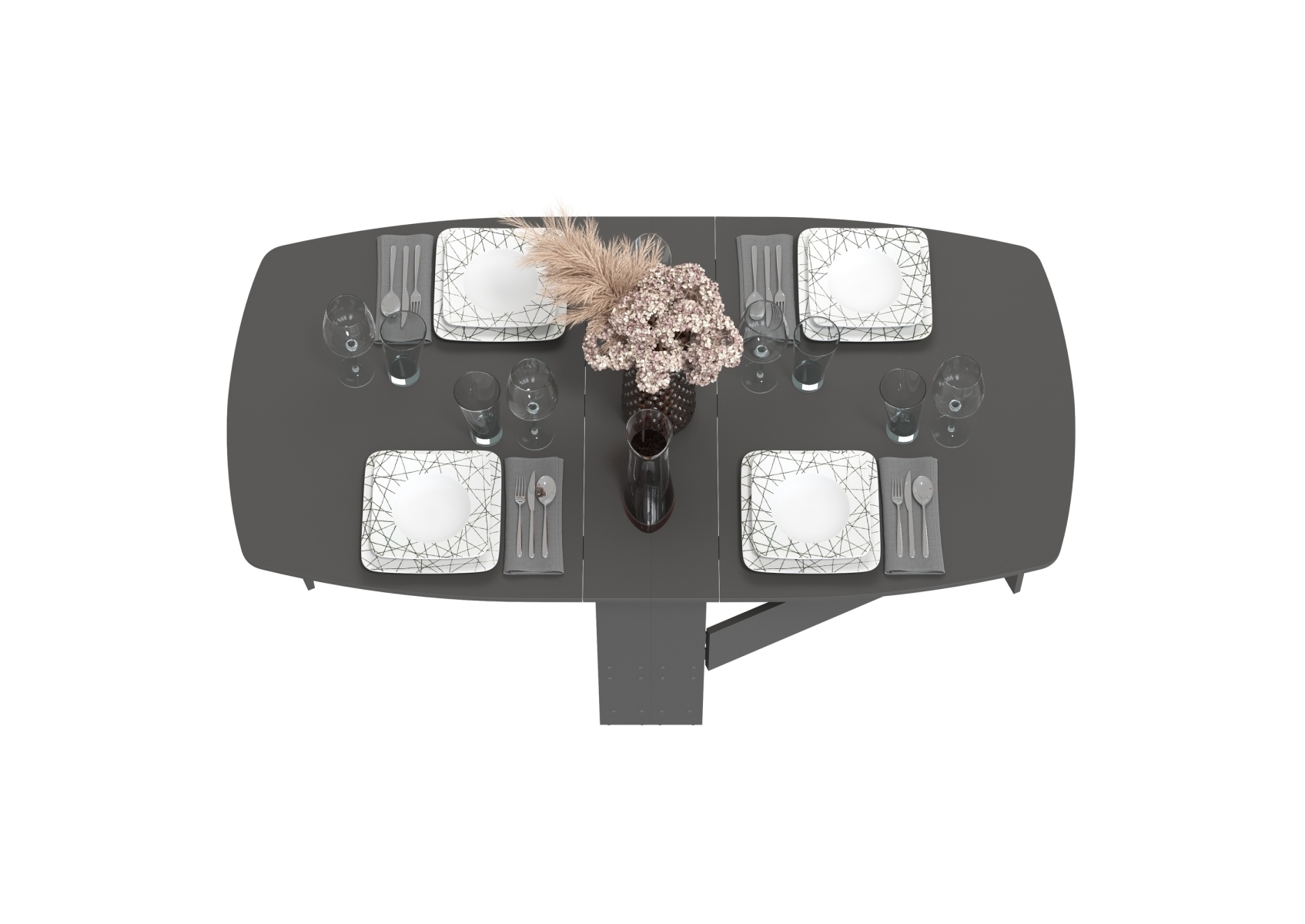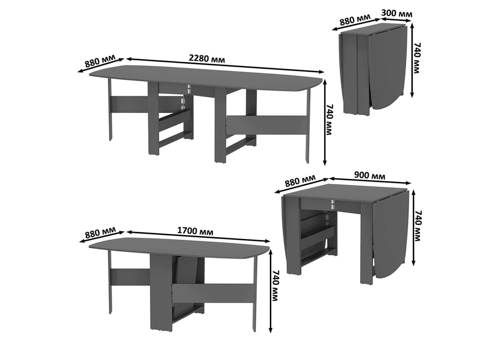 Стол-книжка 1-66. Цвет - графит. Габариты (ШхГхВ) 4 размера - 228х88х74 см, 169х88х74 см, 90х88х74 см, 30х88х74 см. Изюминкой именно этого стола является его возможность многократной трансформации. При стандартной высоте стола 74 см. и глубине 88 см. Размер столешницы может быть 30, 90, 169 и 228 см.