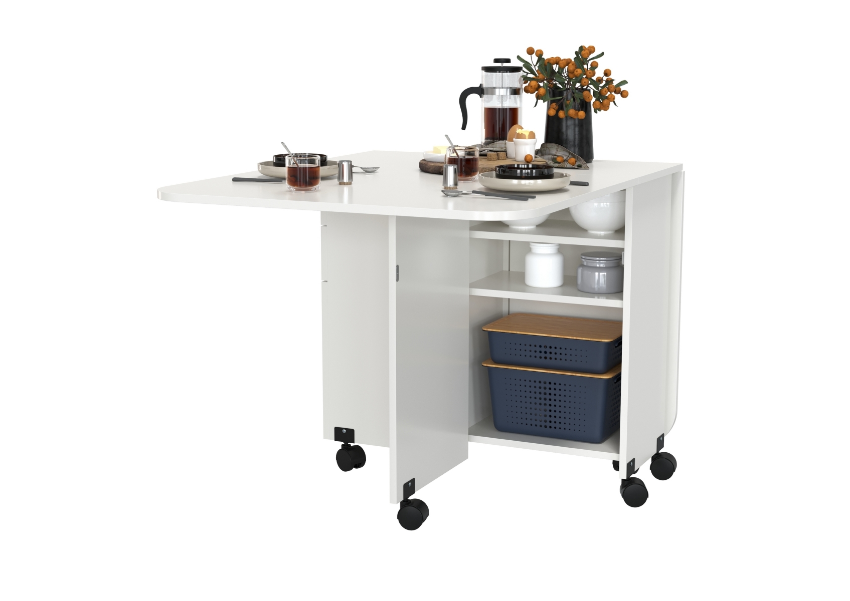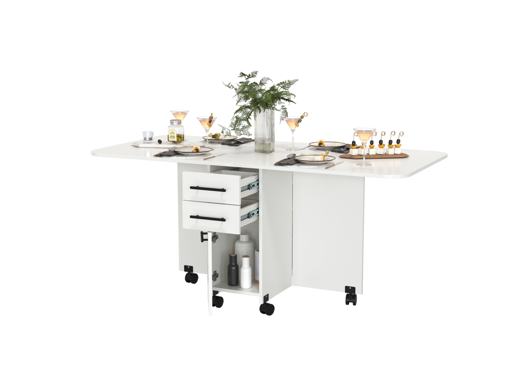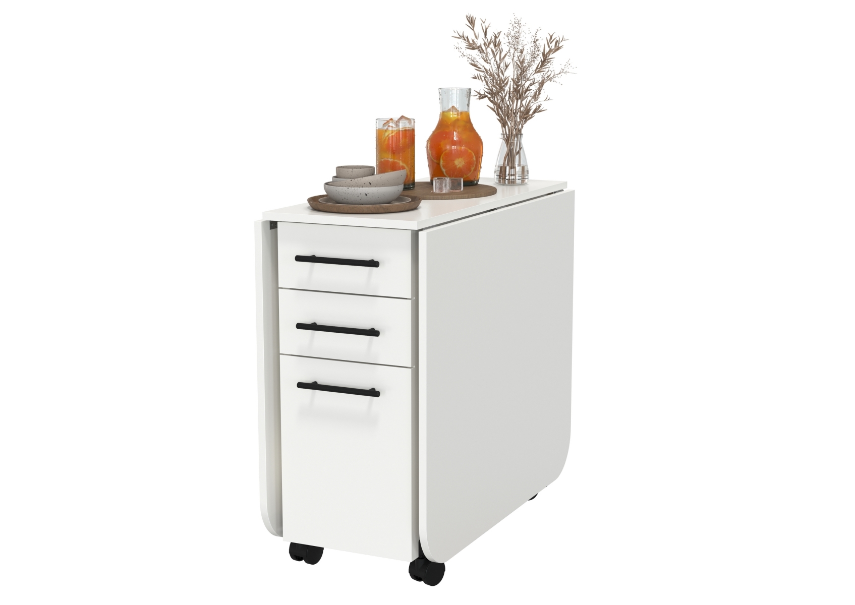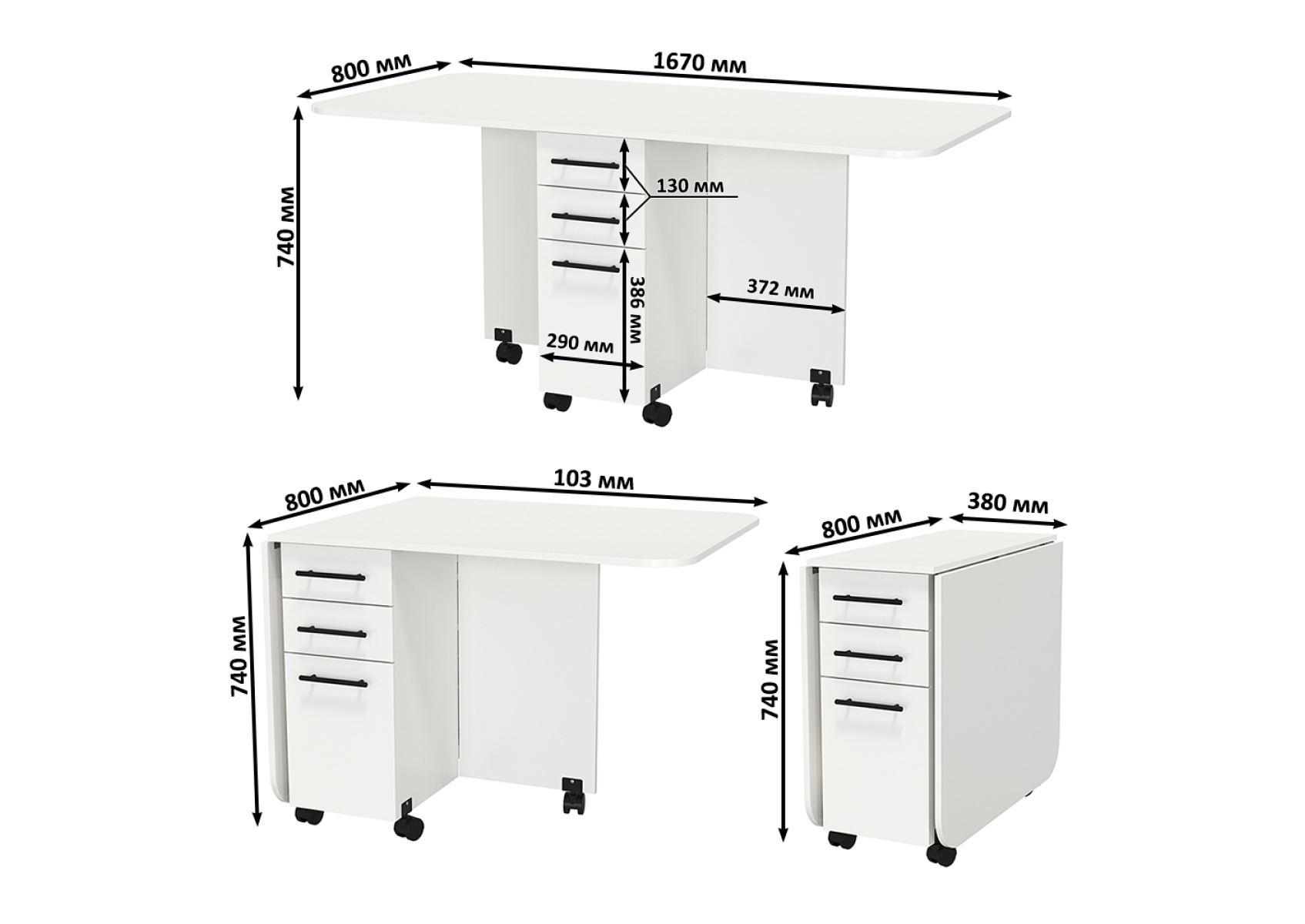 Стол-книжка с ящиками. Цвет - белый. Габариты (ШхГхВ) в сложенном виде - 38х80х74 см, разложенный два размера 103(167)х80х74 см. На колесиках. В основании стола расположена полноценная тумба с двумя отделениями - с торца 2 выдвижных ящика и дверка и с боку две полочки и ниша за распашными дверками с двух сторон.