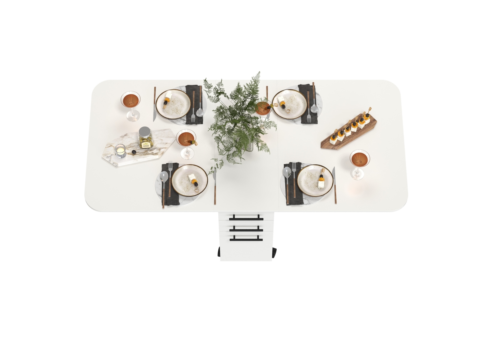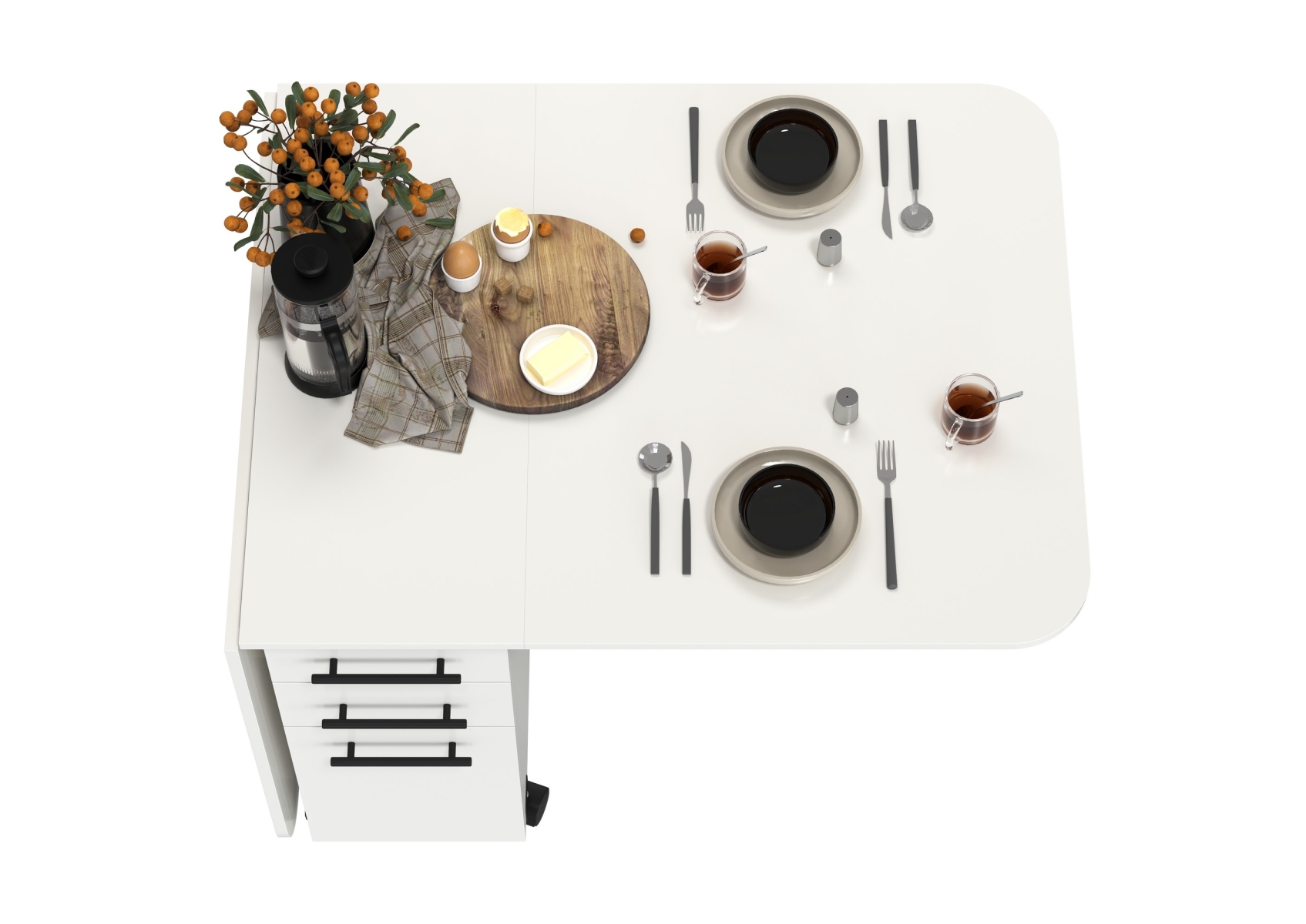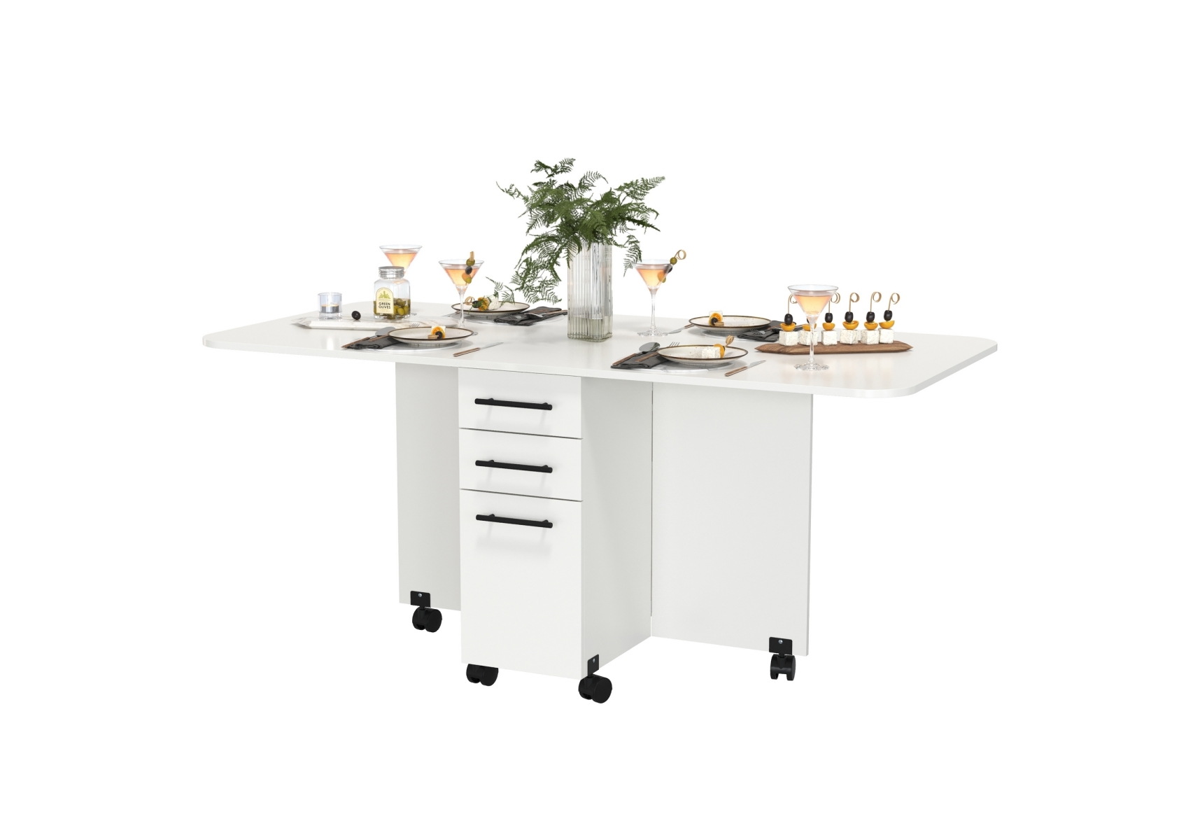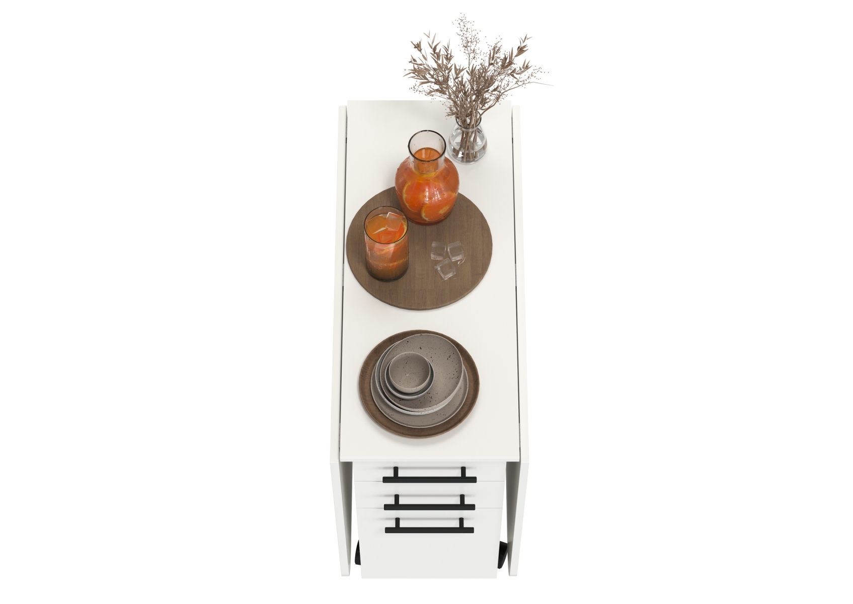Стол-книжка с ящиками. Цвет - белый. Габариты (ШхГхВ) в сложенном виде - 38х80х74 см, разложенный два размера 103(167)х80х74 см. На колесиках. В основании стола расположена полноценная тумба с двумя отделениями - с торца 2 выдвижных ящика и дверка и с боку две полочки и ниша за распашными дверками с двух сторон.