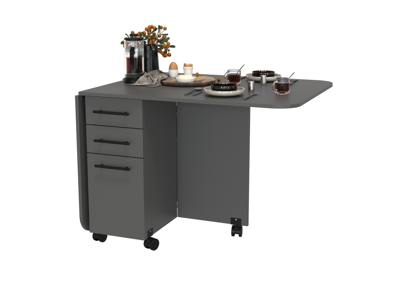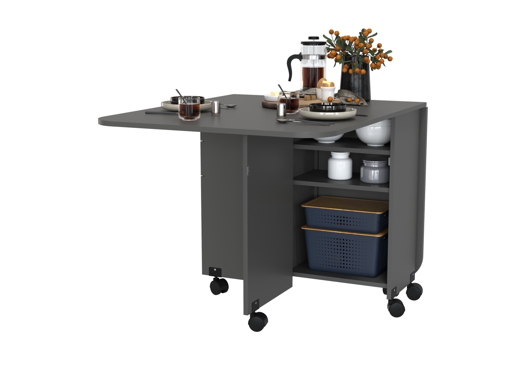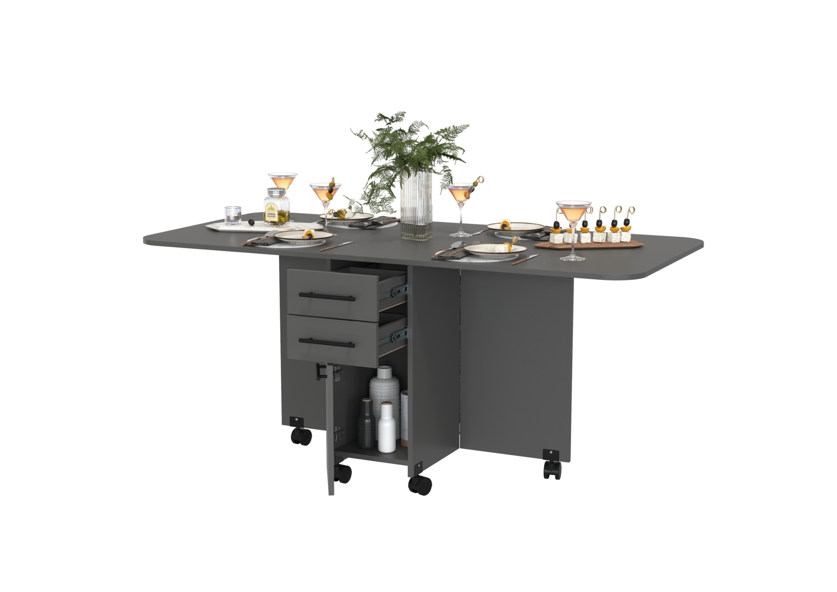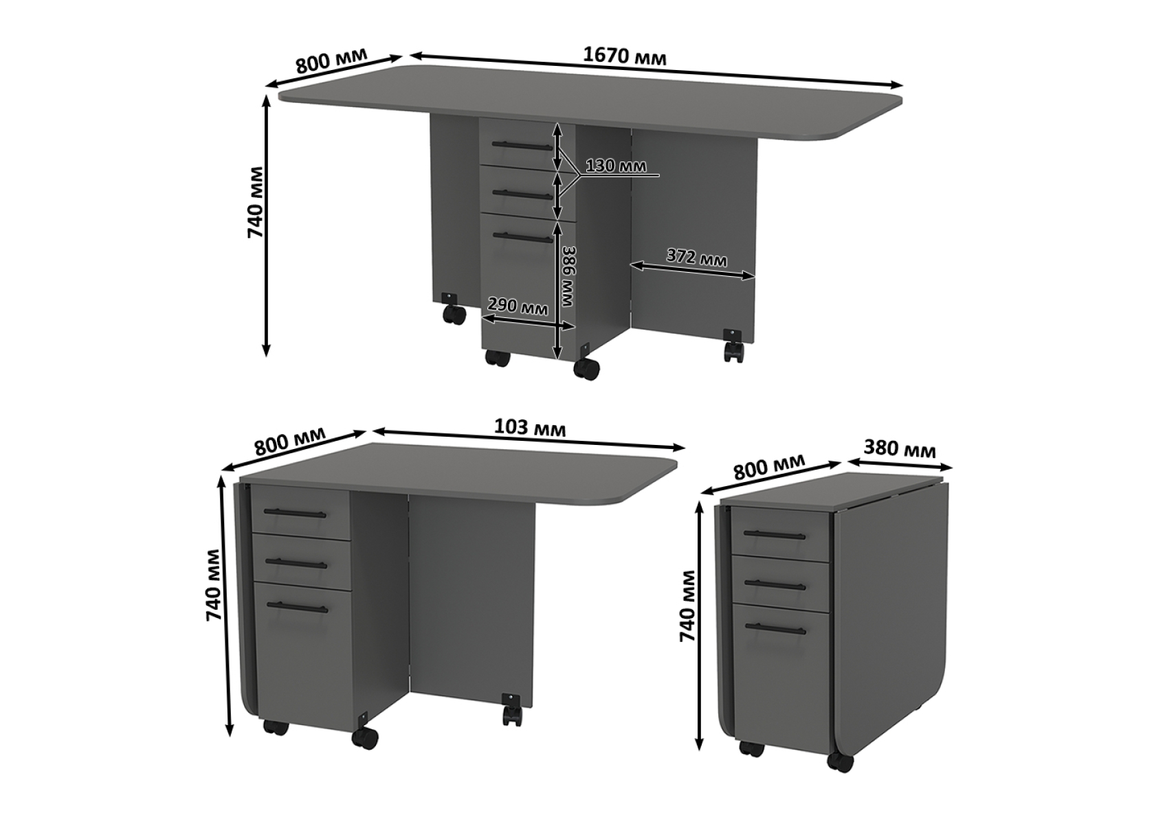 Стол-книжка с ящиками. Цвет - графит. Габариты (ШхГхВ) в сложенном виде - 38х80х74 см, разложенный два размера 103(167)х80х74 см. На колесиках. В основании стола расположена полноценная тумба с двумя отделениями - с торца 2 выдвижных ящика и дверка и с боку две полочки и ниша за распашными дверками с двух сторон.