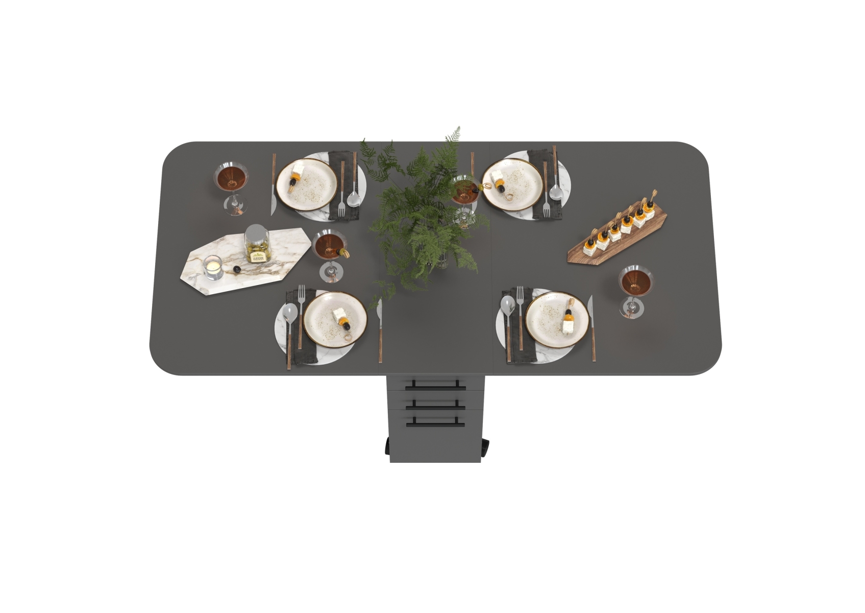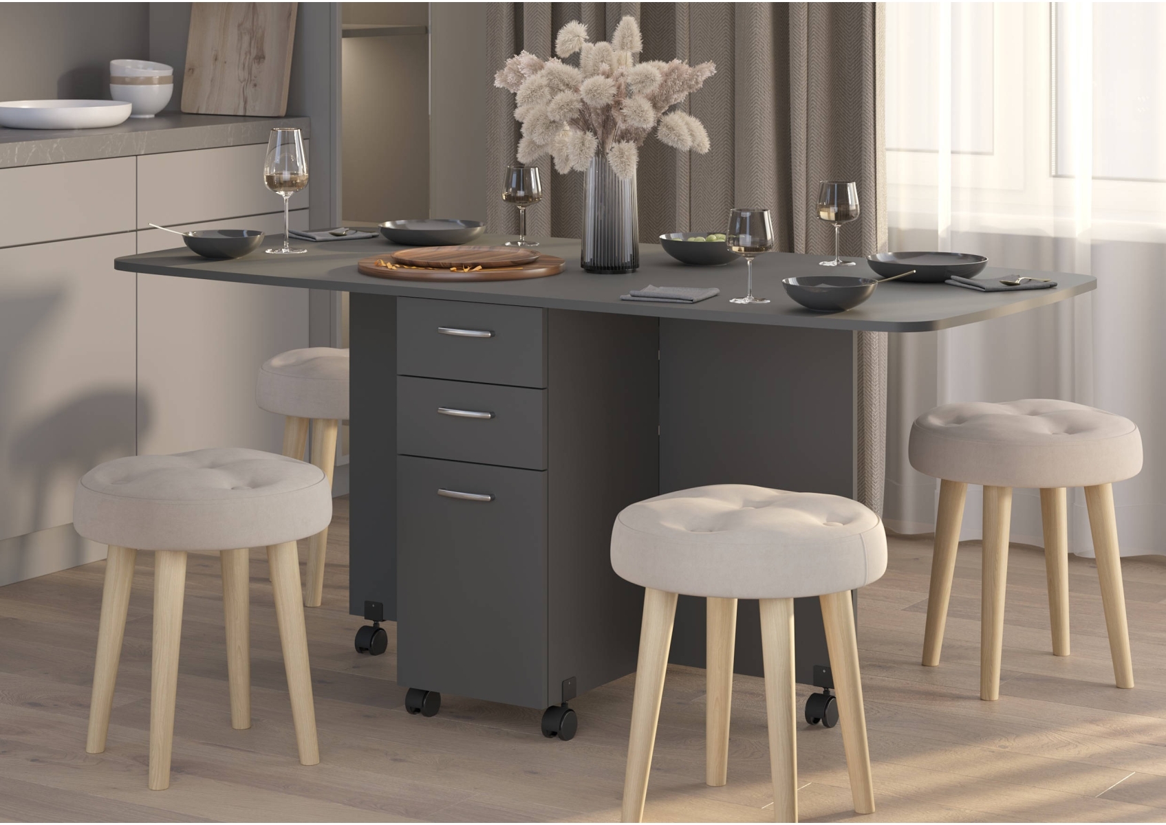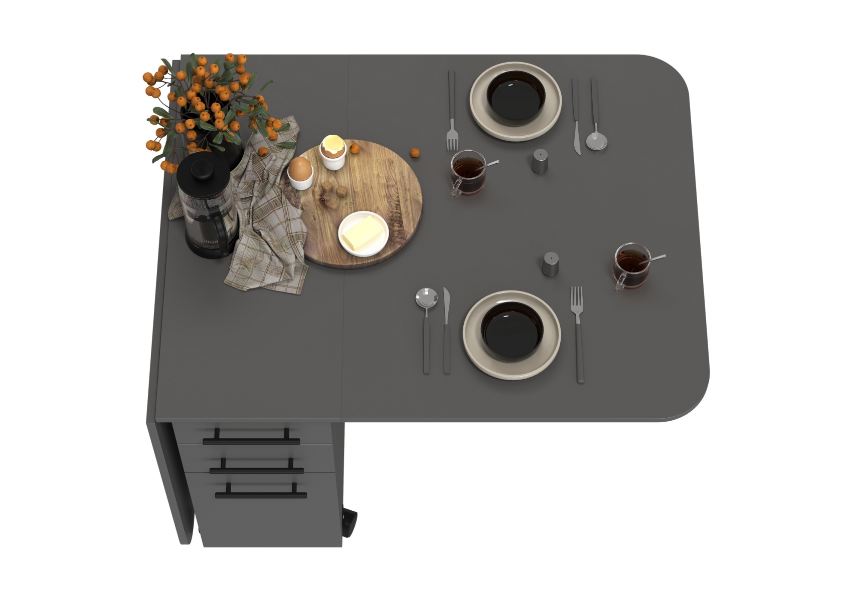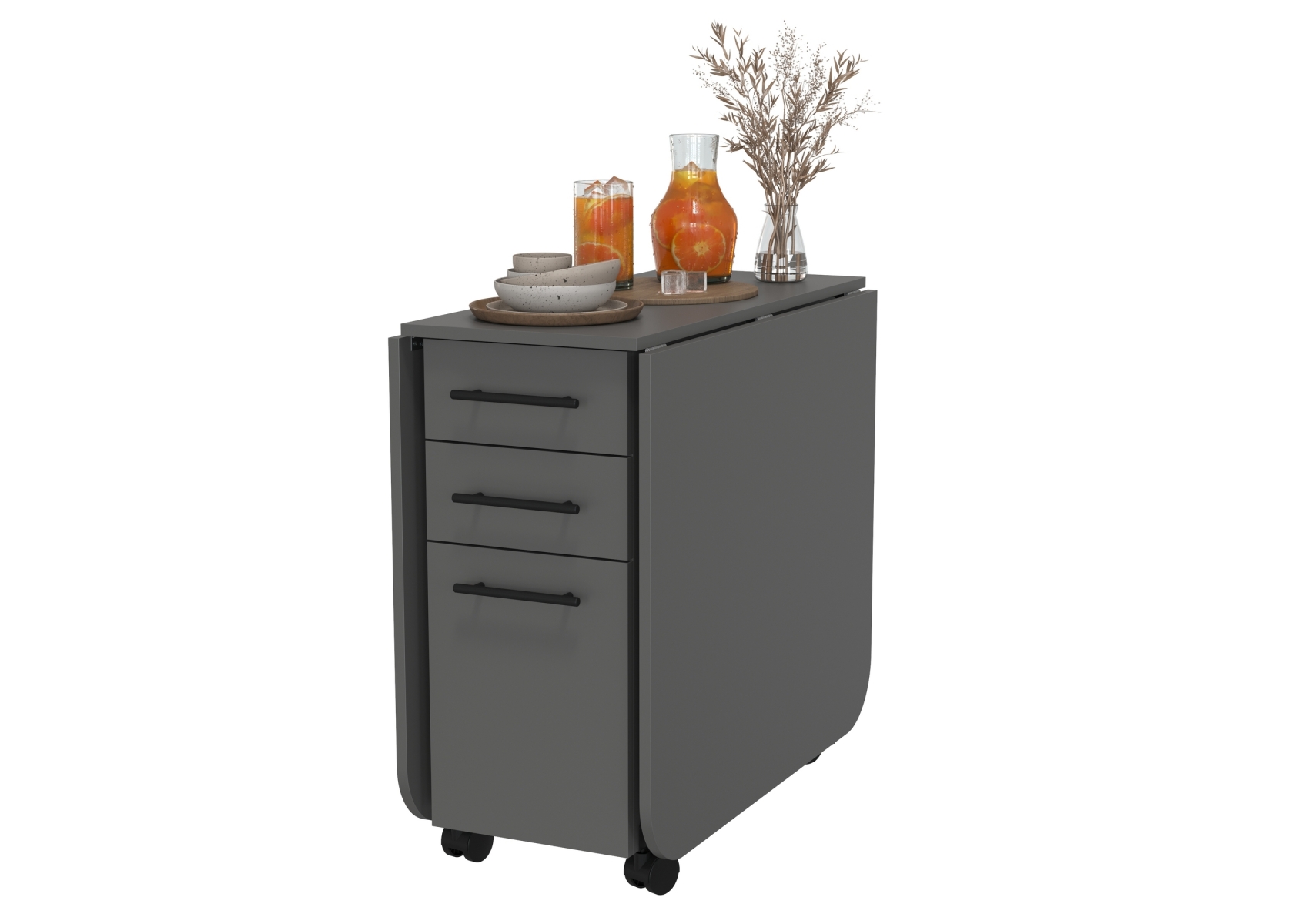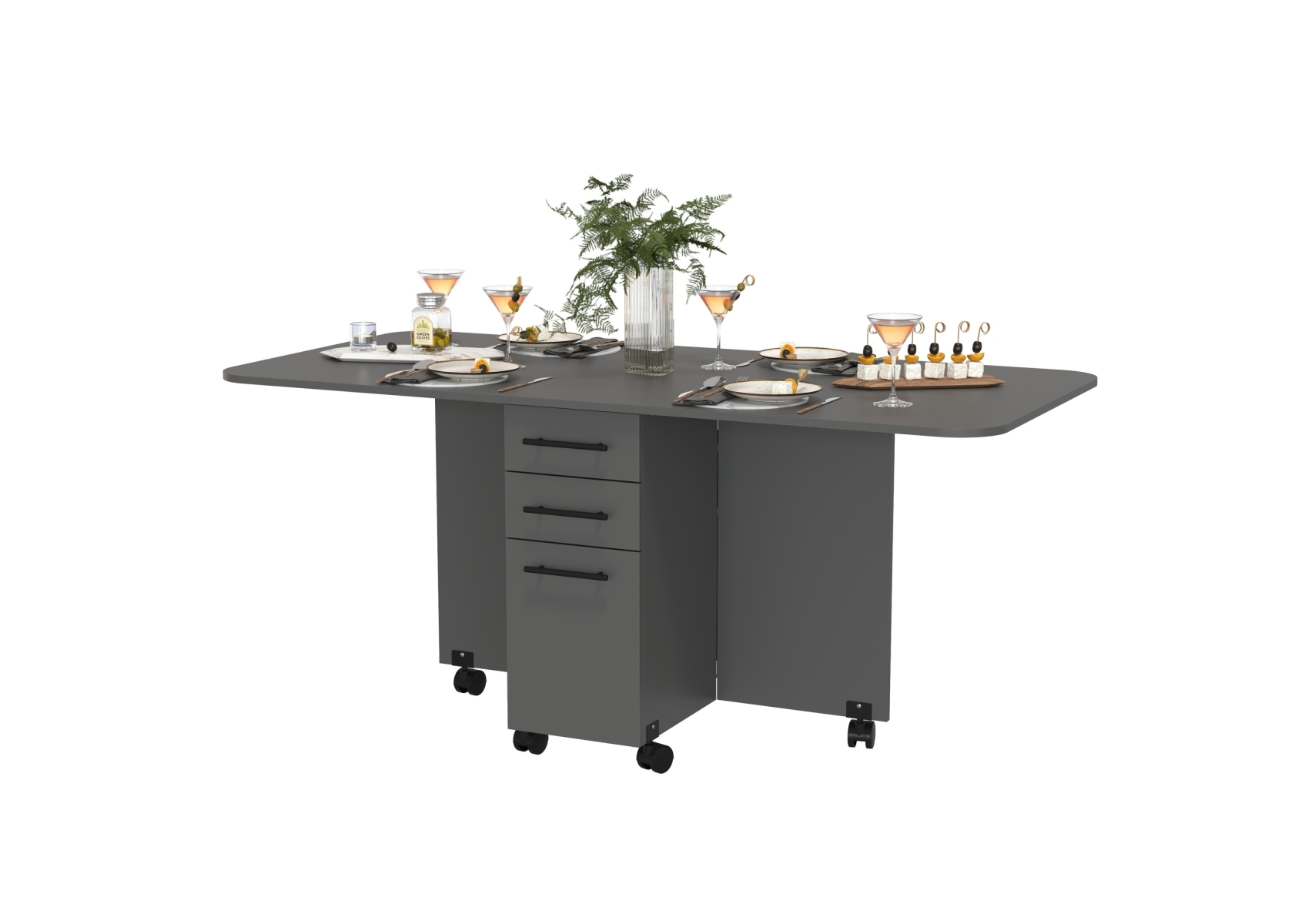 Стол-книжка с ящиками. Цвет - графит. Габариты (ШхГхВ) в сложенном виде - 38х80х74 см, разложенный два размера 103(167)х80х74 см. На колесиках. В основании стола расположена полноценная тумба с двумя отделениями - с торца 2 выдвижных ящика и дверка и с боку две полочки и ниша за распашными дверками с двух сторон.