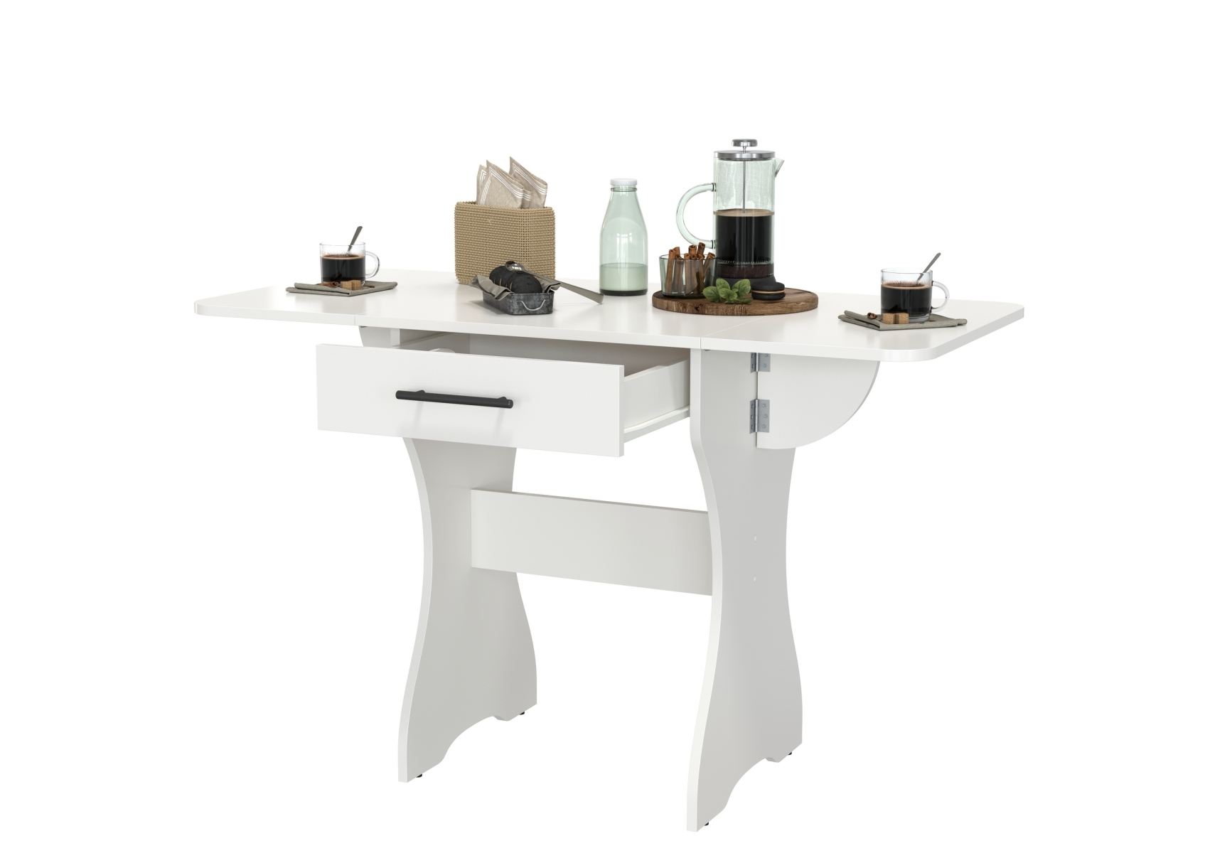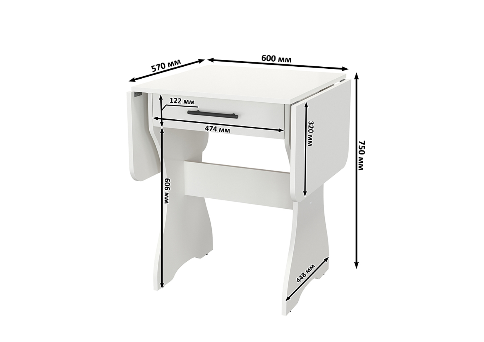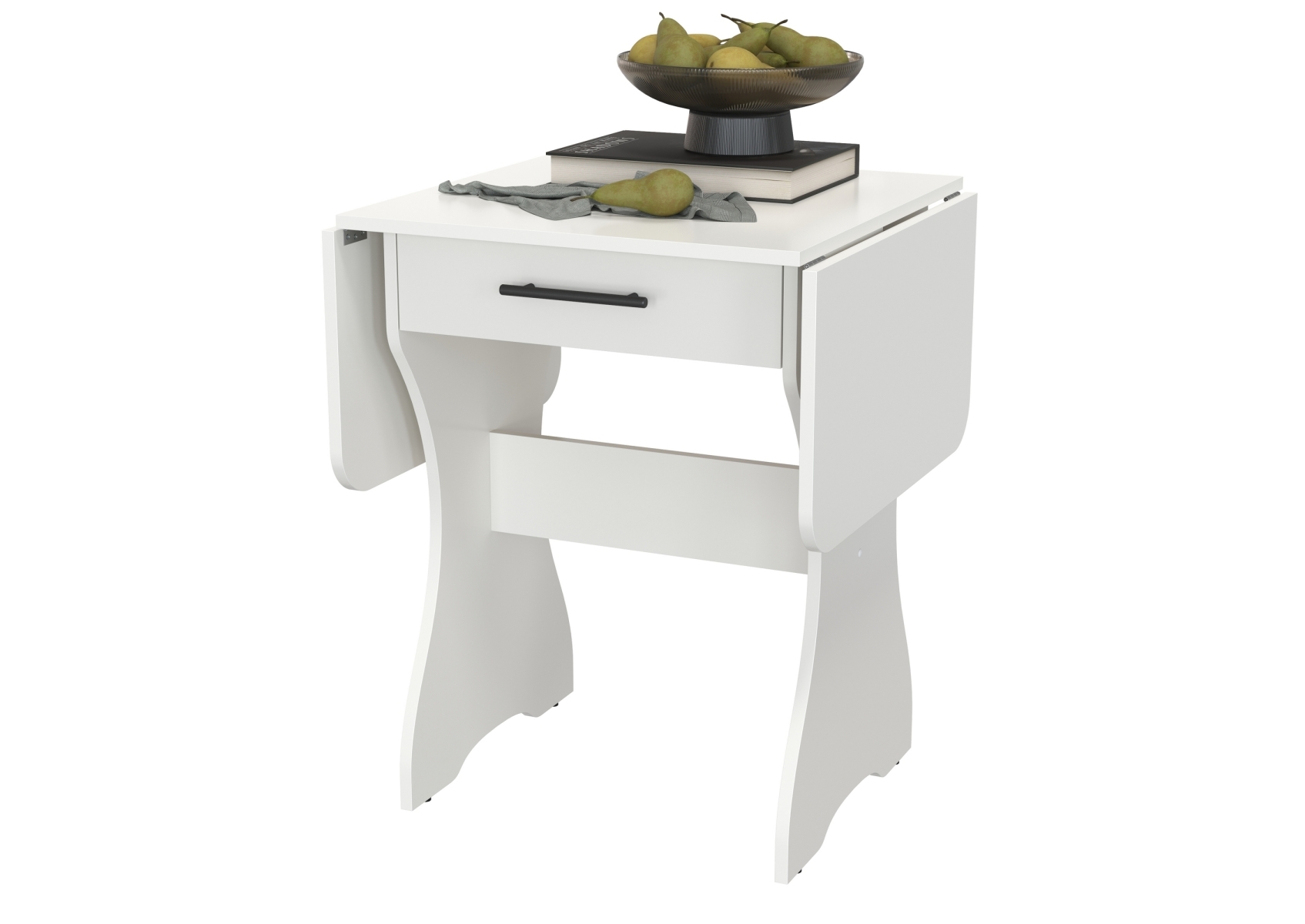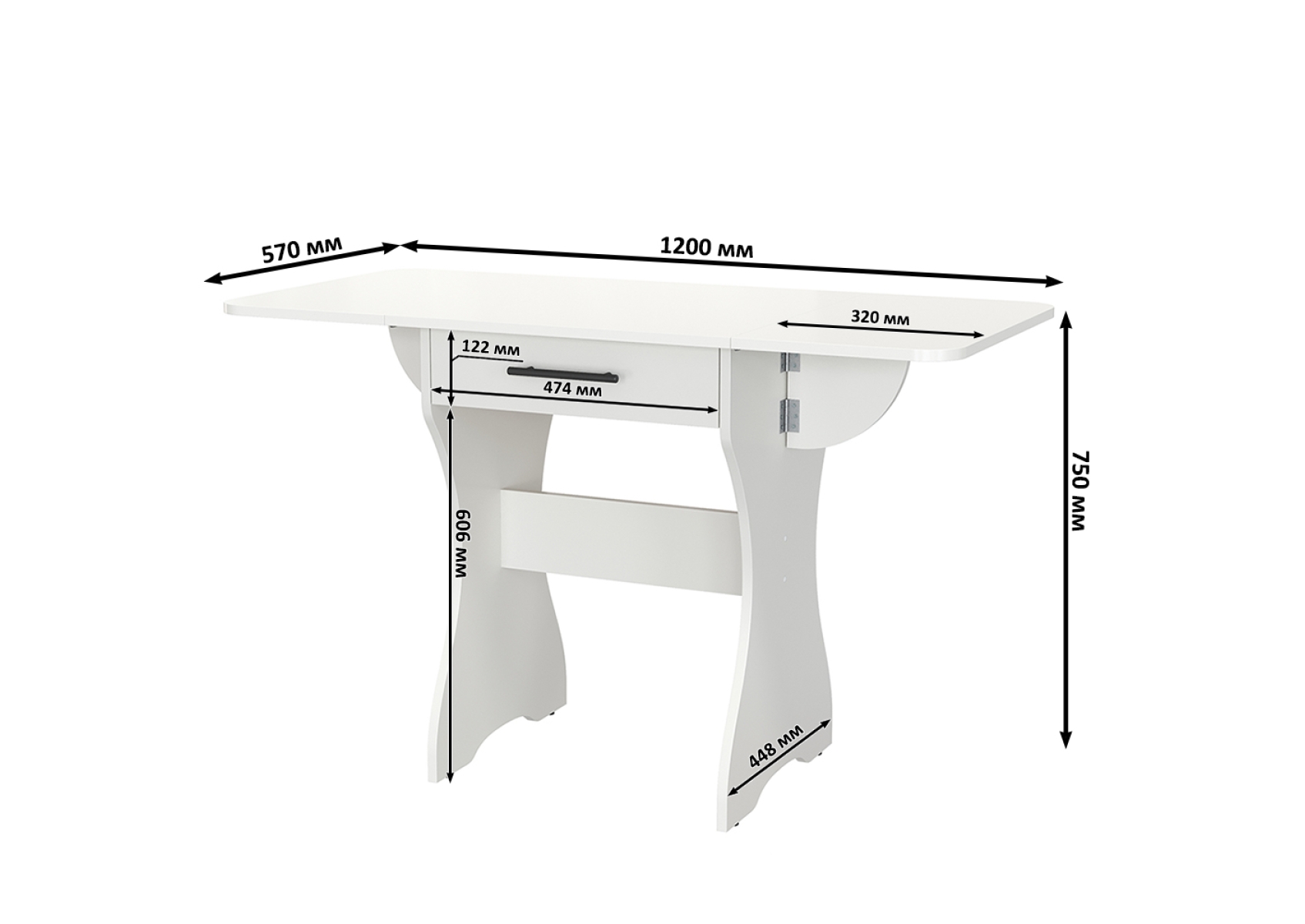 Стол раскладной с ящиком. Цвет - белый. Габариты (ШхГхВ) в разложенном виде - 120х57х75 см, в сложенном - 60х57х75 см. Конструкция стола имеет функциональную изюминку - боковые «крылья», позволяющие увеличить длину столешницы в 2 раза. Закругленные углы столешницы позволят избежать ненужных травм маленькими детками.