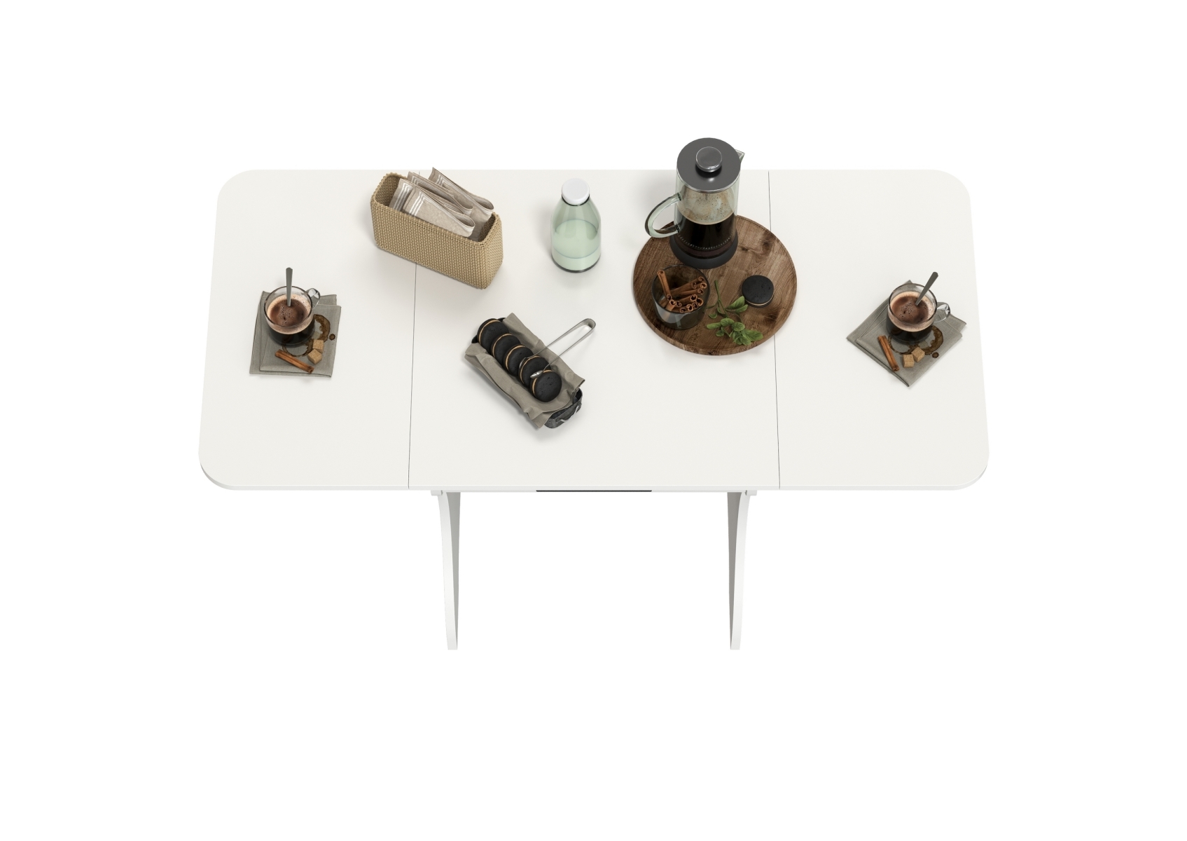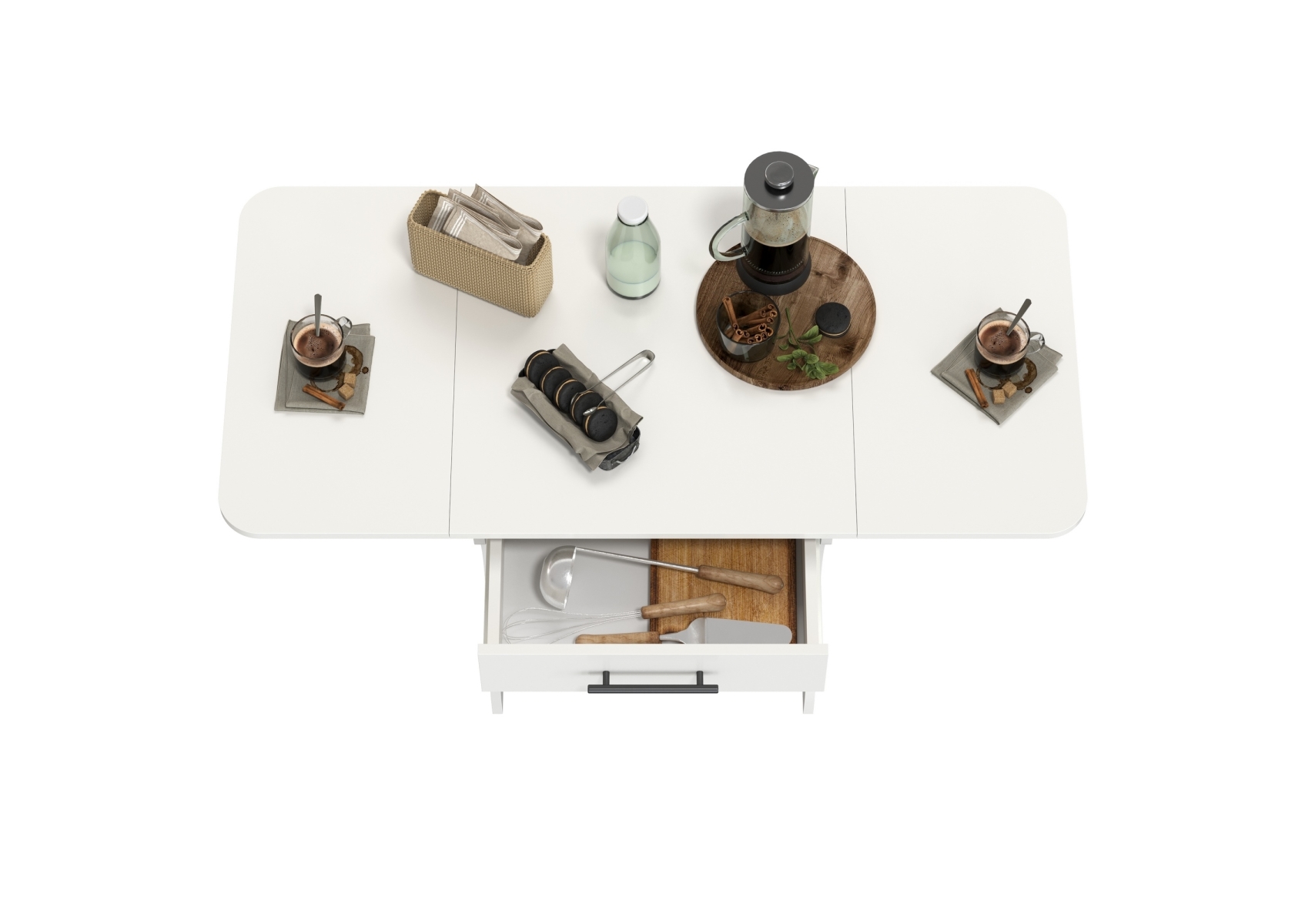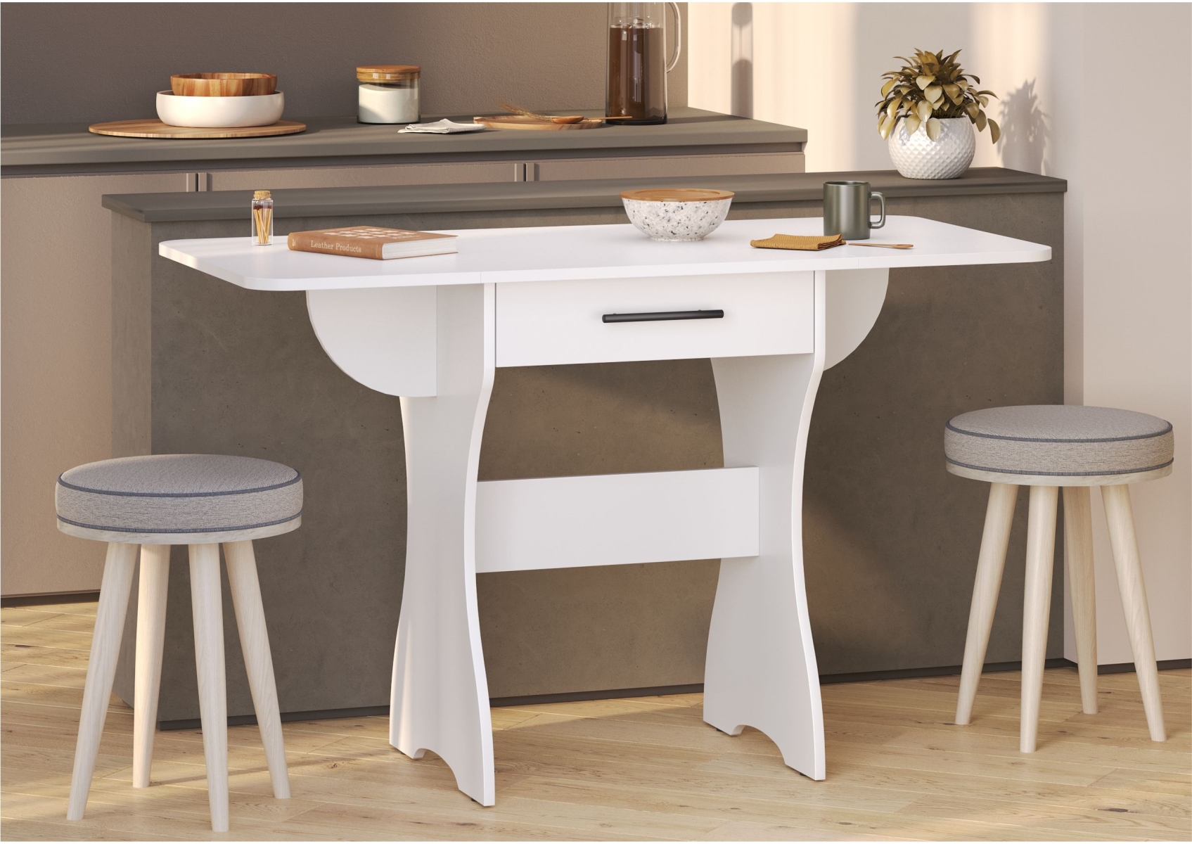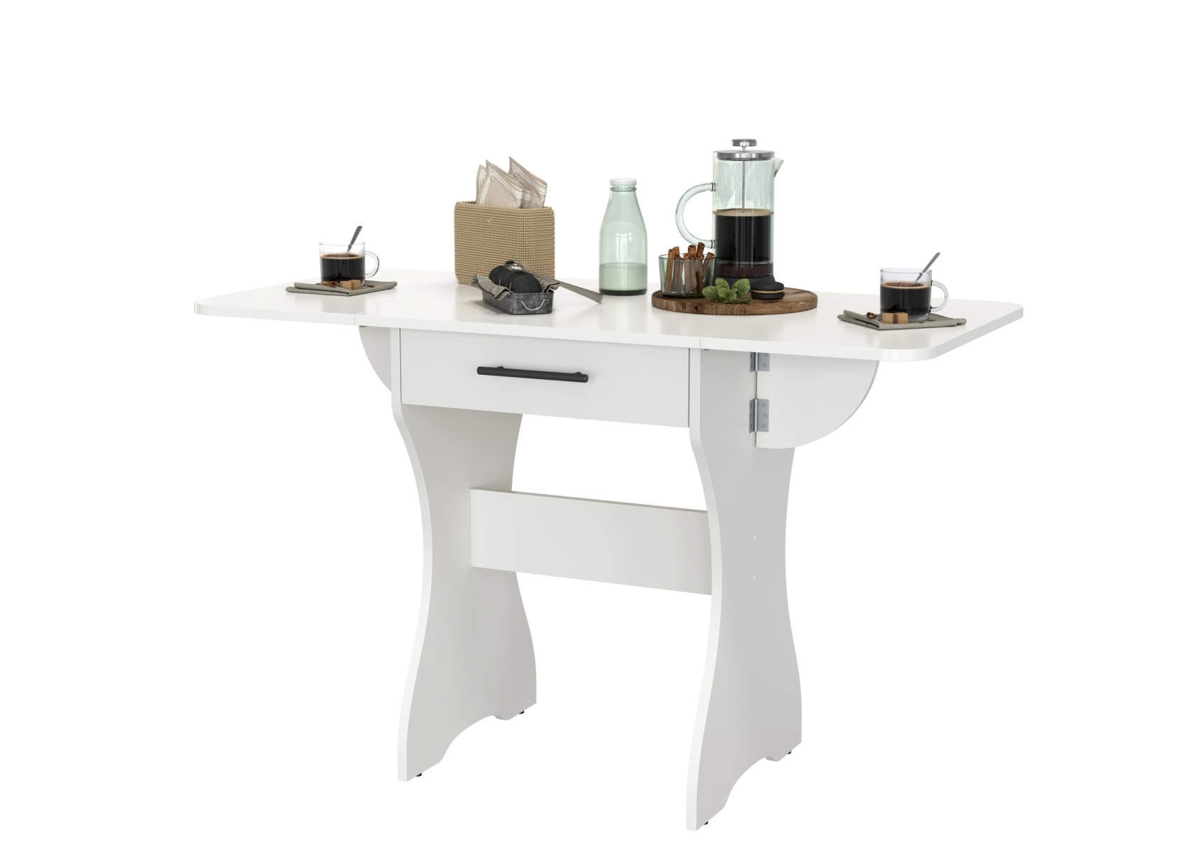 Стол раскладной с ящиком. Цвет - белый. Габариты (ШхГхВ) в разложенном виде - 120х57х75 см, в сложенном - 60х57х75 см. Конструкция стола имеет функциональную изюминку - боковые «крылья», позволяющие увеличить длину столешницы в 2 раза. Закругленные углы столешницы позволят избежать ненужных травм маленькими детками.
