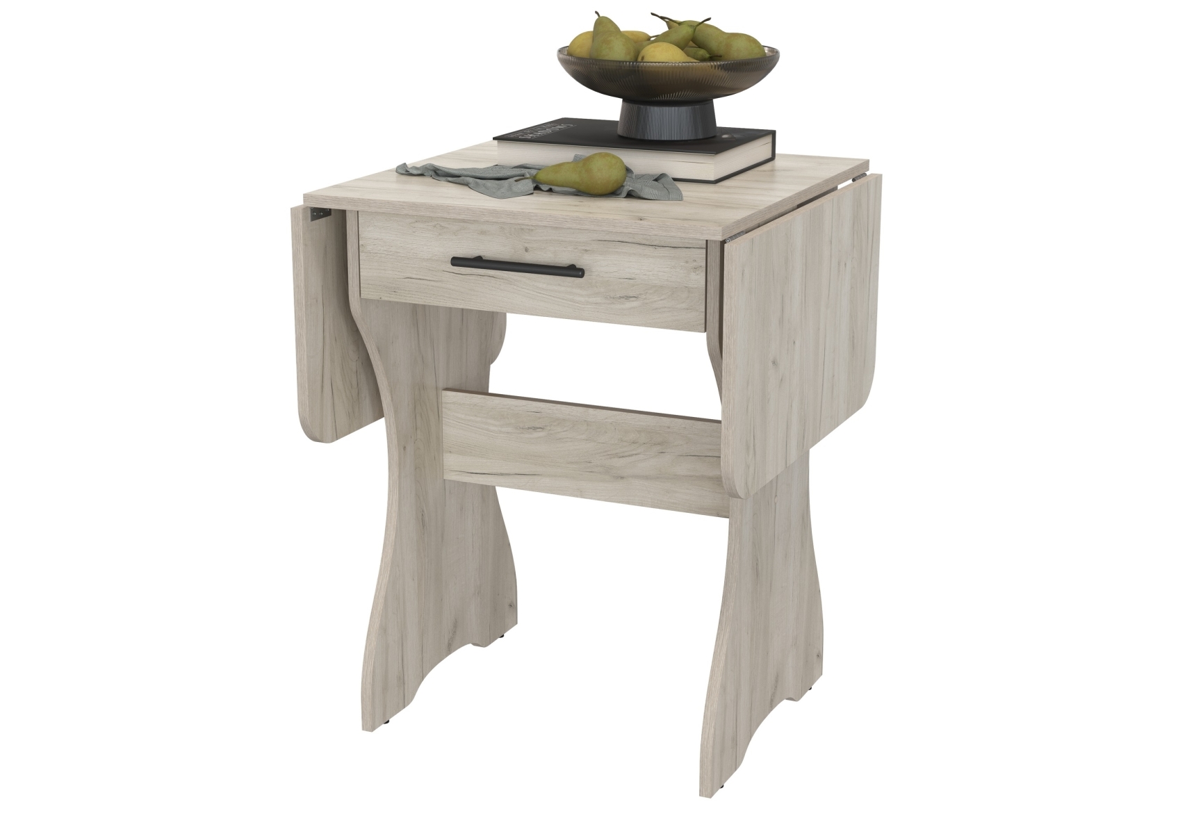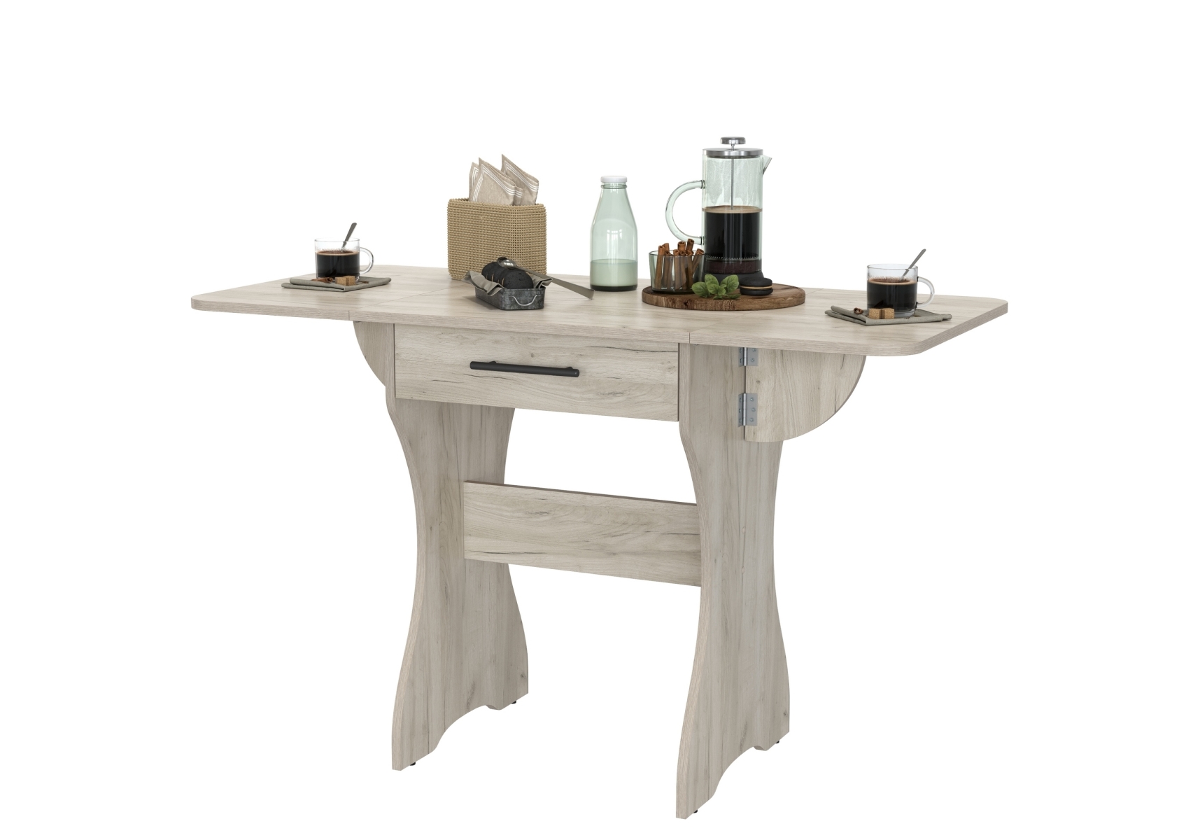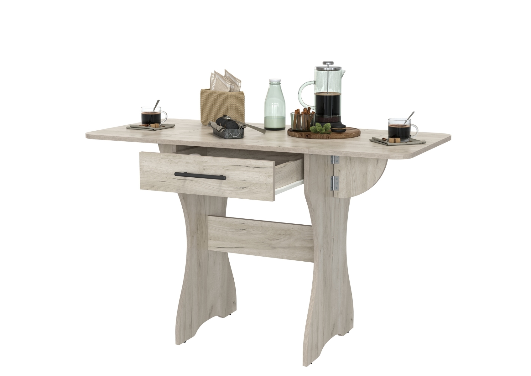 Стол раскладной с ящиком. Цвет - дуб крафт серый. Габариты (ШхГхВ) в разложенном виде - 120х57х75 см, в сложенном - 60х57х75 см. Конструкция стола имеет функциональную изюминку - боковые «крылья», позволяющие увеличить длину столешницы в 2 раза. Закругленные углы столешницы позволят избежать ненужных травм маленькими детками.