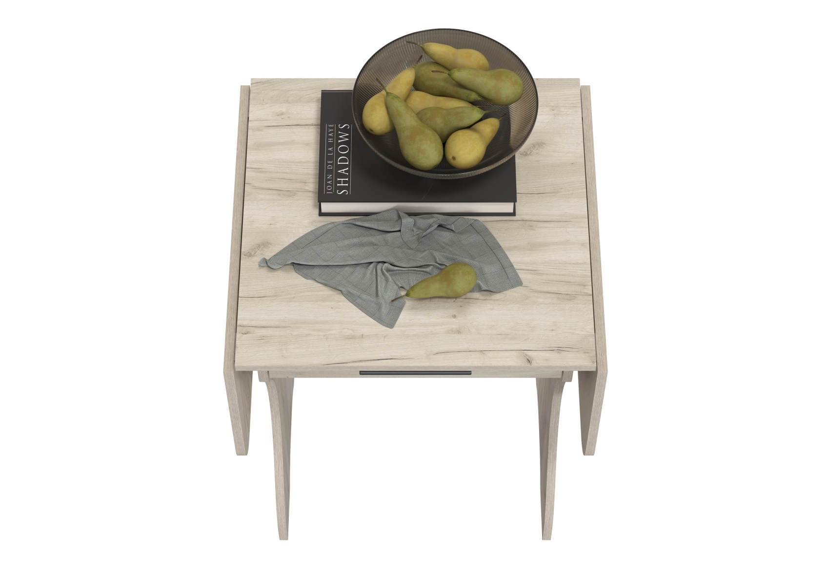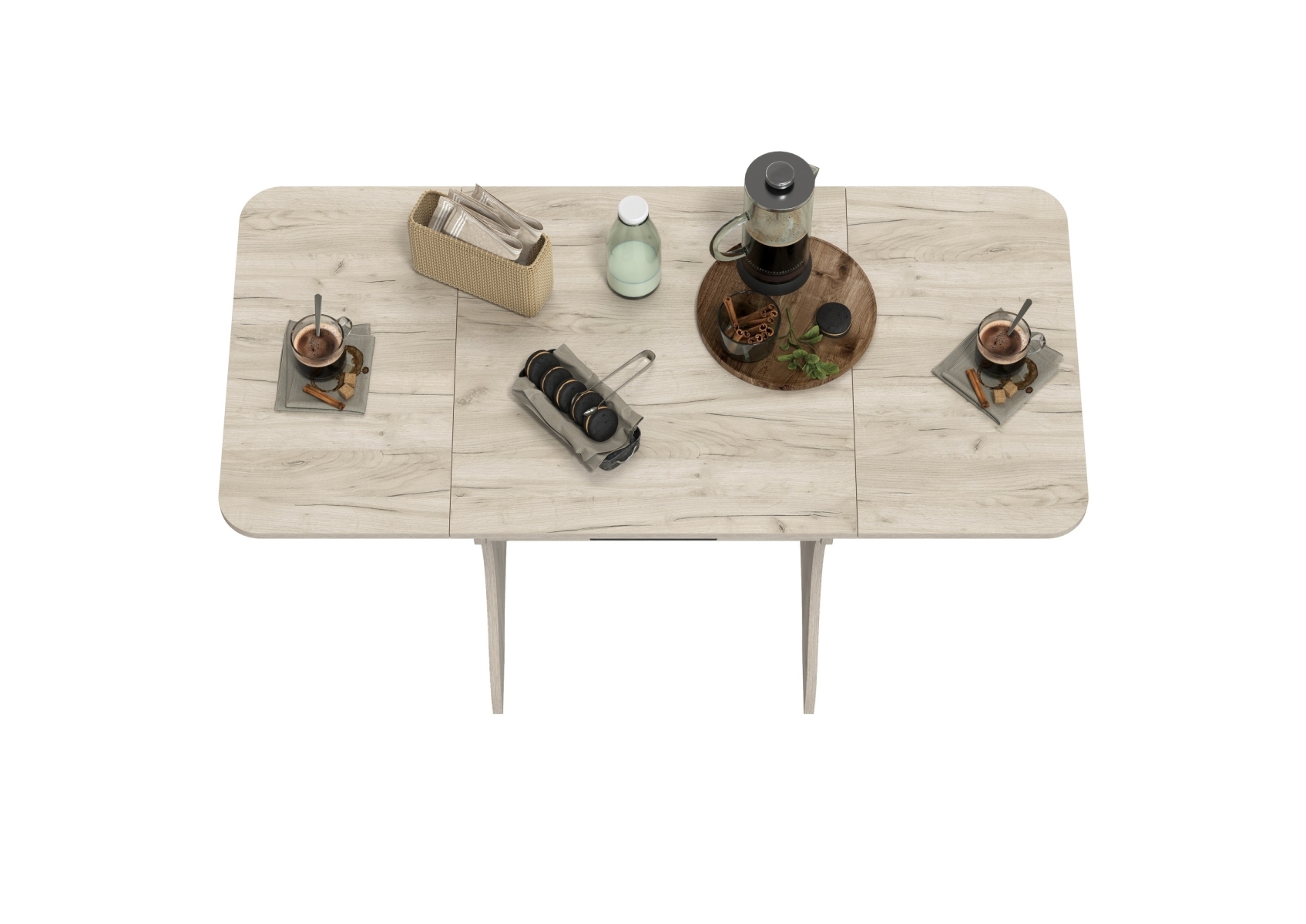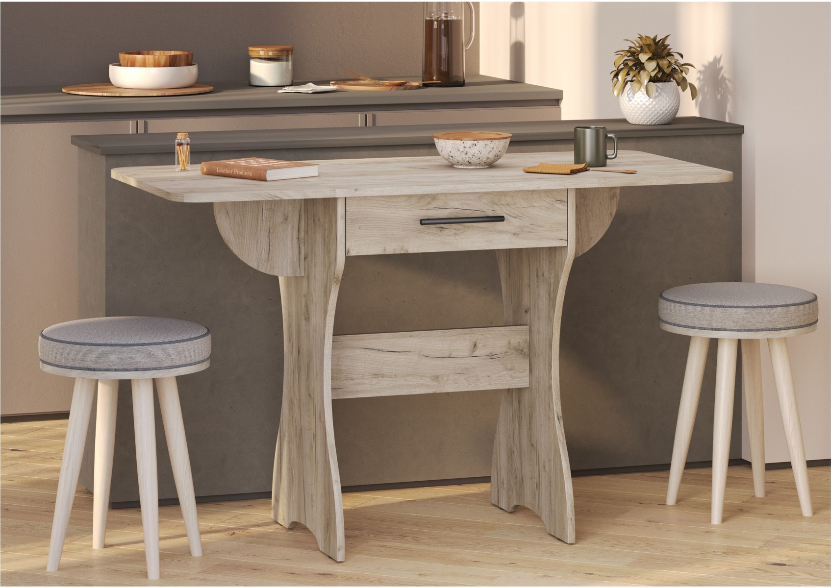 Стол раскладной с ящиком. Цвет - дуб крафт серый. Габариты (ШхГхВ) в разложенном виде - 120х57х75 см, в сложенном - 60х57х75 см. Конструкция стола имеет функциональную изюминку - боковые «крылья», позволяющие увеличить длину столешницы в 2 раза. Закругленные углы столешницы позволят избежать ненужных травм маленькими детками.