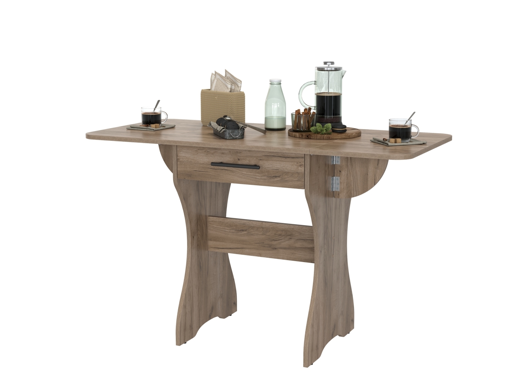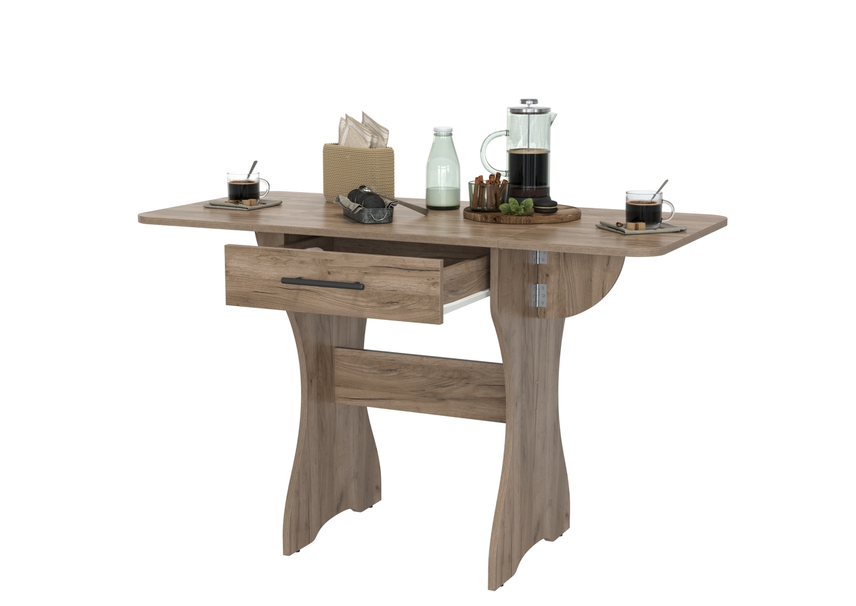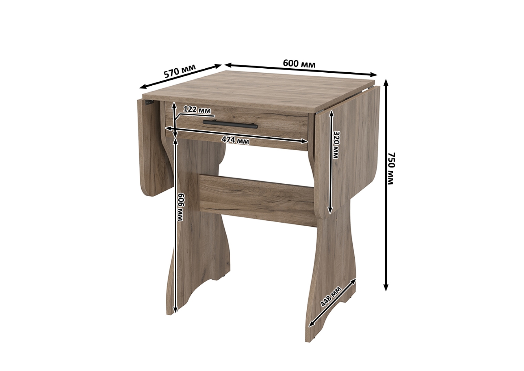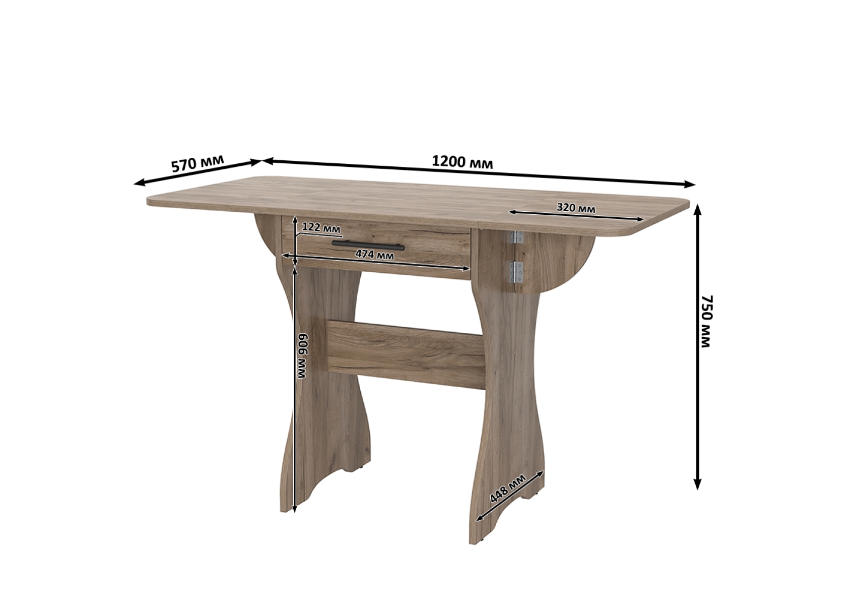 Стол раскладной с ящиком. Цвет - дуб крафт табачный. Габариты (ШхГхВ) в разложенном виде - 120х57х75 см, в сложенном - 60х57х75 см. Конструкция стола имеет функциональную изюминку - боковые «крылья», позволяющие увеличить длину столешницы в 2 раза. Закругленные углы столешницы позволят избежать ненужных травм маленькими детками.