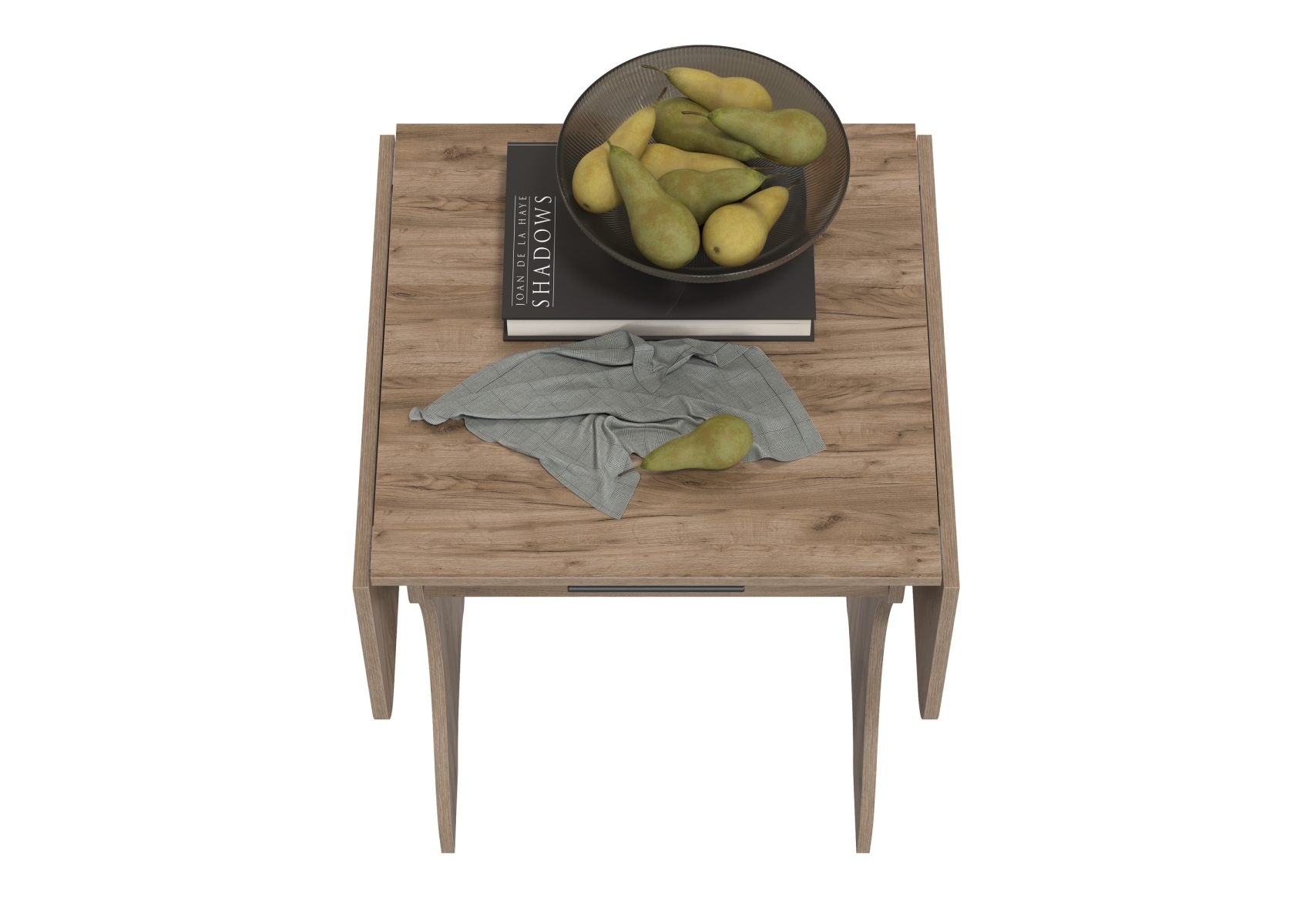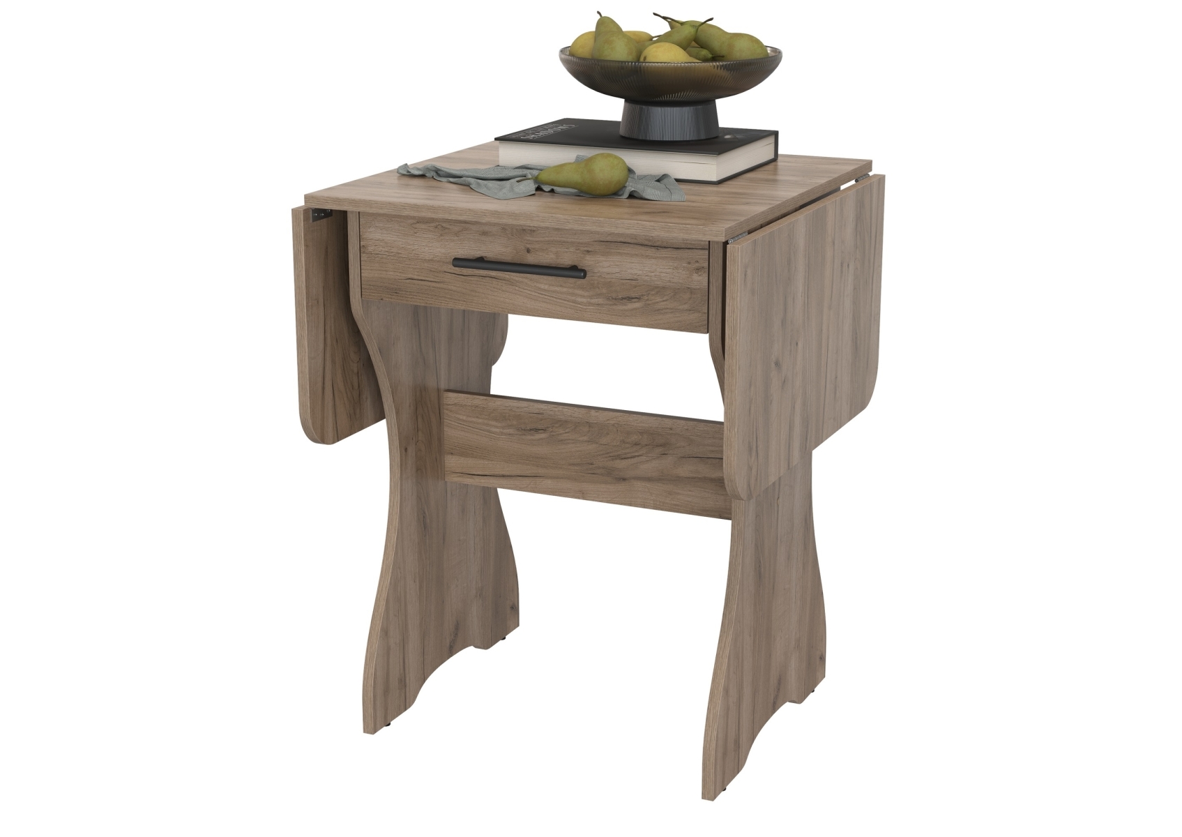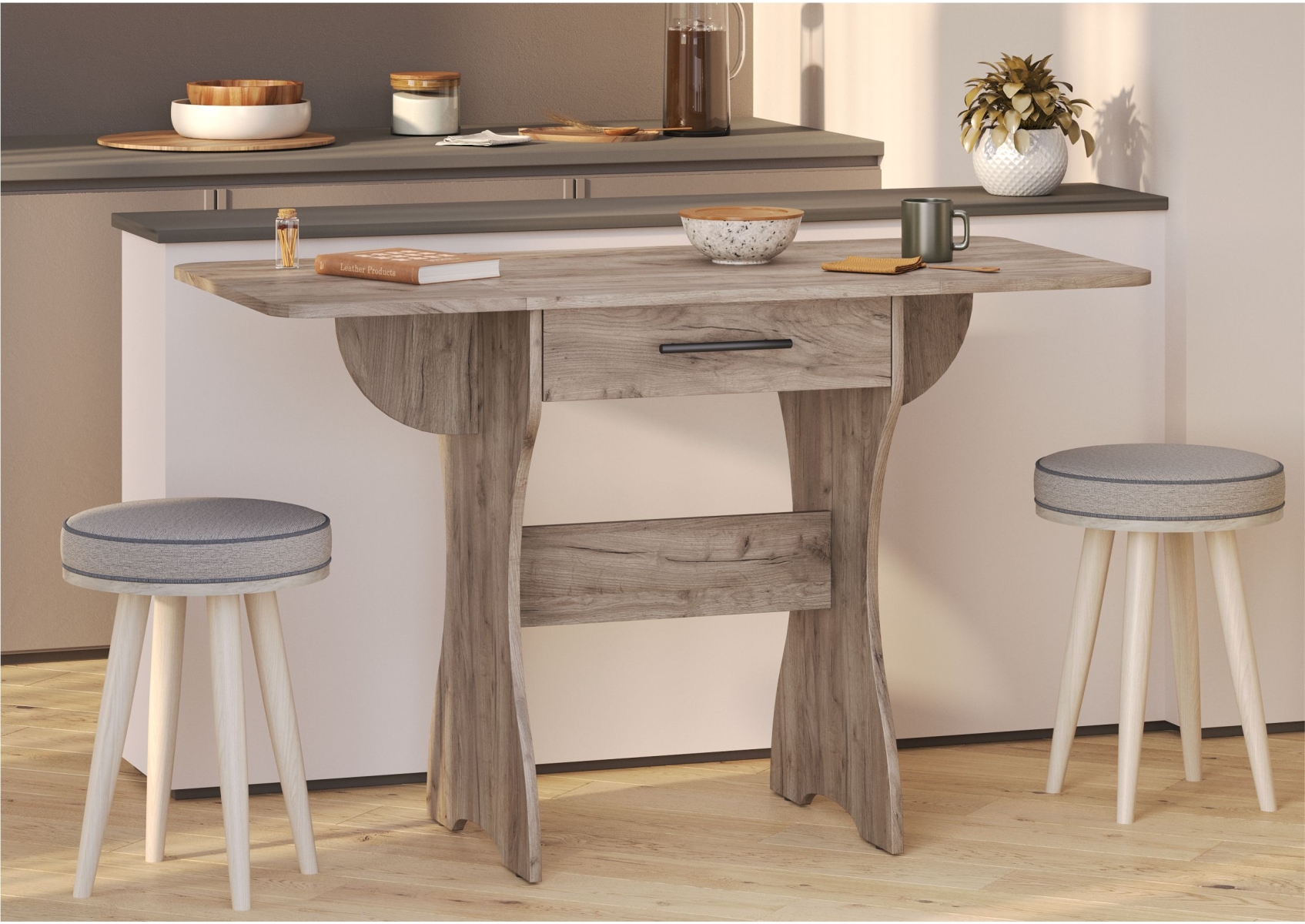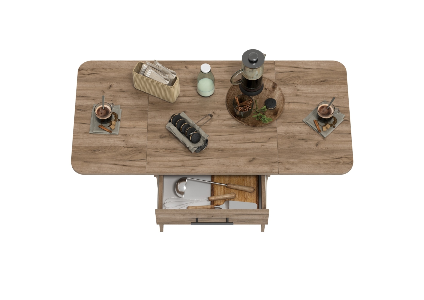 Стол раскладной с ящиком. Цвет - дуб крафт табачный. Габариты (ШхГхВ) в разложенном виде - 120х57х75 см, в сложенном - 60х57х75 см. Конструкция стола имеет функциональную изюминку - боковые «крылья», позволяющие увеличить длину столешницы в 2 раза. Закругленные углы столешницы позволят избежать ненужных травм маленькими детками.