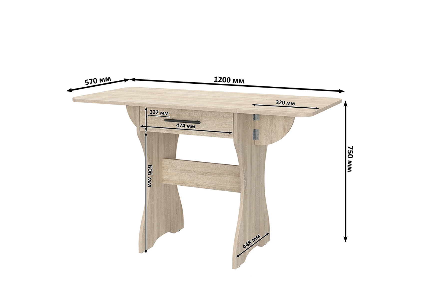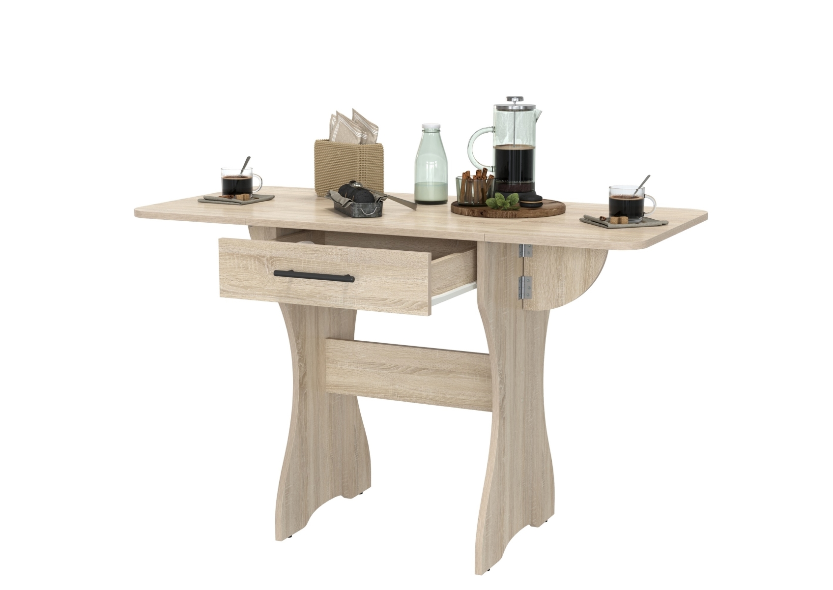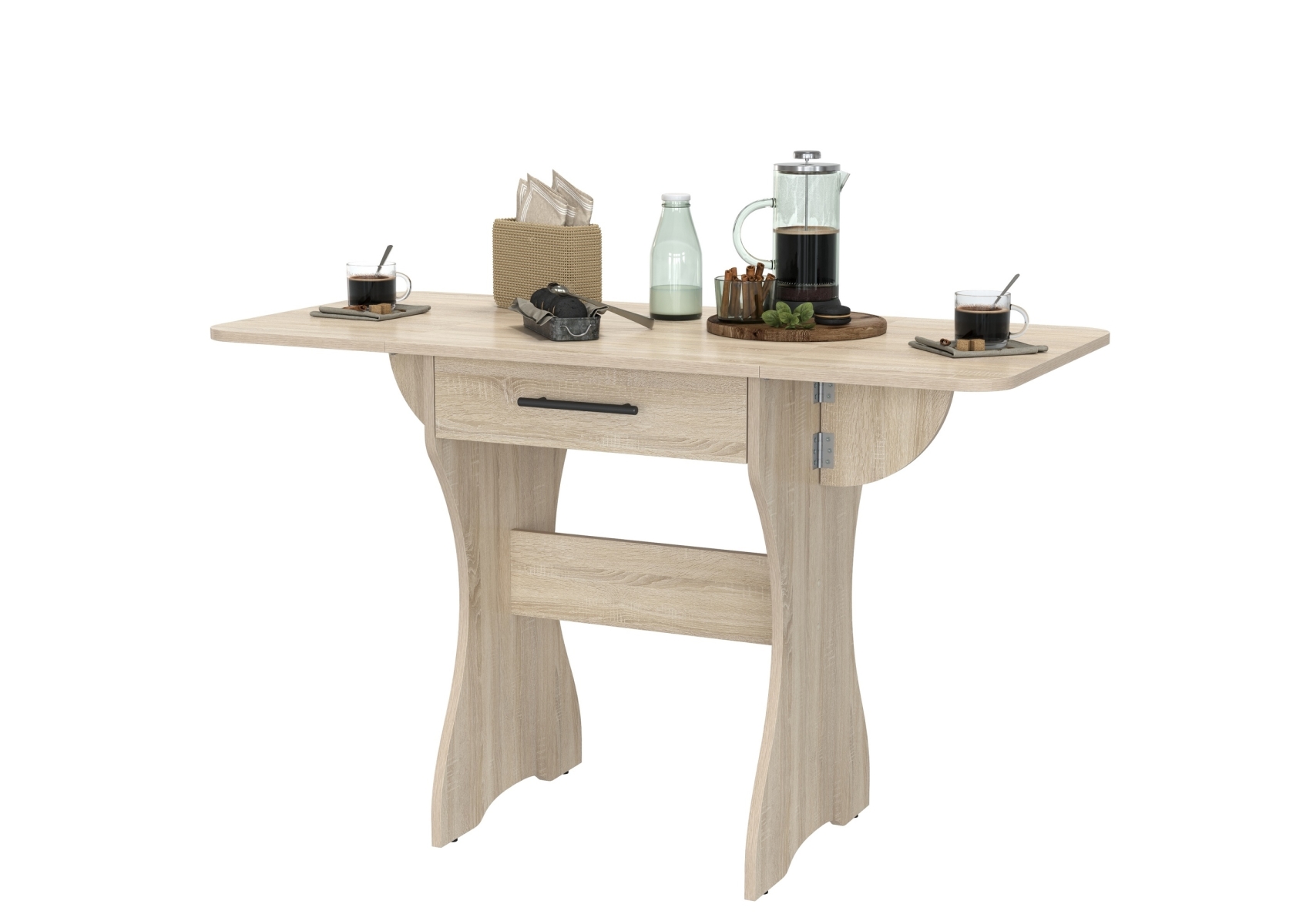 Стол раскладной с ящиком. Цвет - дуб сонома. Габариты (ШхГхВ) в разложенном виде - 120х57х75 см, в сложенном - 60х57х75 см. Конструкция стола имеет функциональную изюминку - боковые «крылья», позволяющие увеличить длину столешницы в 2 раза. Закругленные углы столешницы позволят избежать ненужных травм маленькими детками.