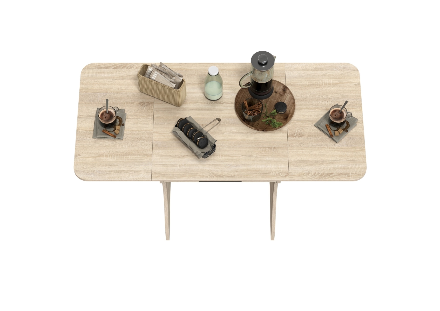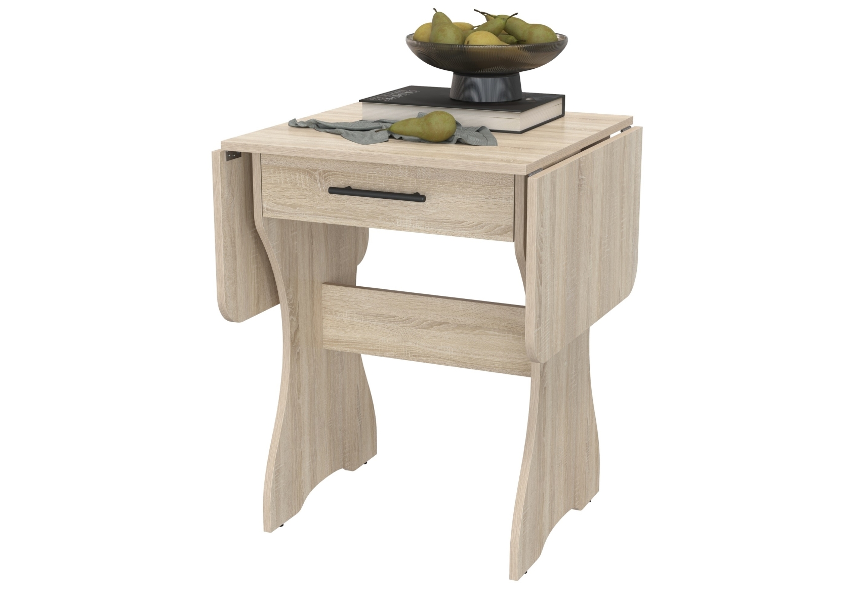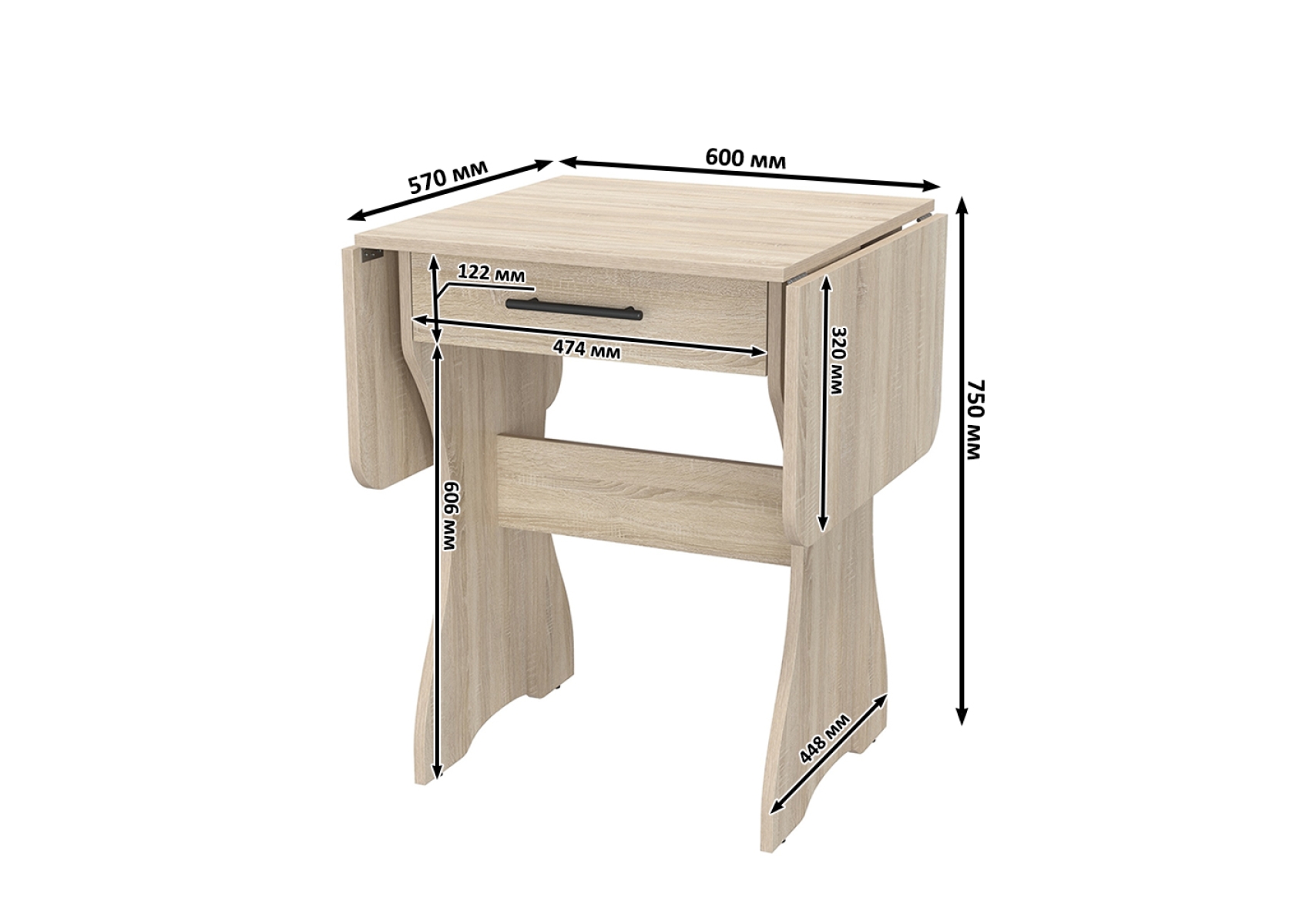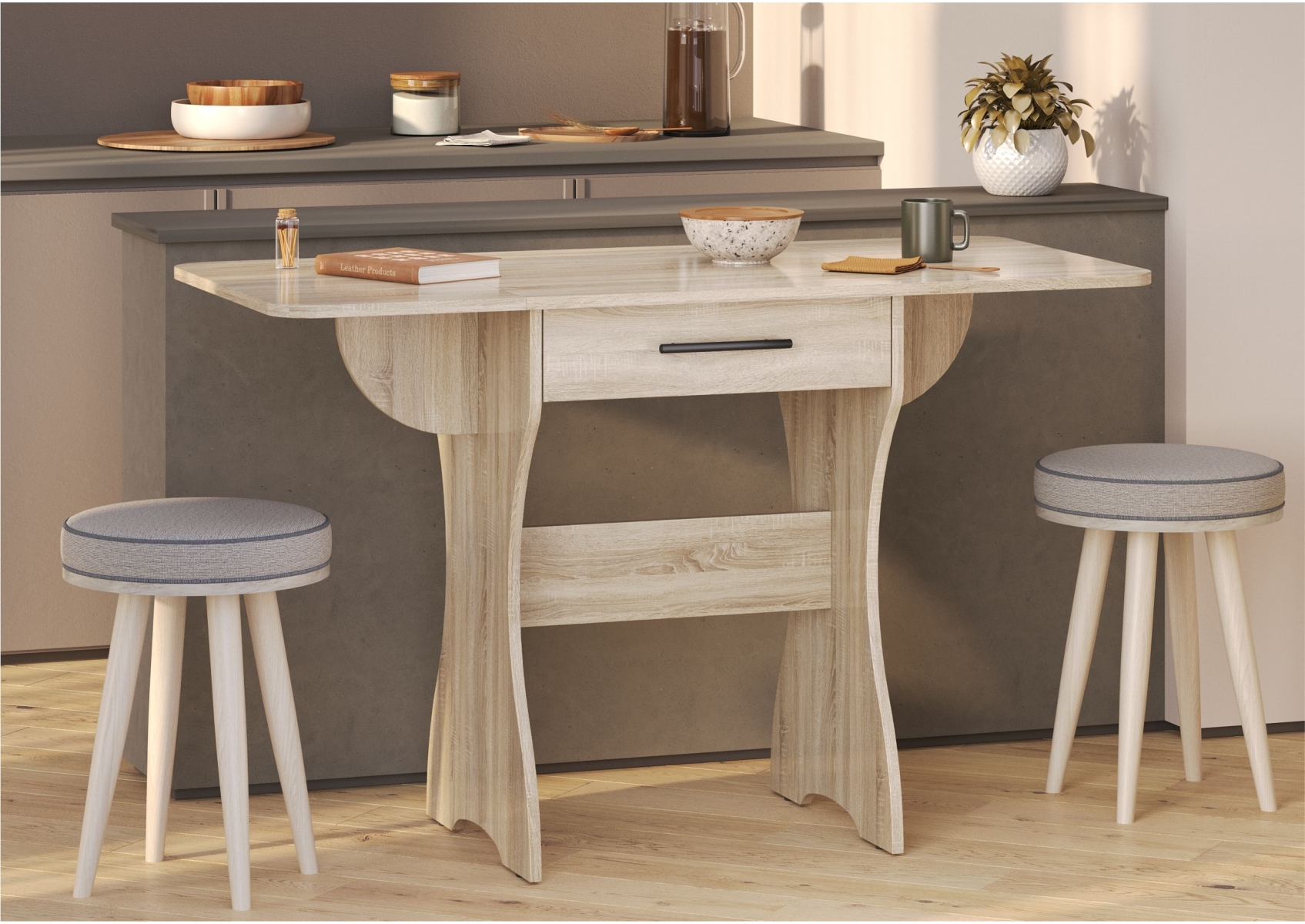 Стол раскладной с ящиком. Цвет - дуб сонома. Габариты (ШхГхВ) в разложенном виде - 120х57х75 см, в сложенном - 60х57х75 см. Конструкция стола имеет функциональную изюминку - боковые «крылья», позволяющие увеличить длину столешницы в 2 раза. Закругленные углы столешницы позволят избежать ненужных травм маленькими детками.