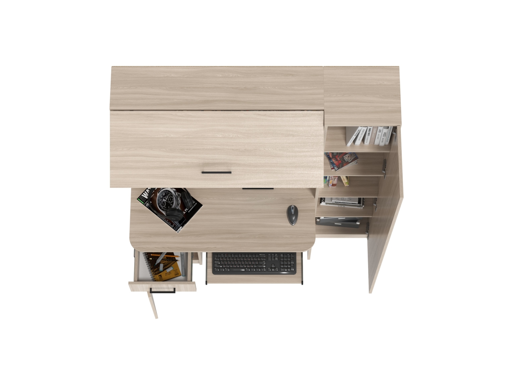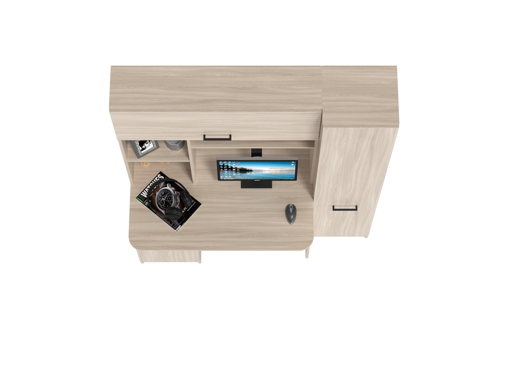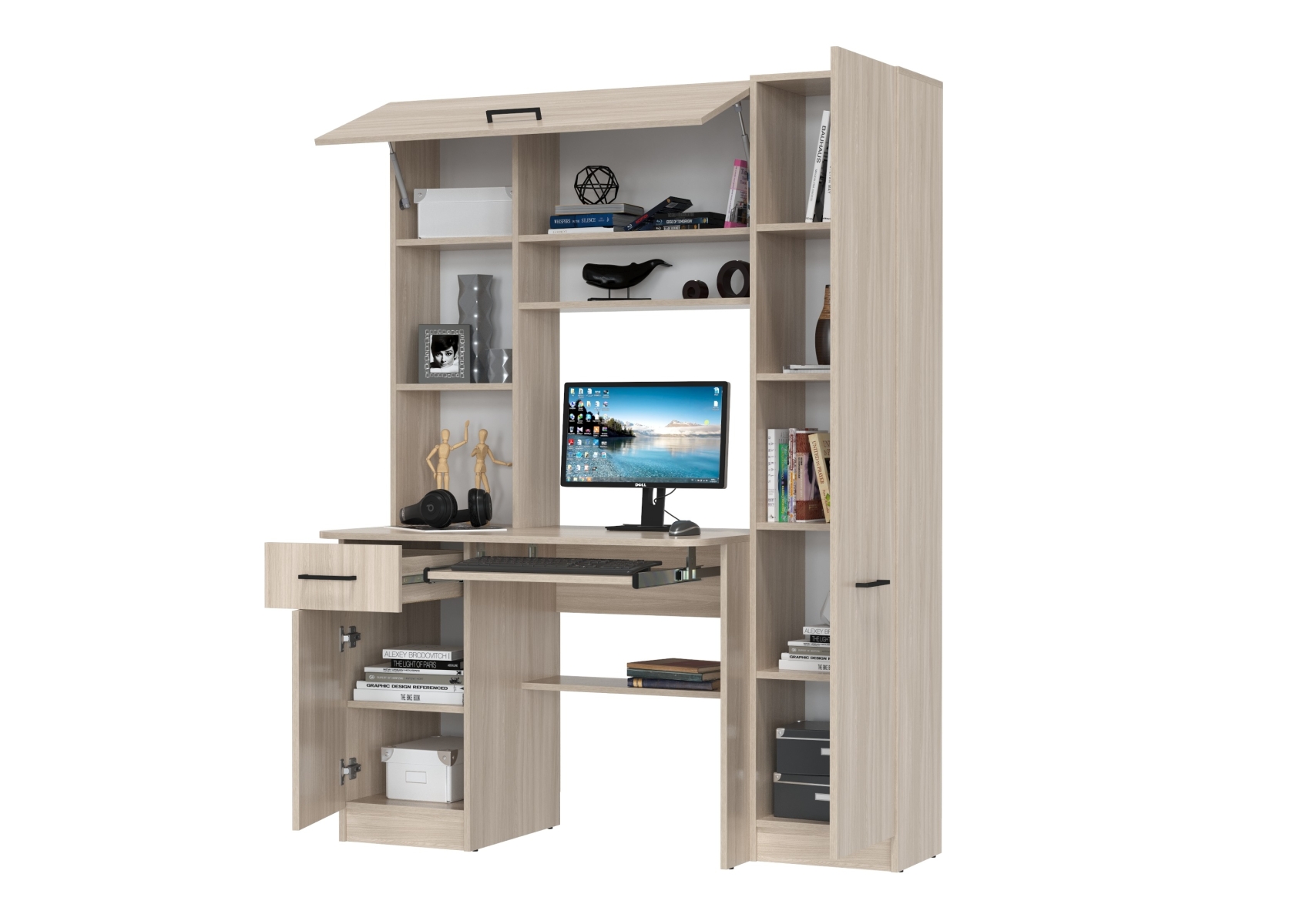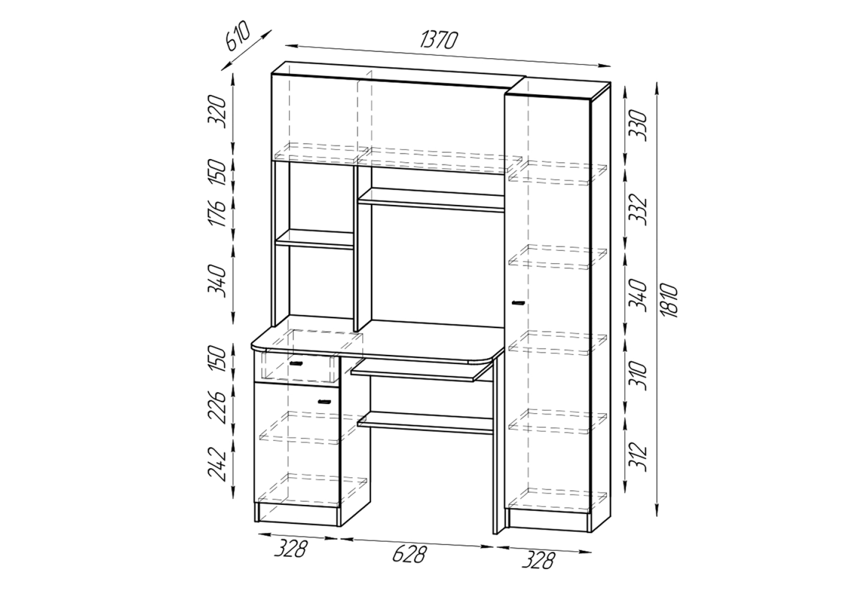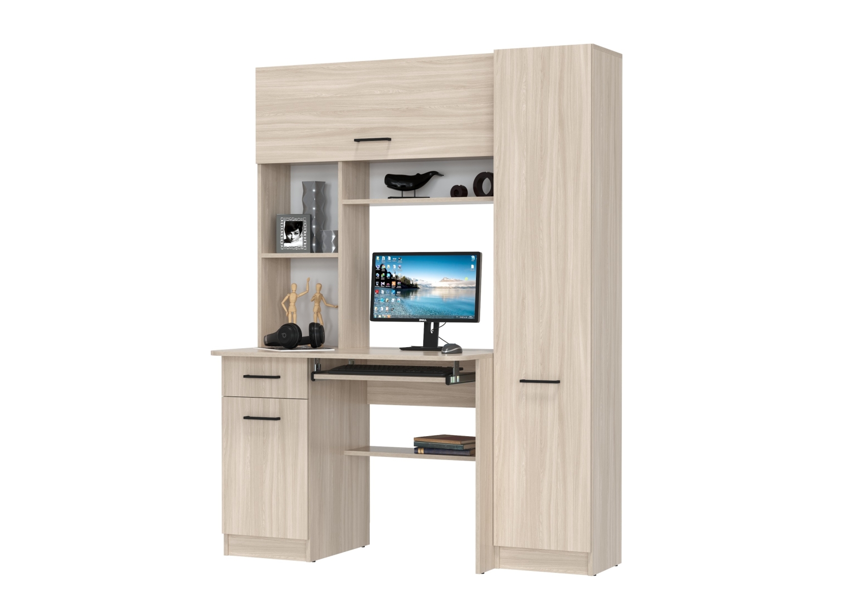 Стол рабочий Aльфа 6-0603. Цвет - ясень шимо светлый. Габариты - 137х61х181 см. Это универсальное и эргономичное рабочее место сочетает в себе однотумбовый компьютерный стол с надстройкой и пеналом. Универсальная схема сборки - тумбу и пенал можно разместить по Вашему усмотрению.