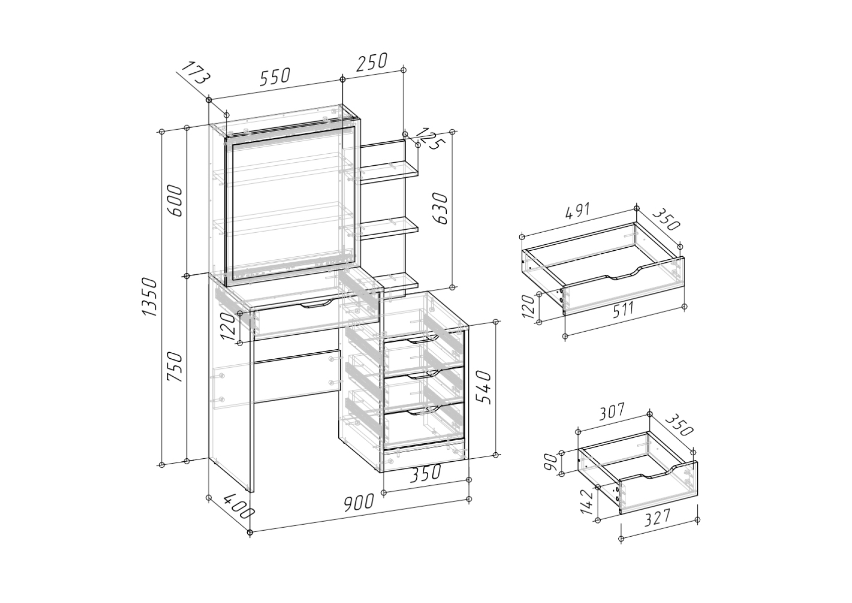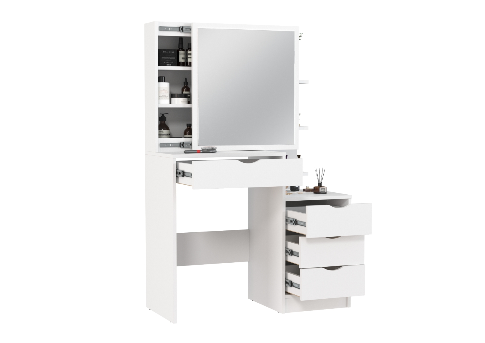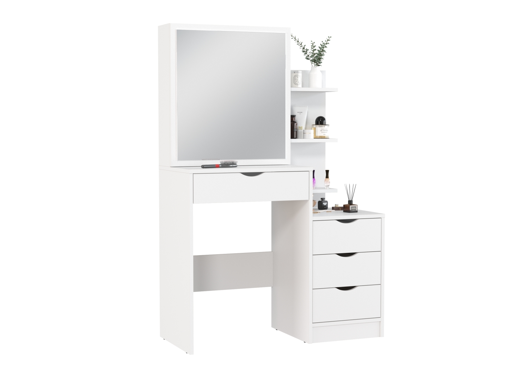 Белый туалетный столик 4-25911. Цвет - белый. Габариты (ШхГхВ) - 90х40,3х135 см. Зеркало прямоугольной формы закреплено на выдвижной панели, за которой находится отделение с двумя полочками для хранения. Под столешницей расположен широкий выдвижной ящик размером 491х350 мм. С правой стороны находится тумба с тремя выдвижными ящиками размером 307х350 мм каждый, над которой размещён стеллаж с тремя открытыми полками.