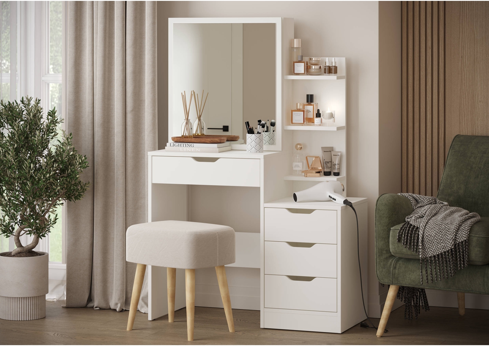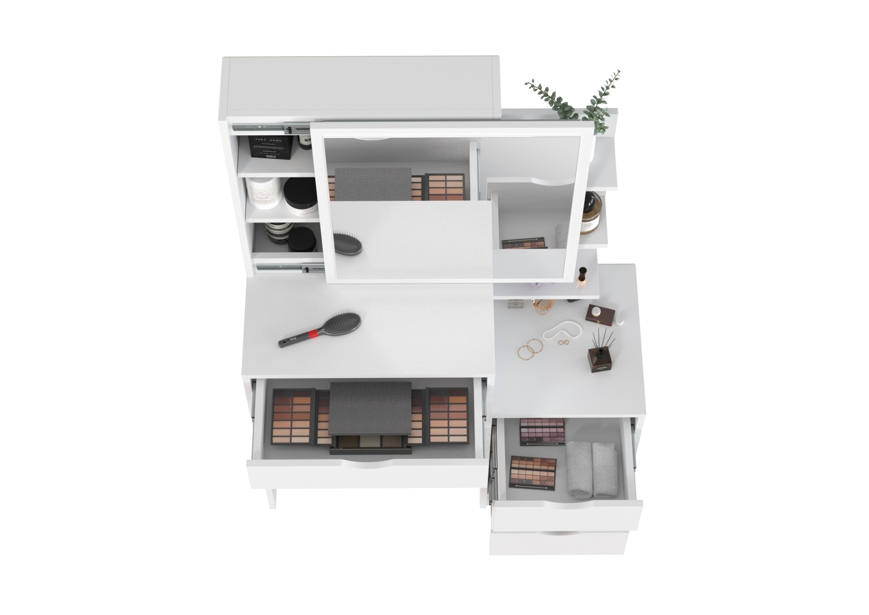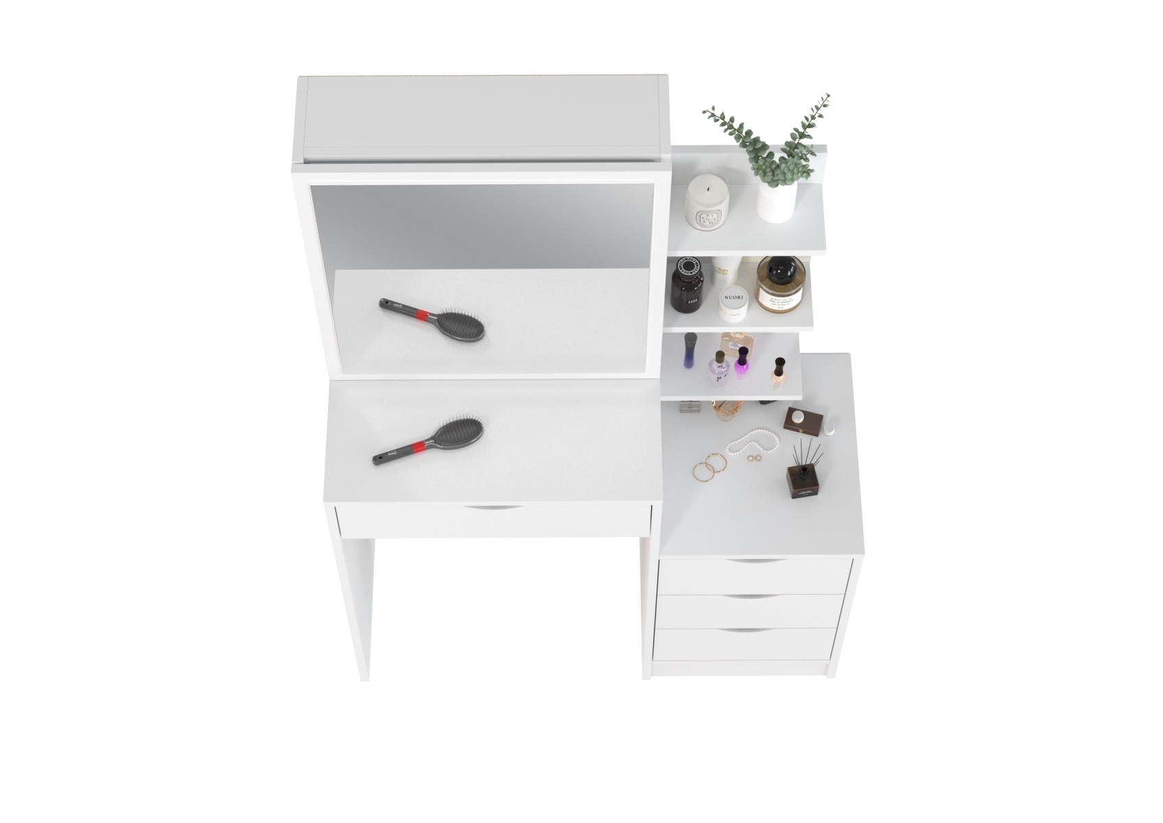 Белый туалетный столик 4-25911. Цвет - белый. Габариты (ШхГхВ) - 90х40,3х135 см. Зеркало прямоугольной формы закреплено на выдвижной панели, за которой находится отделение с двумя полочками для хранения. Под столешницей расположен широкий выдвижной ящик размером 491х350 мм. С правой стороны находится тумба с тремя выдвижными ящиками размером 307х350 мм каждый, над которой размещён стеллаж с тремя открытыми полками.