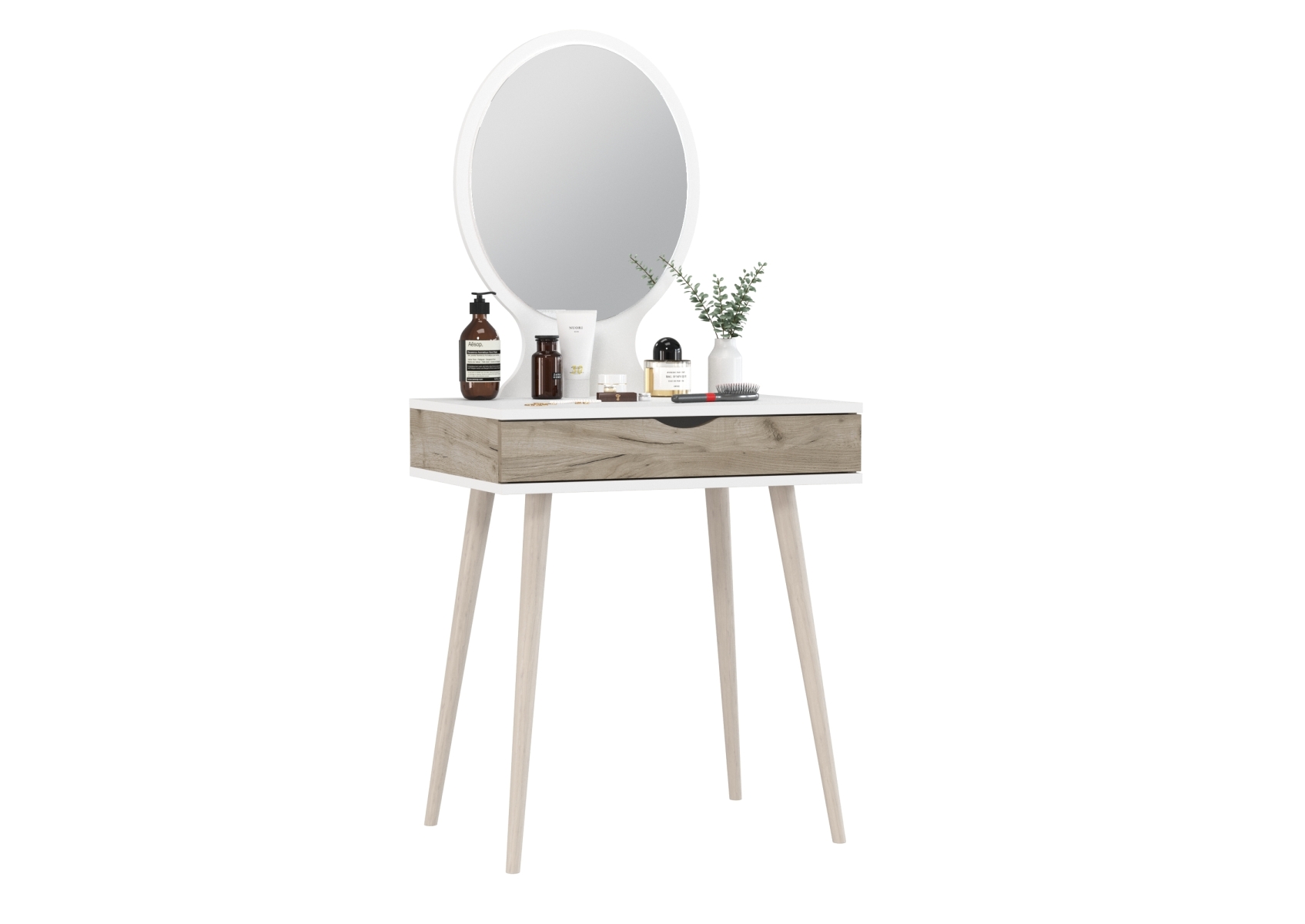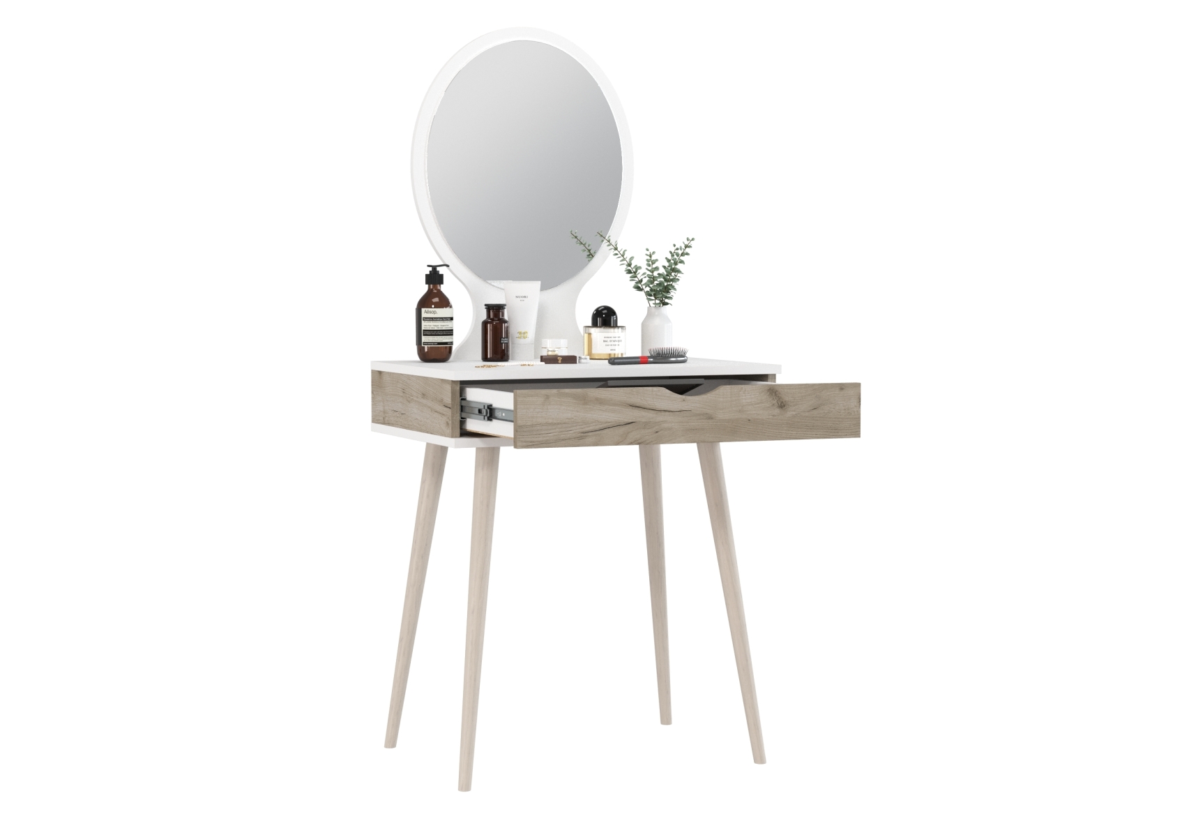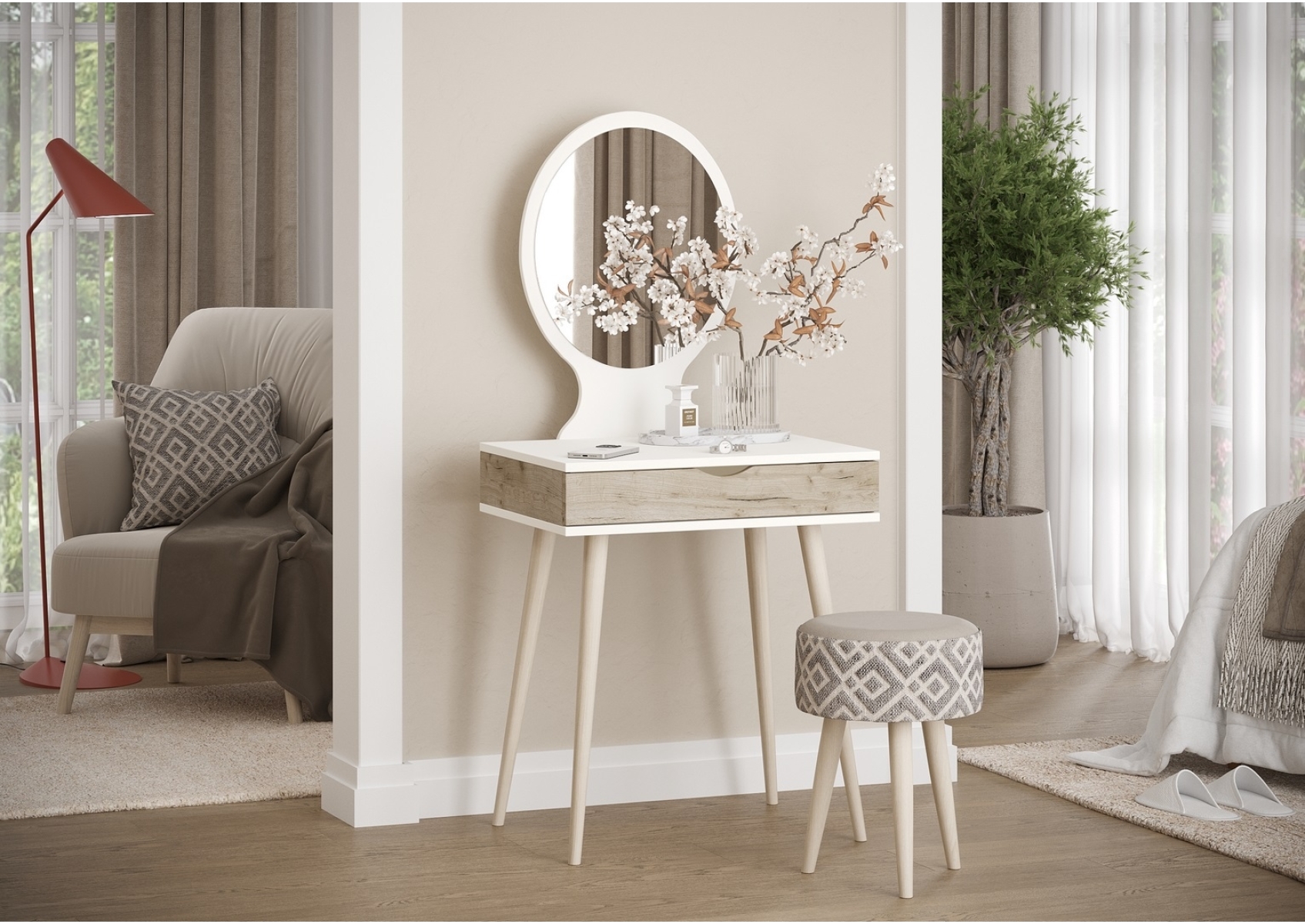 Трюмо 4-2591. Цвет - белый/дуб крафт серый. Габариты (ШхГхВ) - 62х46,6х134,5 см. Круглое зеркало с элегантными вогнутыми вырезами придаёт трюмо лёгкость и изысканность. Удобный выдвижной ящик на шариковых направляющих обеспечивает плавное и надёжное открывание. Ящик открывается за край фасада благодаря аккуратному вырезу сверху.