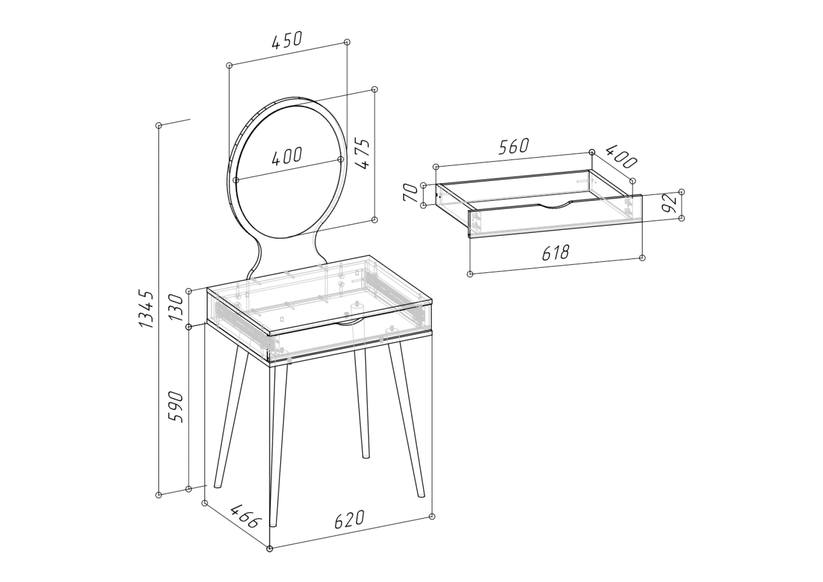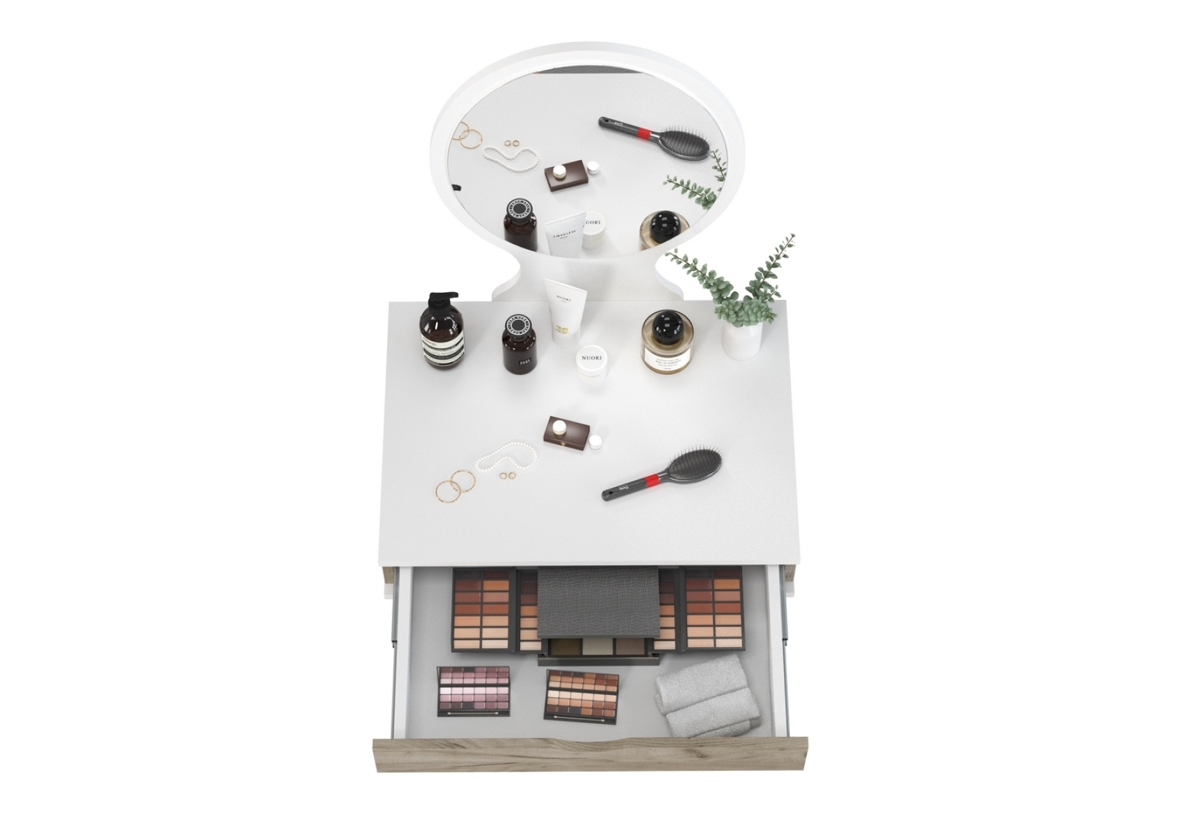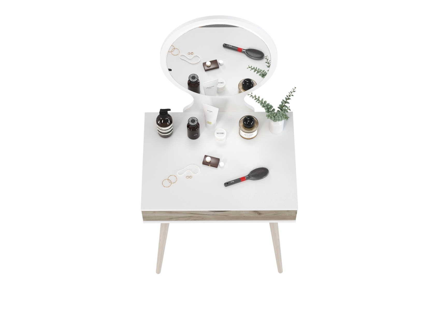 Трюмо 4-2591. Цвет - белый/дуб крафт серый. Габариты (ШхГхВ) - 62х46,6х134,5 см. Круглое зеркало с элегантными вогнутыми вырезами придаёт трюмо лёгкость и изысканность. Удобный выдвижной ящик на шариковых направляющих обеспечивает плавное и надёжное открывание. Ящик открывается за край фасада благодаря аккуратному вырезу сверху.