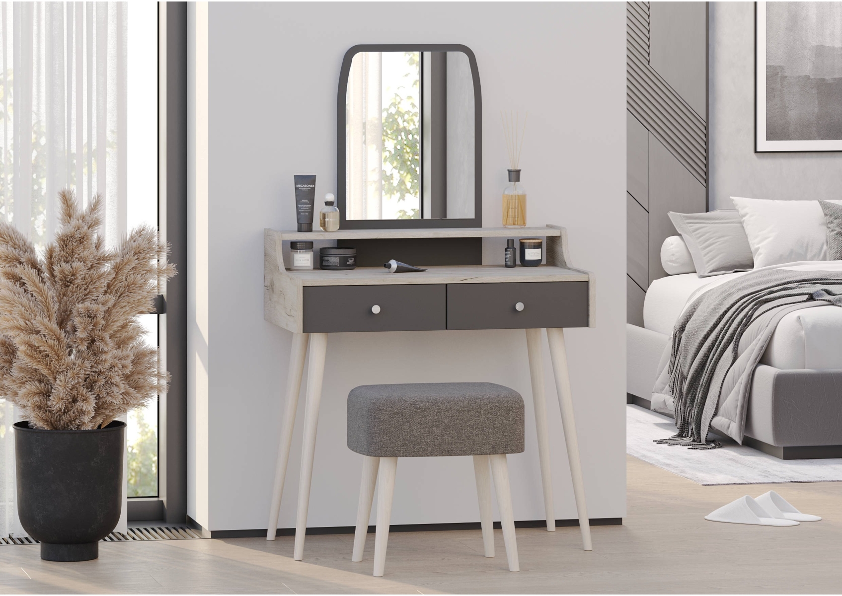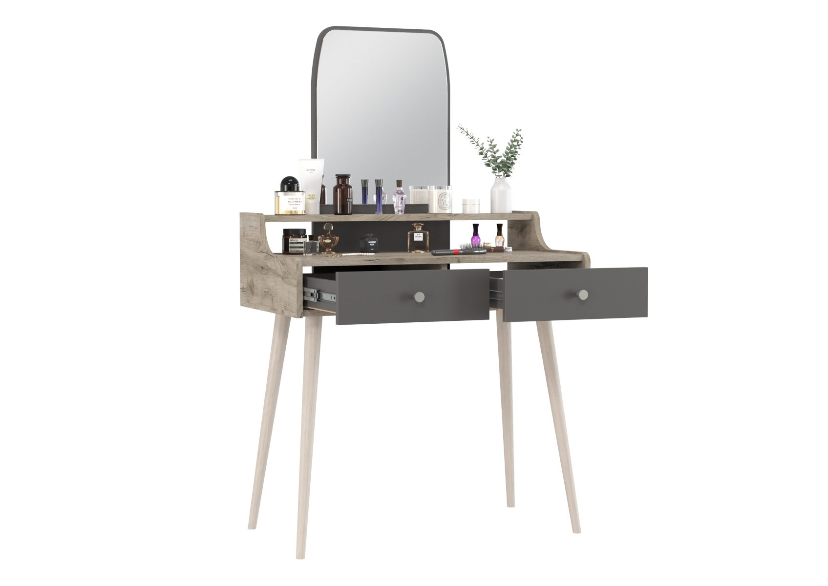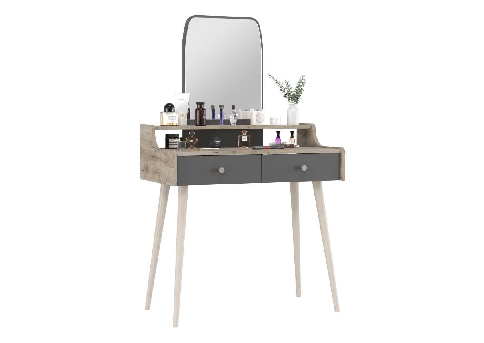 Трюмо с зеркалом и ящиками на ножках 4-25916. Цвет - дуб крафт серый/графит. Габариты (ШхГхВ) - 80х44,8х133 см. Прямоугольное зеркало с утончённым верхом расположено над надстройкой высотой 110 мм, выполненной по всей ширине столика. Фигурные боковины столика плавно переходят в надстройку, создавая цельный силуэт. Два выдвижных ящика размером 350х400 мм на шариковых направляющих