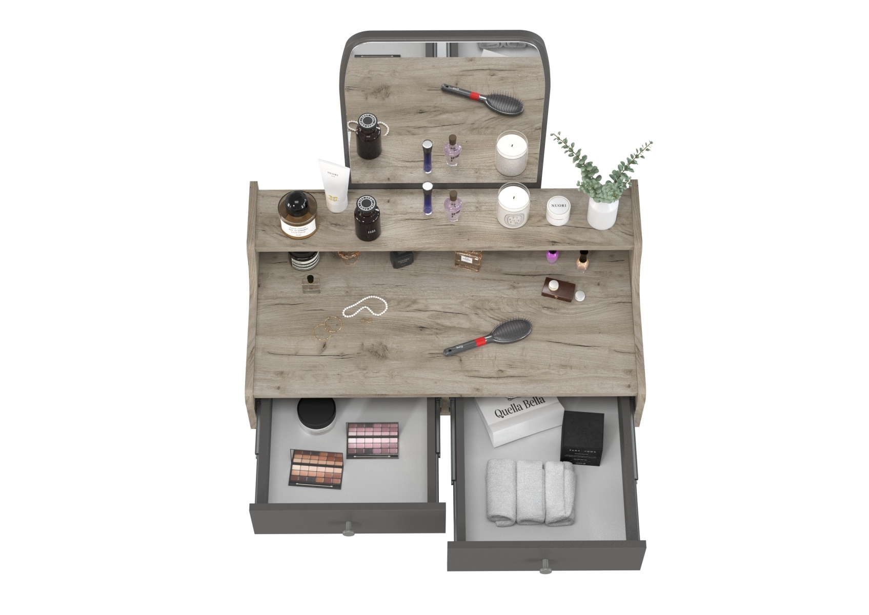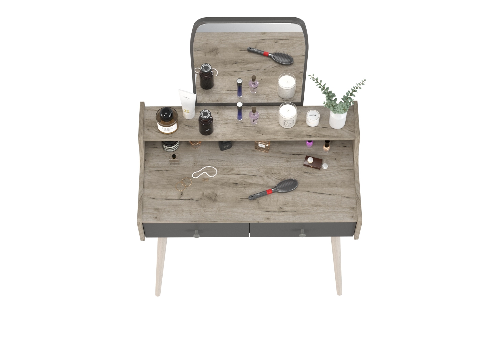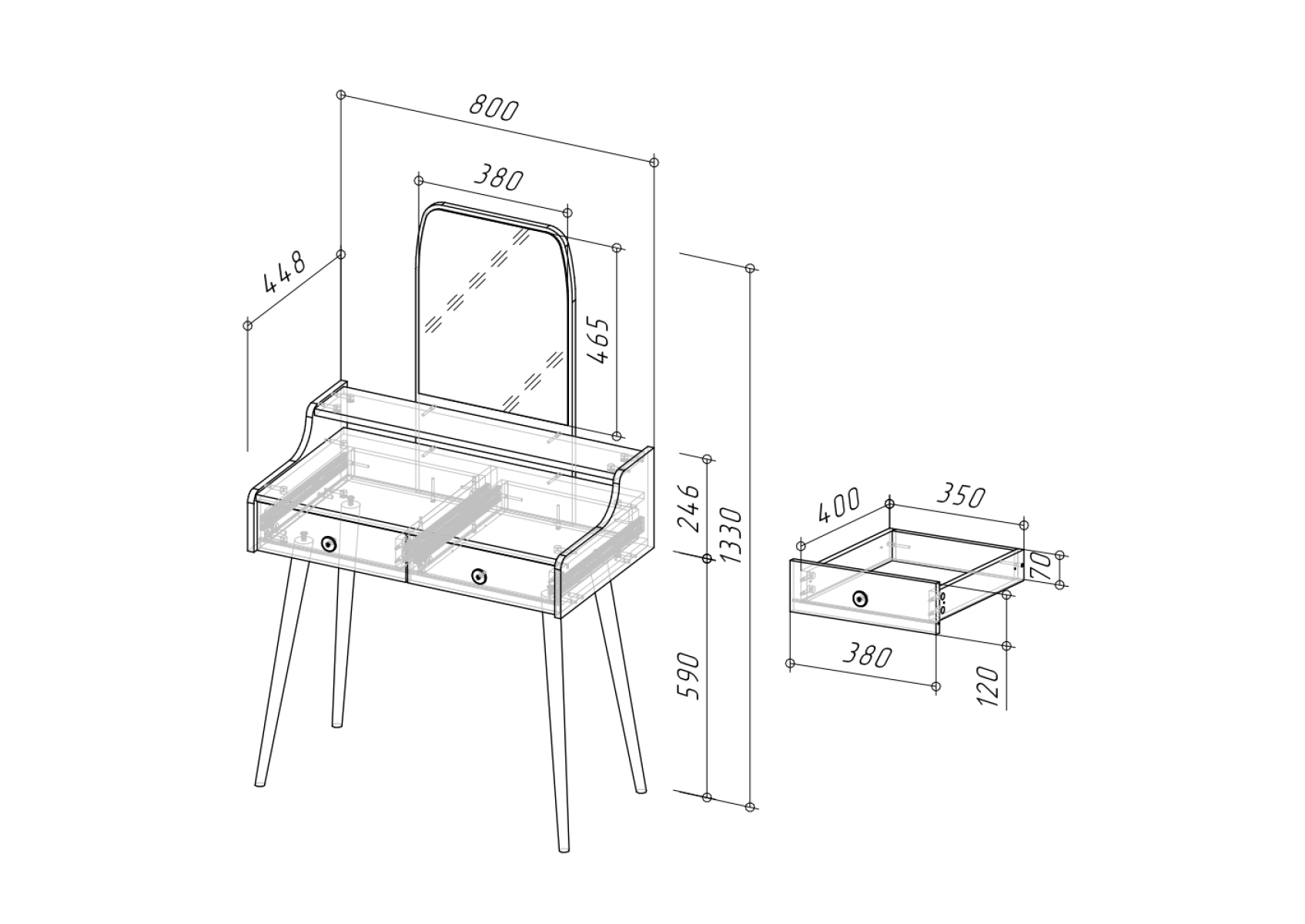 Трюмо с зеркалом и ящиками на ножках 4-25916. Цвет - дуб крафт серый/графит. Габариты (ШхГхВ) - 80х44,8х133 см. Прямоугольное зеркало с утончённым верхом расположено над надстройкой высотой 110 мм, выполненной по всей ширине столика. Фигурные боковины столика плавно переходят в надстройку, создавая цельный силуэт. Два выдвижных ящика размером 350х400 мм на шариковых направляющих