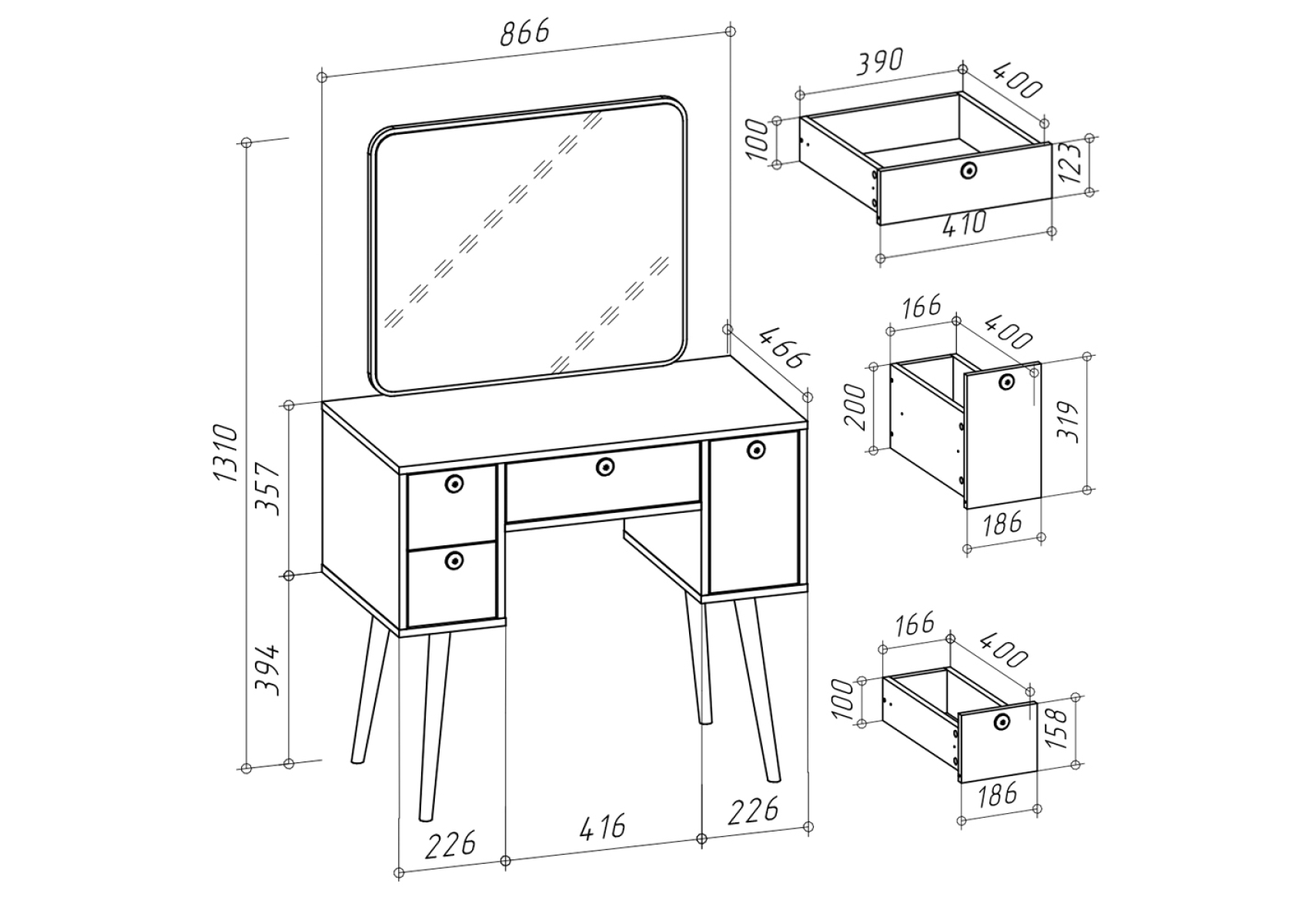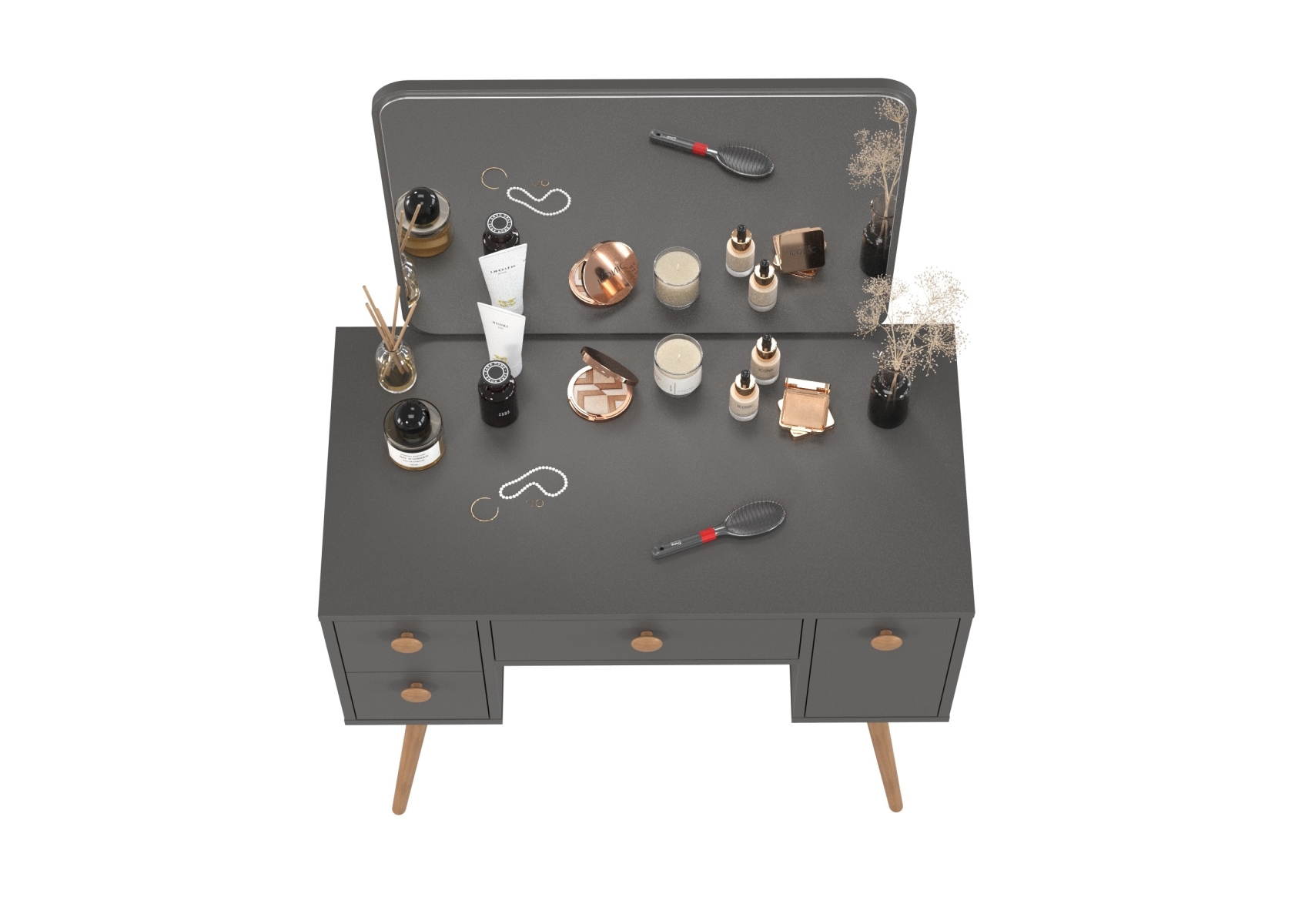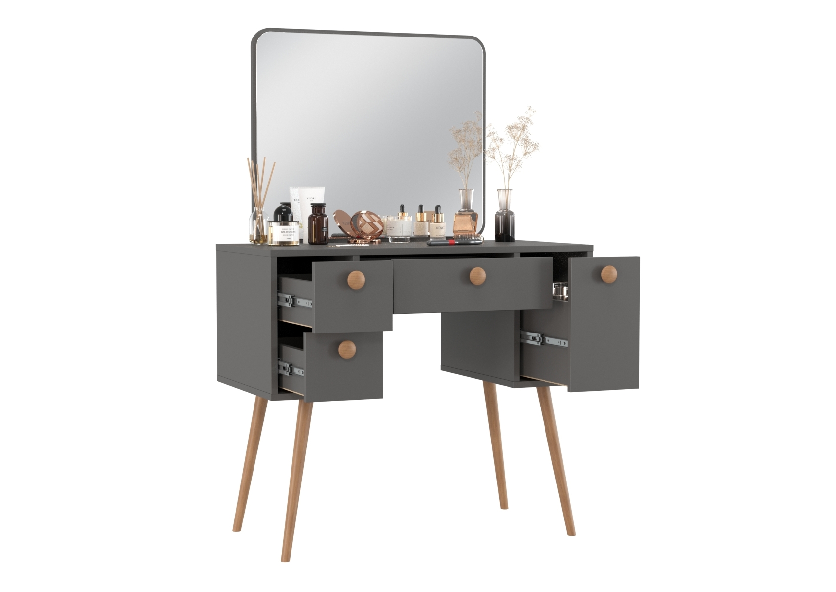 Трюмо в спальню в лофт стиле 4-25919. Цвет - графит. Габариты (ШхГхВ) - 86,6х46,6х131 см. Большое зеркало размером 650х540 мм расположено на широкой столешнице. Под столешницей находятся четыре выдвижных ящика - по центру — ящик размером 390х400 мм, слева — глубокий ящик размером 166х400 мм, справа — два компактных ящика размером 166х400 мм каждый.