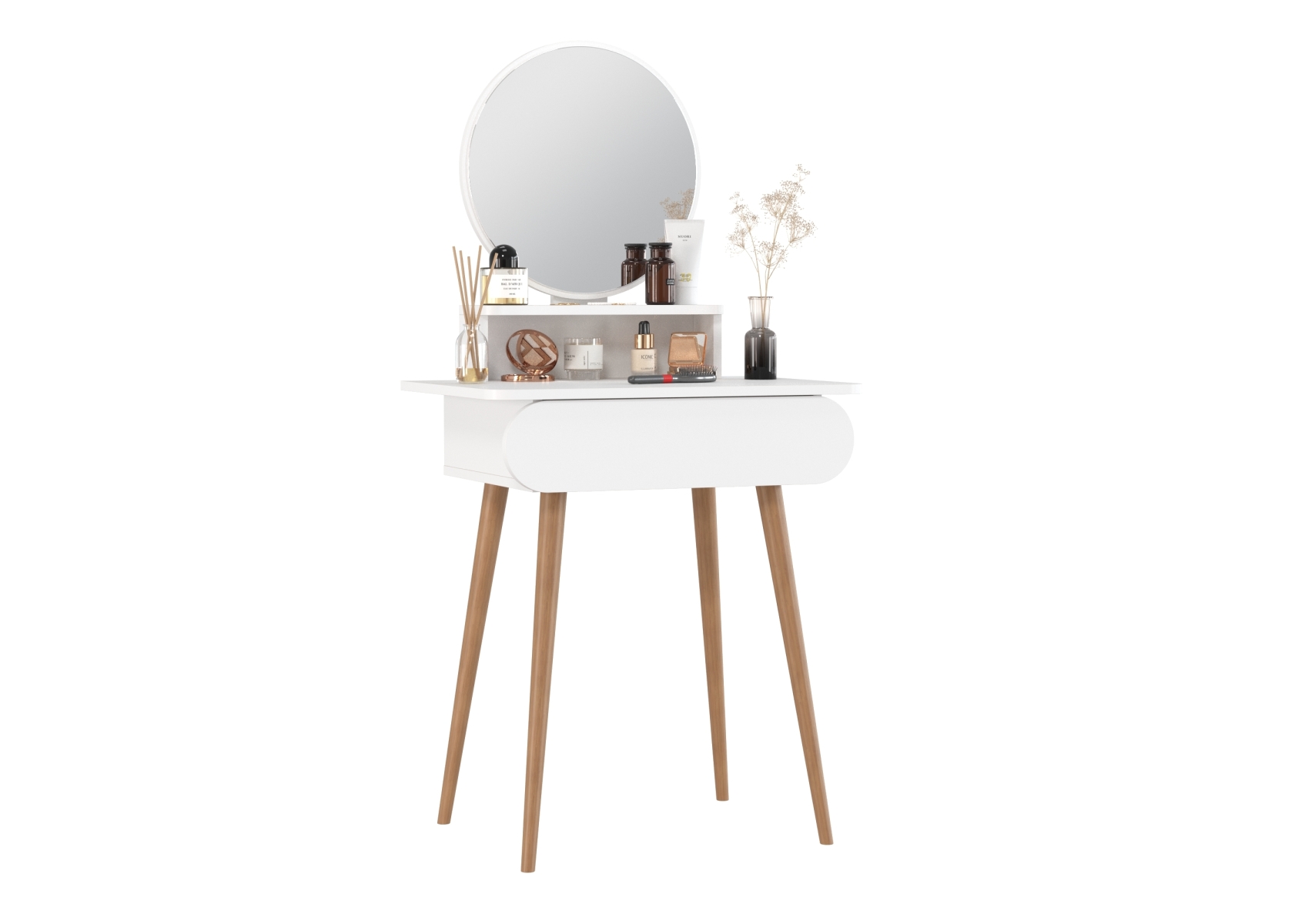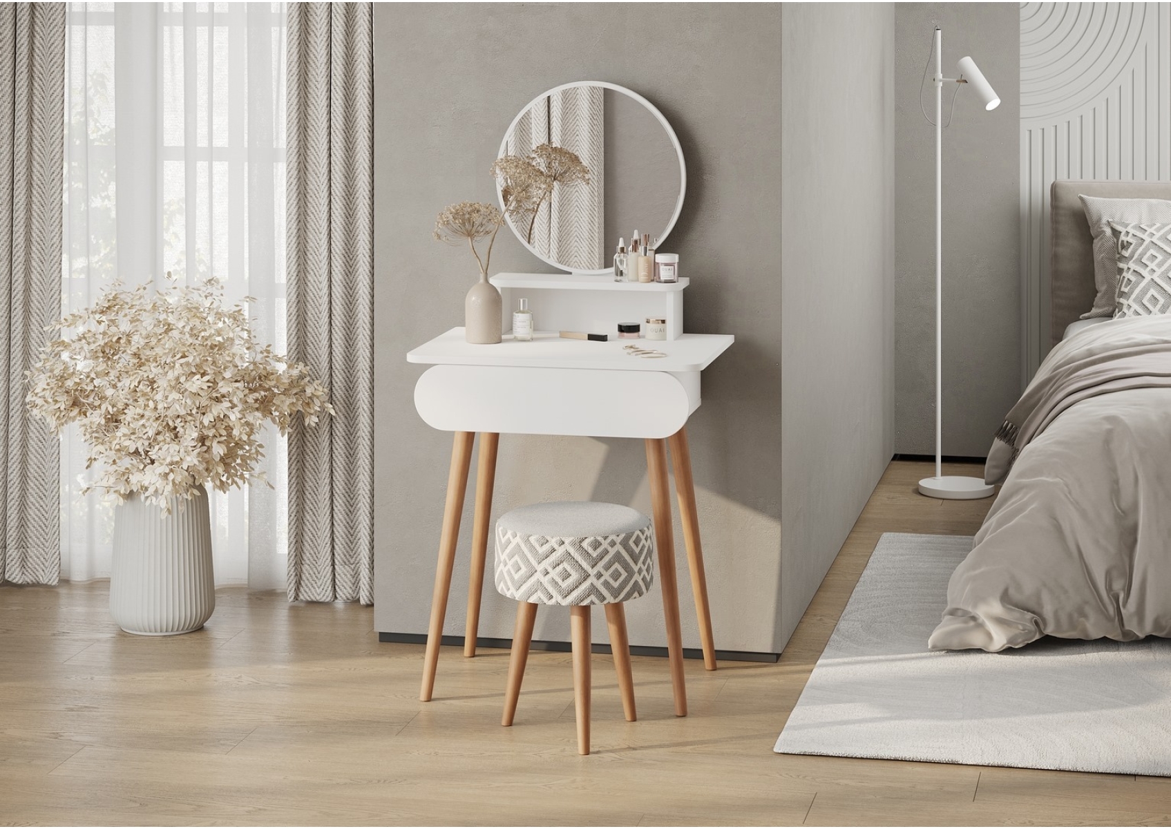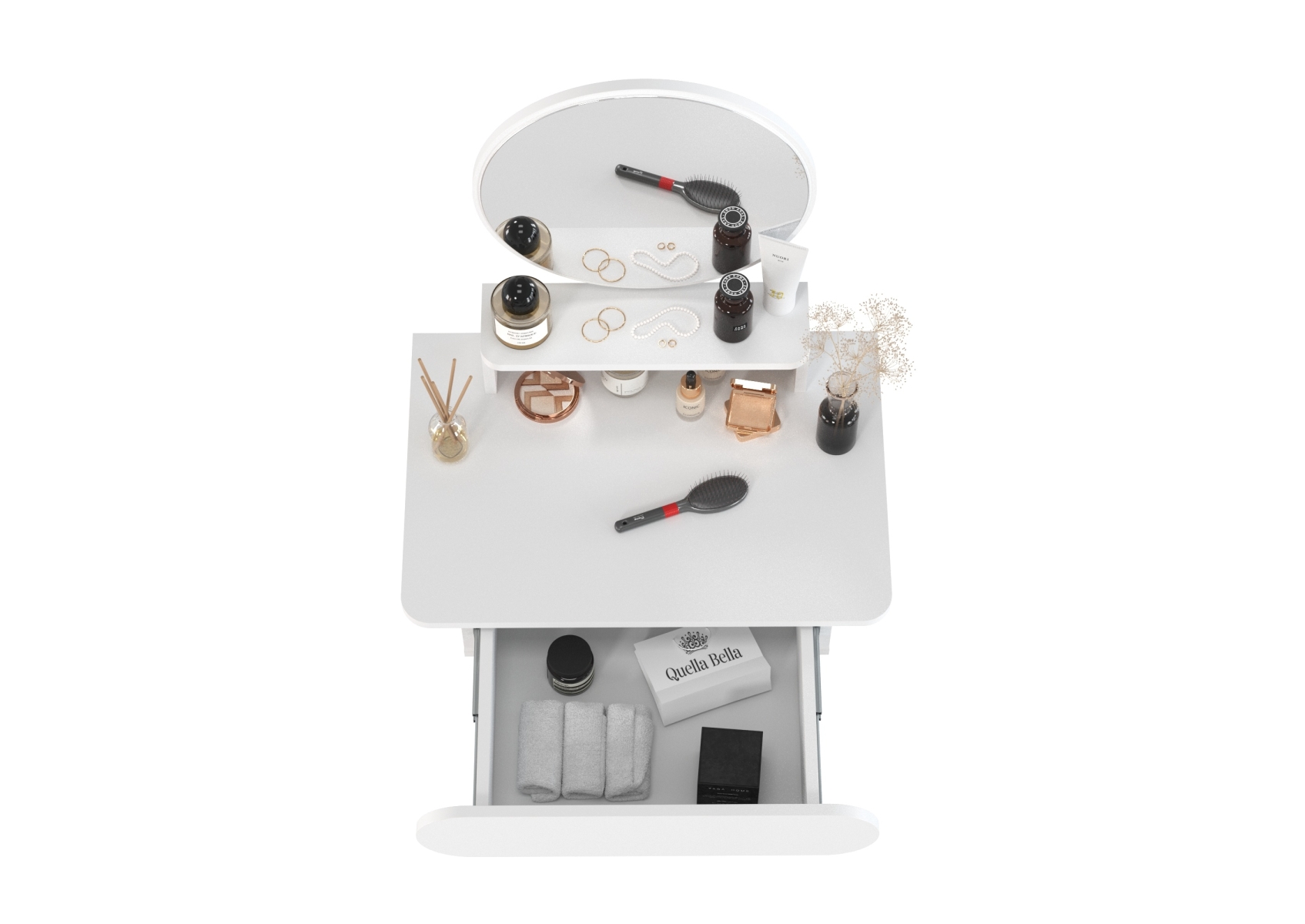 Трюмо белое воздушное 4-25920. Цвет - белый. Габариты (ШхГхВ) - 65х46,6х132 см. Круглое зеркало на изящной надстройке высотой 126 мм визуально облегчает конструкцию и подчёркивает воздушность модели. Широкий выдвижной ящик размером 440х400 мм на шариковых направляющих обеспечивает удобное хранение мелочей. Фасад ящика овальной формы, открытие происходит за край фасада без ручек.