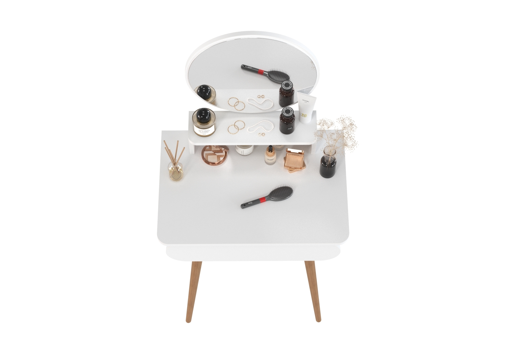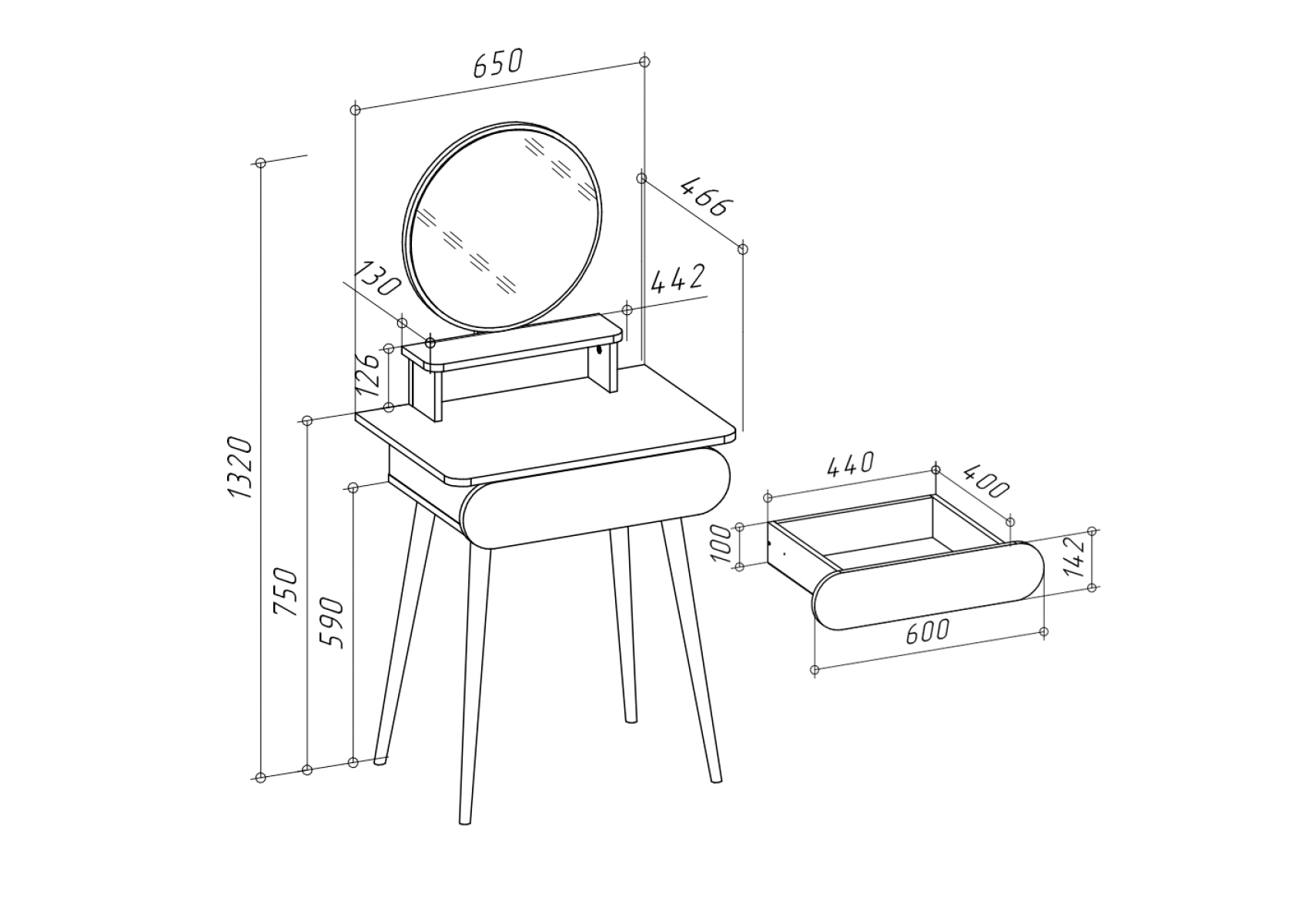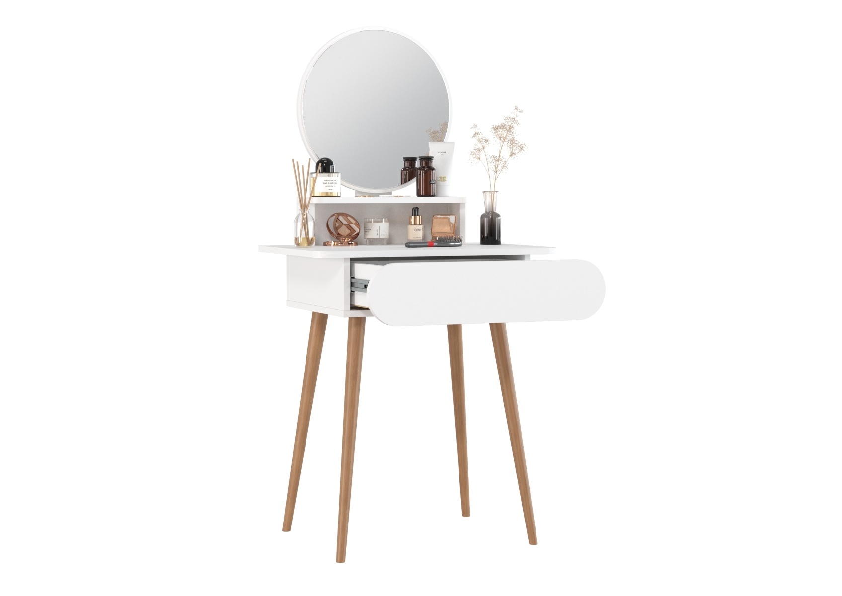 Трюмо белое воздушное 4-25920. Цвет - белый. Габариты (ШхГхВ) - 65х46,6х132 см. Круглое зеркало на изящной надстройке высотой 126 мм визуально облегчает конструкцию и подчёркивает воздушность модели. Широкий выдвижной ящик размером 440х400 мм на шариковых направляющих обеспечивает удобное хранение мелочей. Фасад ящика овальной формы, открытие происходит за край фасада без ручек.