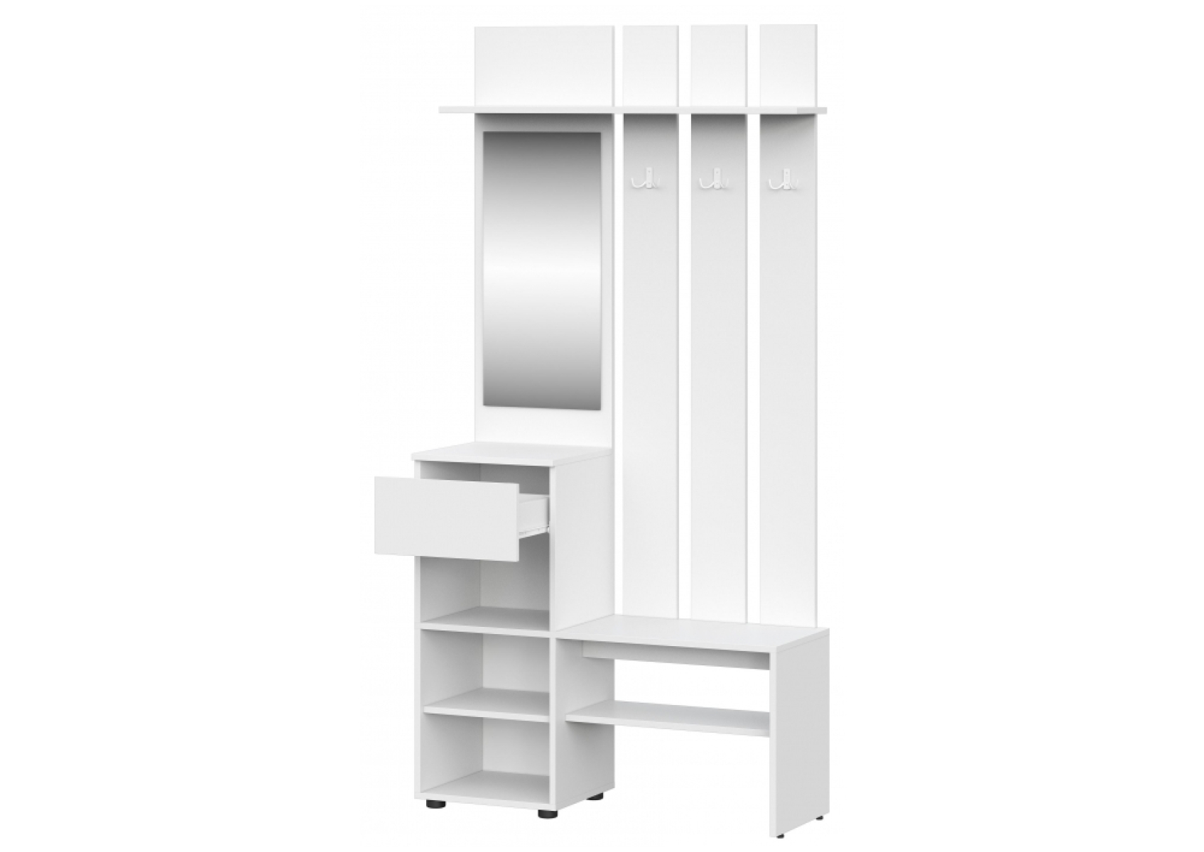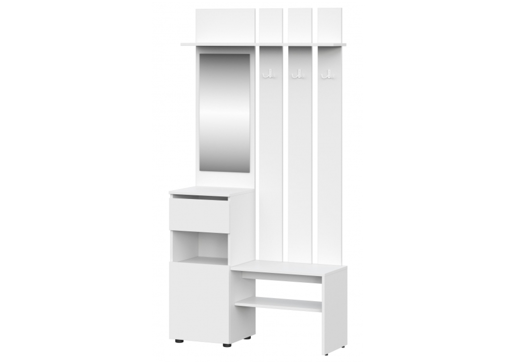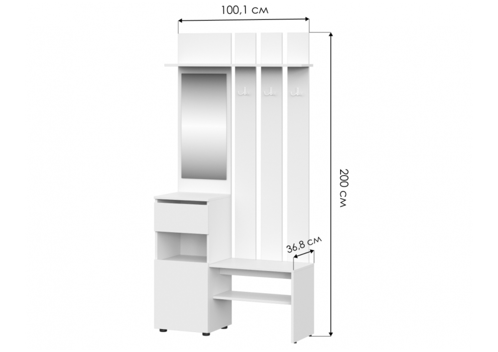 Готовая прихожая Валенсия - это практичное и функциональное решение для обустройства прихожей. Она включает в себя зеркало, которое располагается над шкафчиком с выдвижным ящиком и небольшой полкой. Это позволяет удобно хранить мелкие вещи, такие как ключи, кошельки и мобильные телефоны, а также сделать макияж или прическу перед выходом из дома.