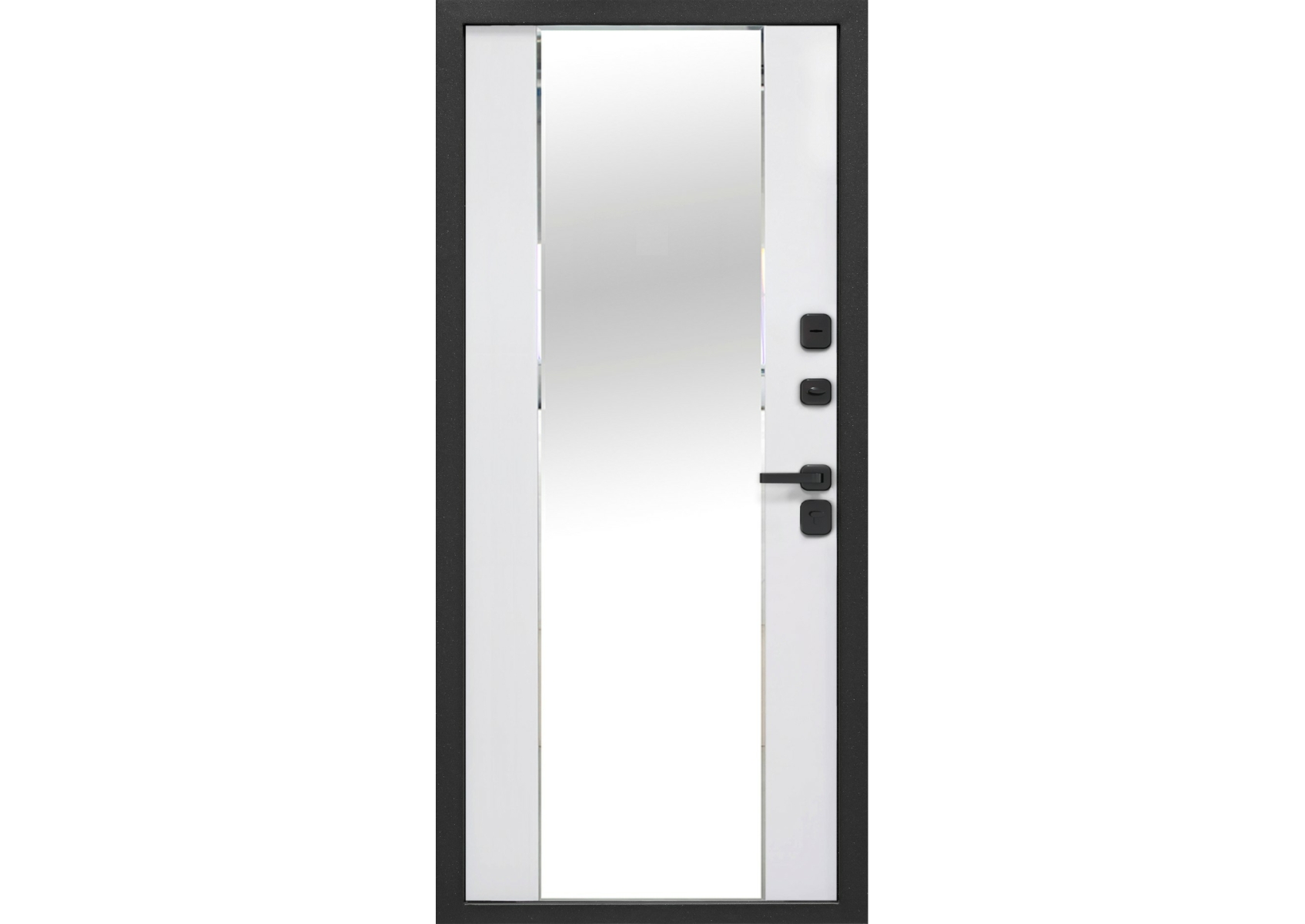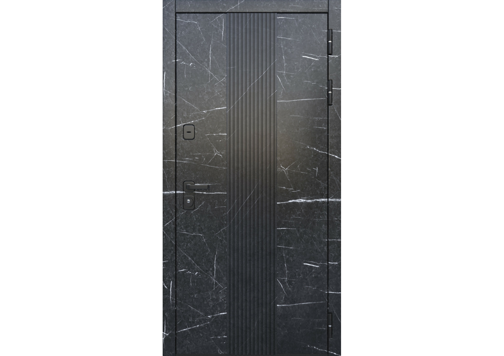 Металл: Порошково-полимерное покрытие, цвет Муар с блестками 9005Отделка снаружи: Лист стали + ламинированная МДФ панель 12 мм, вставка цвет Антрацит софт, цвет панели Мрамор графитовый