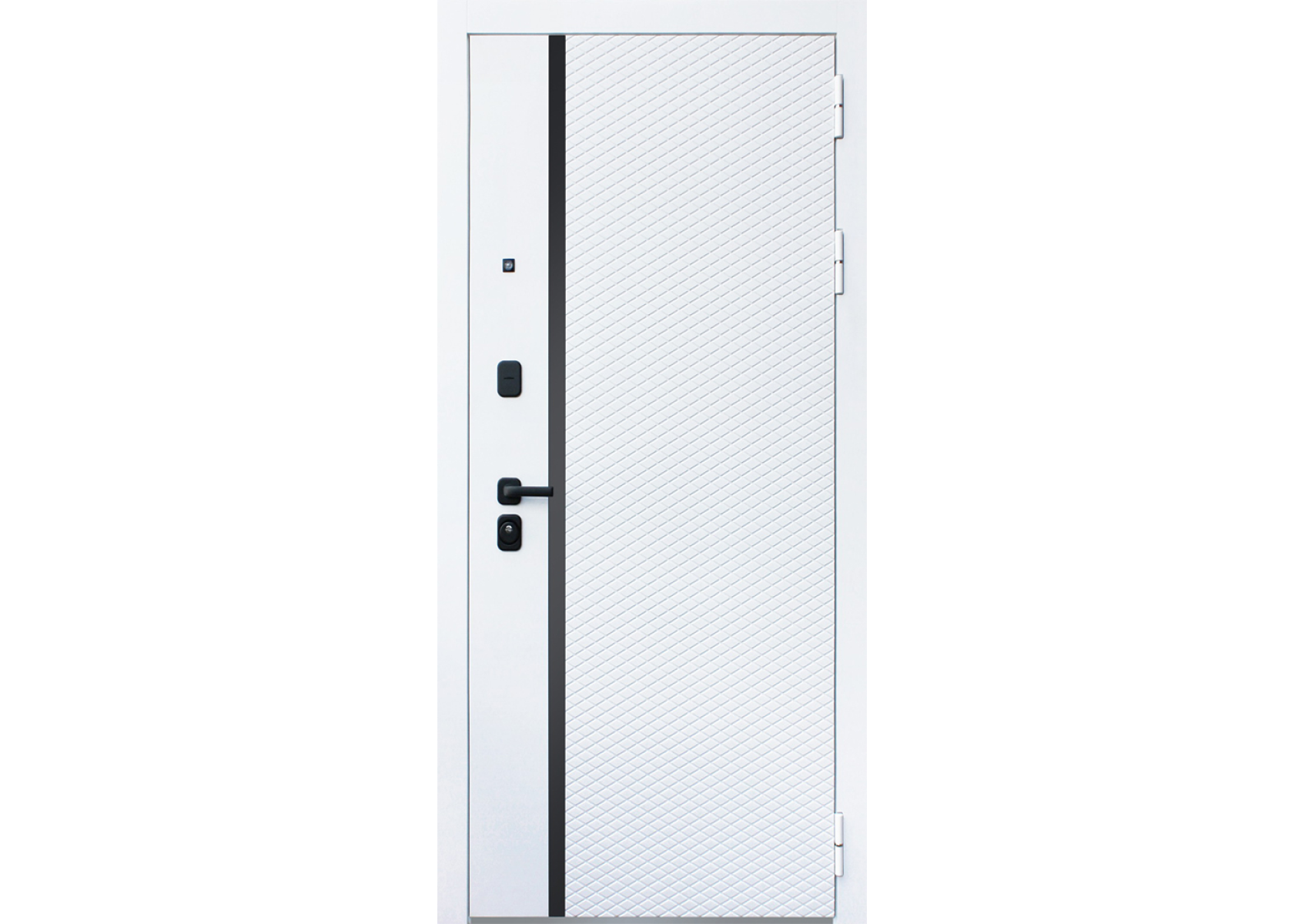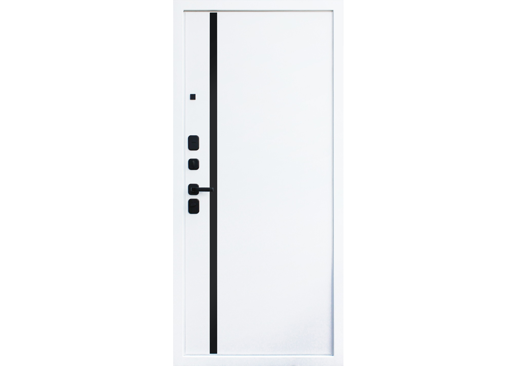 Экошпонированная панель МДФ 10 мм. с объемной фрезеровкой, (цвет «Белый матовый»), вставка из черной лакобели, наружный лист металла 1,5 мм. гладкий МДФ 8 мм;