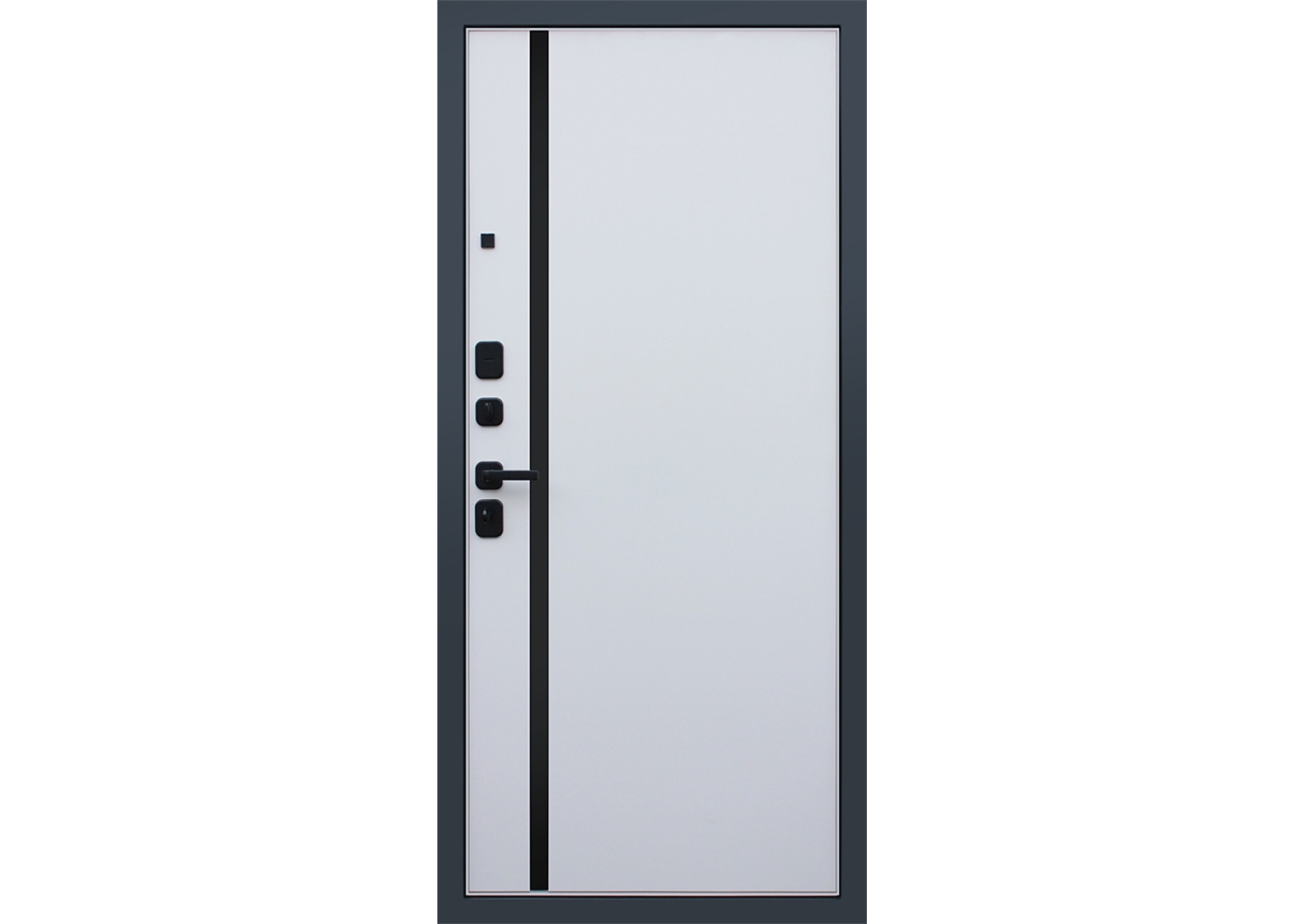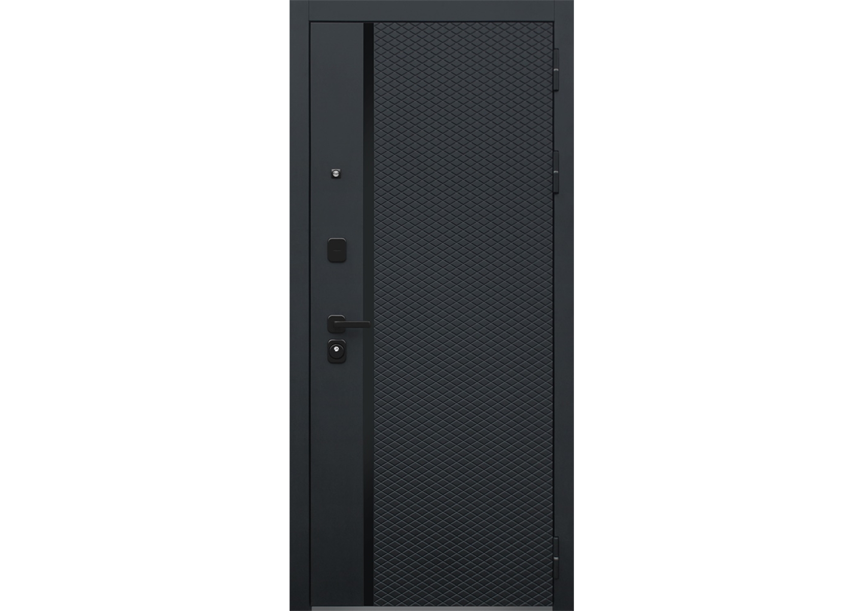 Экошпон.Наружный лист металла 1,5 мм. Дизайн панели ФЛС СО ВСТАВКОЙ ЧЕРНАЯ ЛАКОБЕЛЬ Объемная фрезеровка МДФ 10 мм, цвет «Черный кварц»; Наличник МДФ 80 мм, гладкие